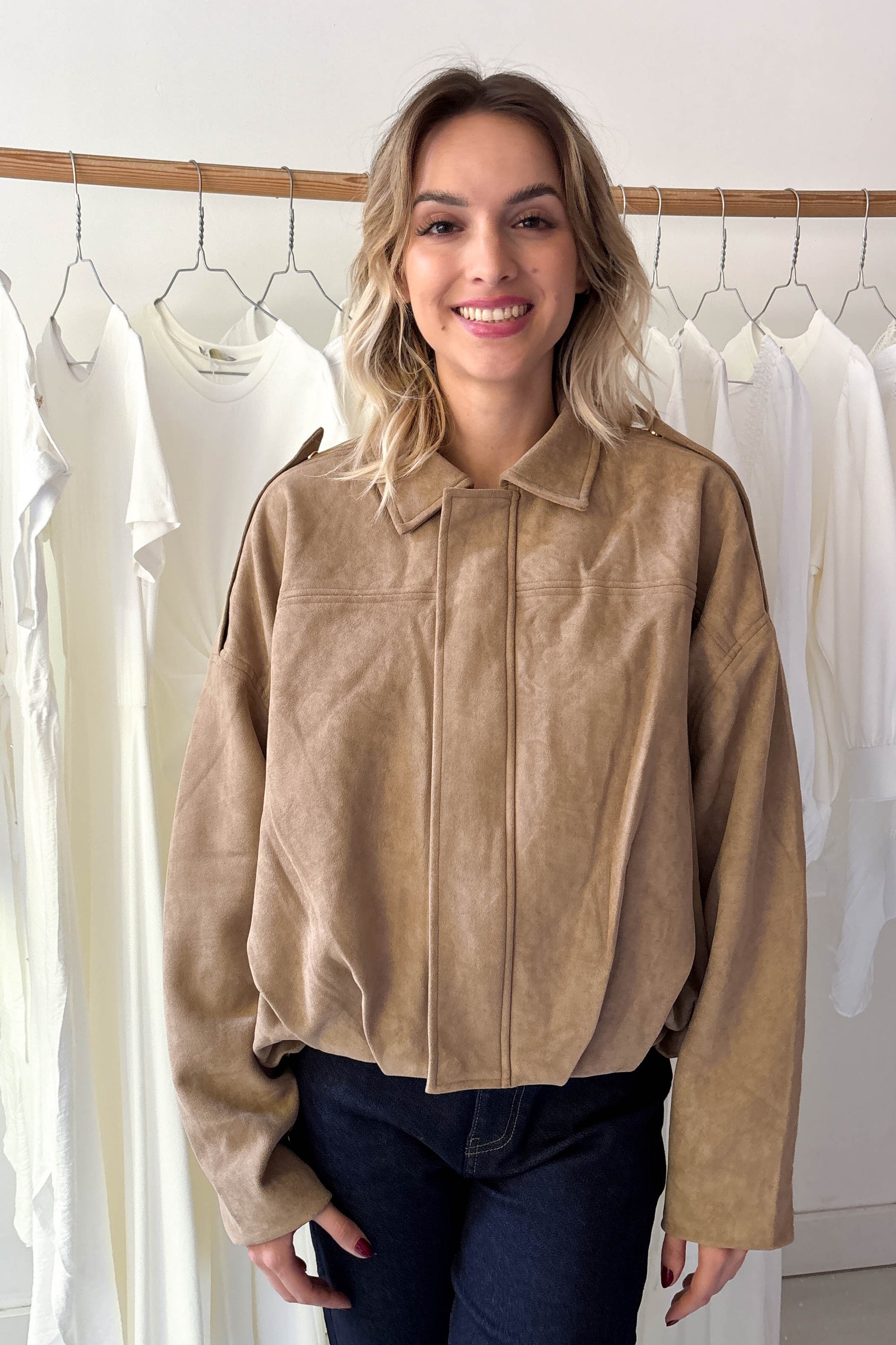 Alul hajtásos, buggyos bomber dzseki. Denevérujjú, vállpántos fazon. Elől cipzárral és patenttal záródik.