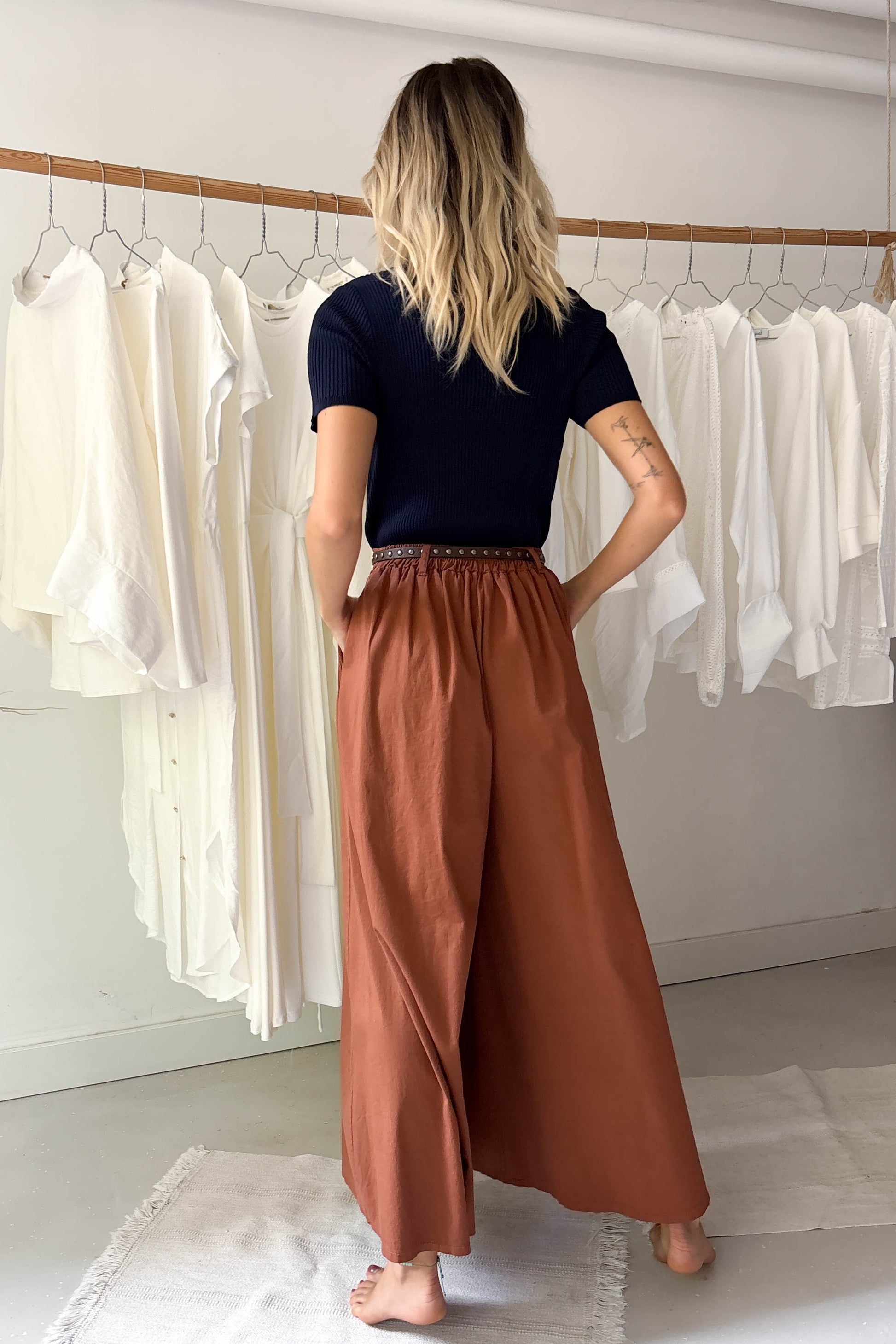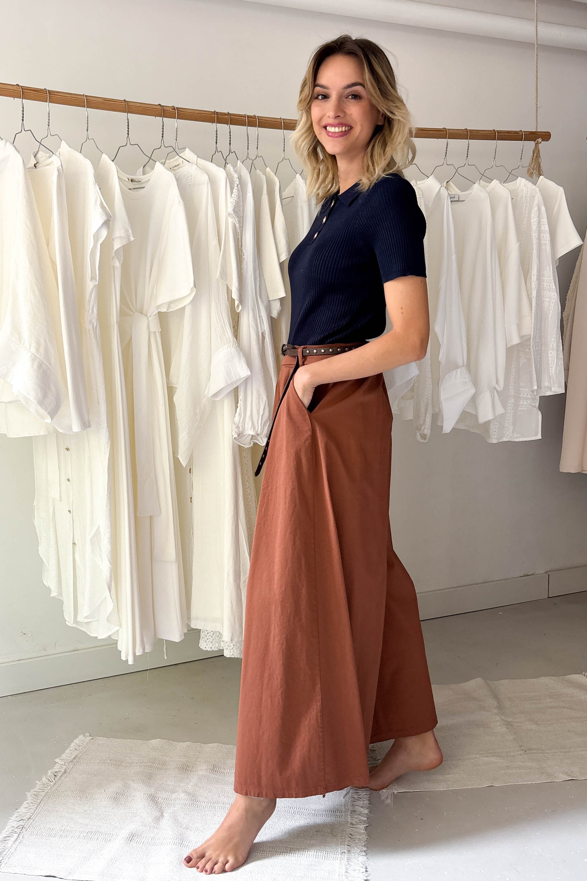 Bővülő szárú, rövidebb fazonú hosszúnadrág terrakotta színben. Övvel ellátott, zsebes fazon. Derékrészen elől hajtásos, hátul gumírozott szabás.