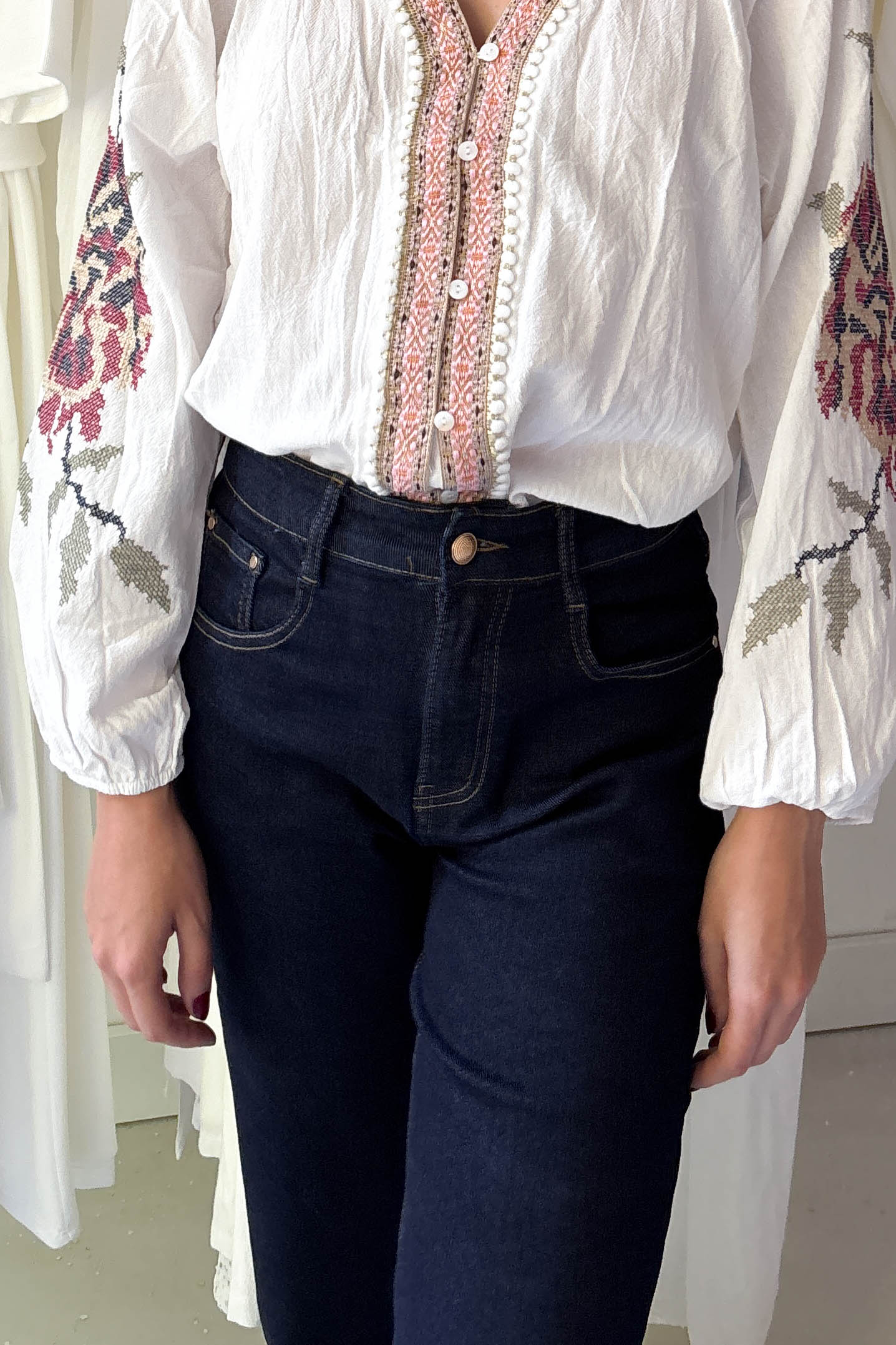 Hosszított, egyenes szárú farmer nadrág, indigókék színben. Zsebes fazon. Elől egy gombbal és cipzárral záródik.