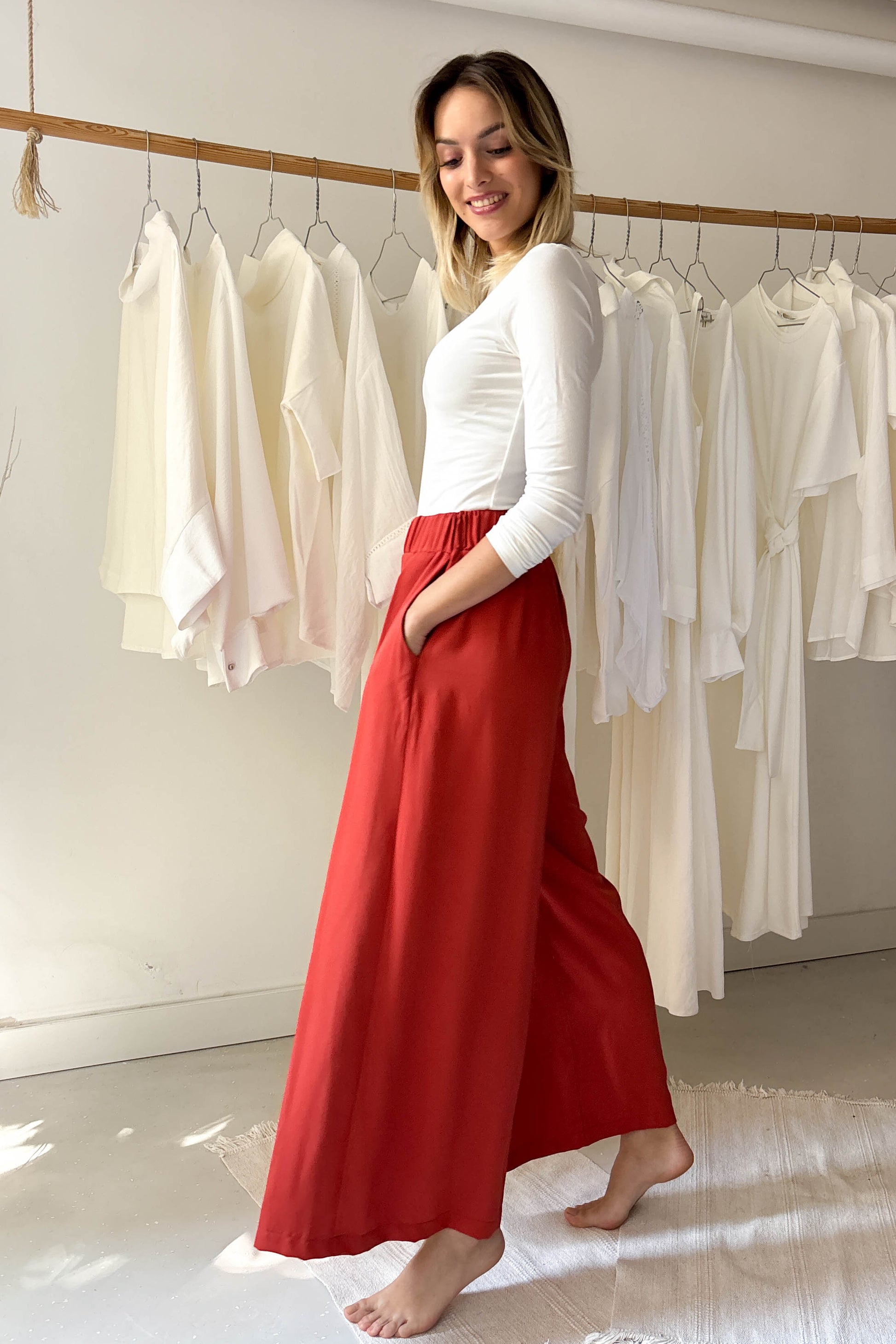 Lenge, elöl hajtásos nagrág téglavörös színben. Derékon gumírozott, elasztikus. Bő szárú, zsebekkel ellátott fazon.