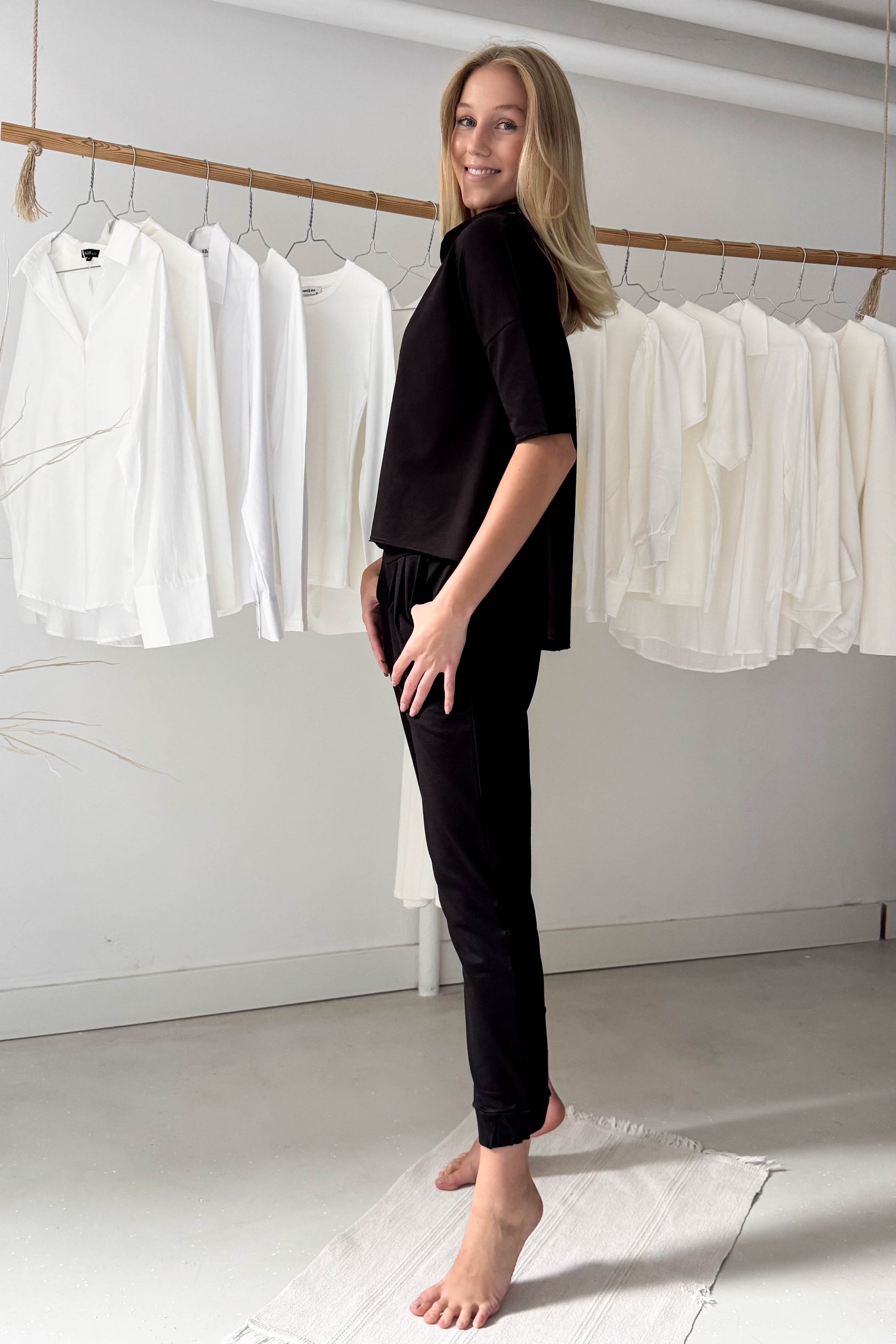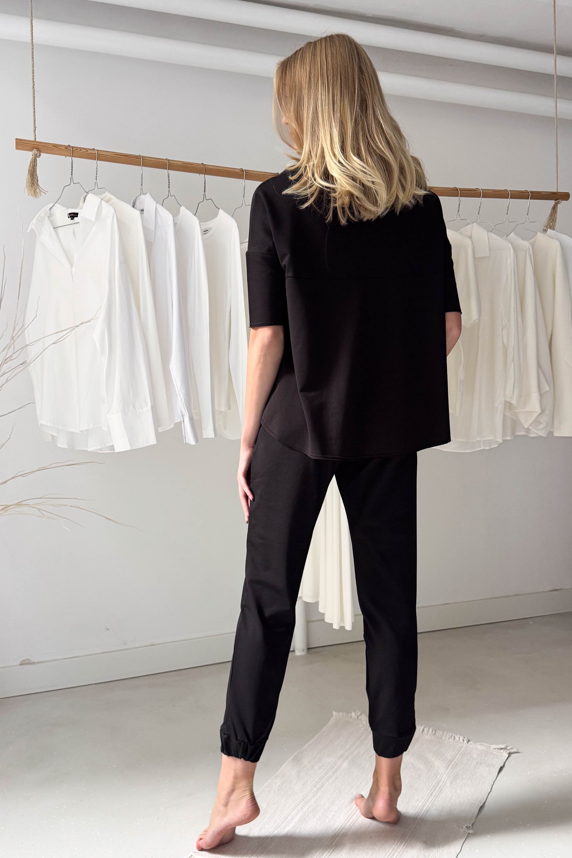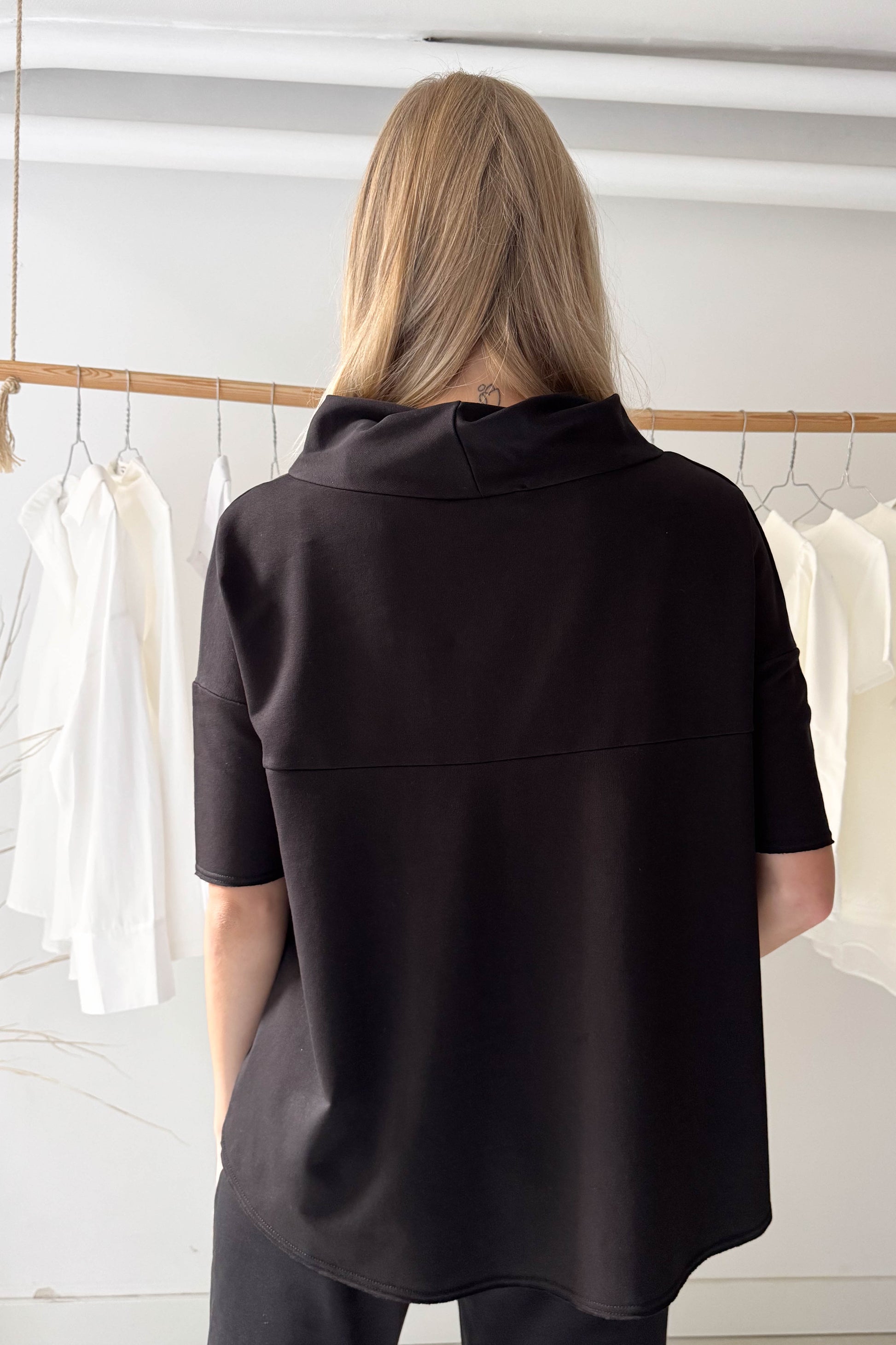 Fekete, rövidujjú, csavart nyakú, lenge felső. Elől rövidebb, hátul hosszabb szabás. Két féle hosszúságban készül, ez a rövidebb fazon. Mell vonaltól lefelé enyhén bővül. Anyaga kívül sima, belül hurkolt szövet, kényelmes, elasztikus.