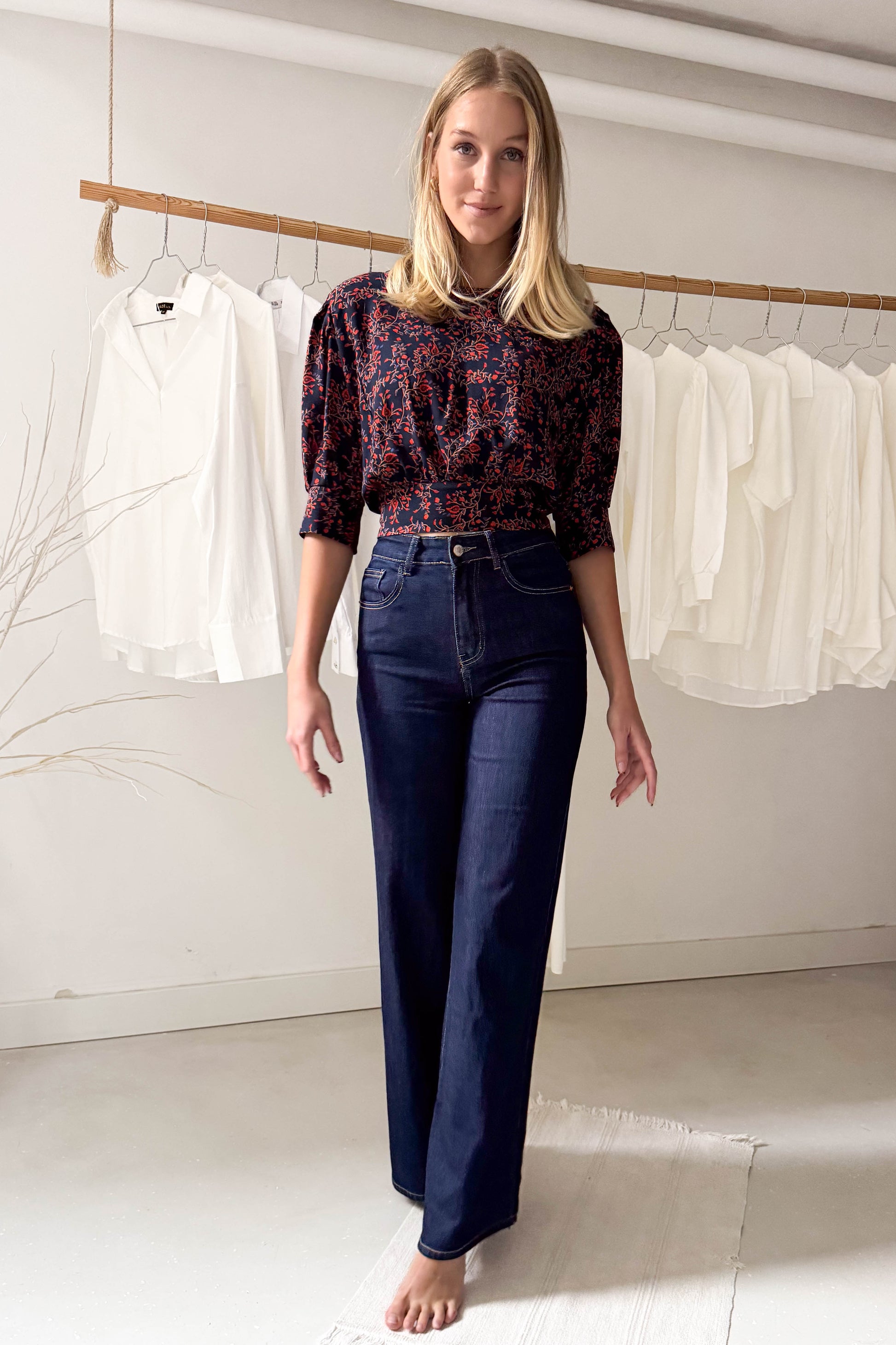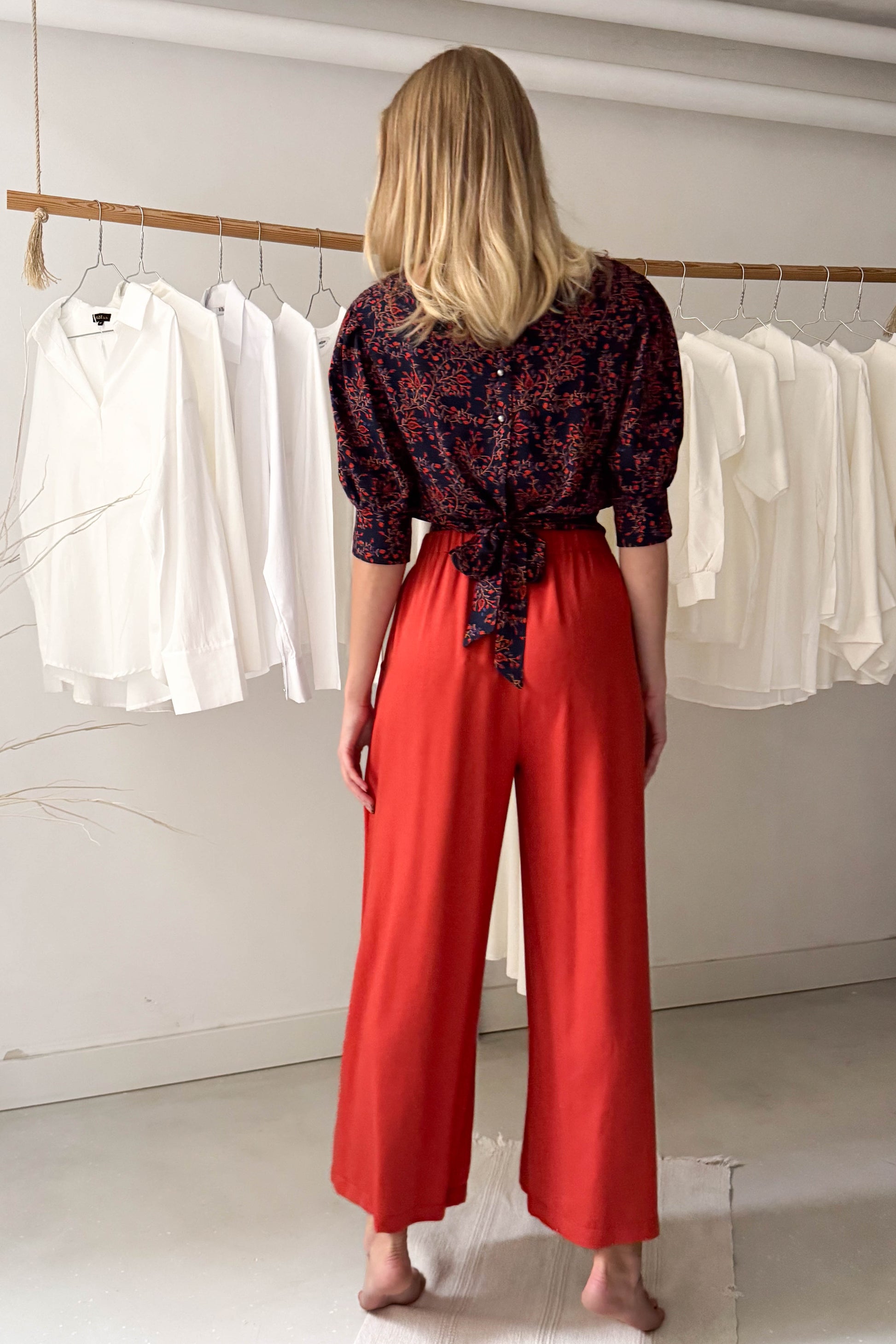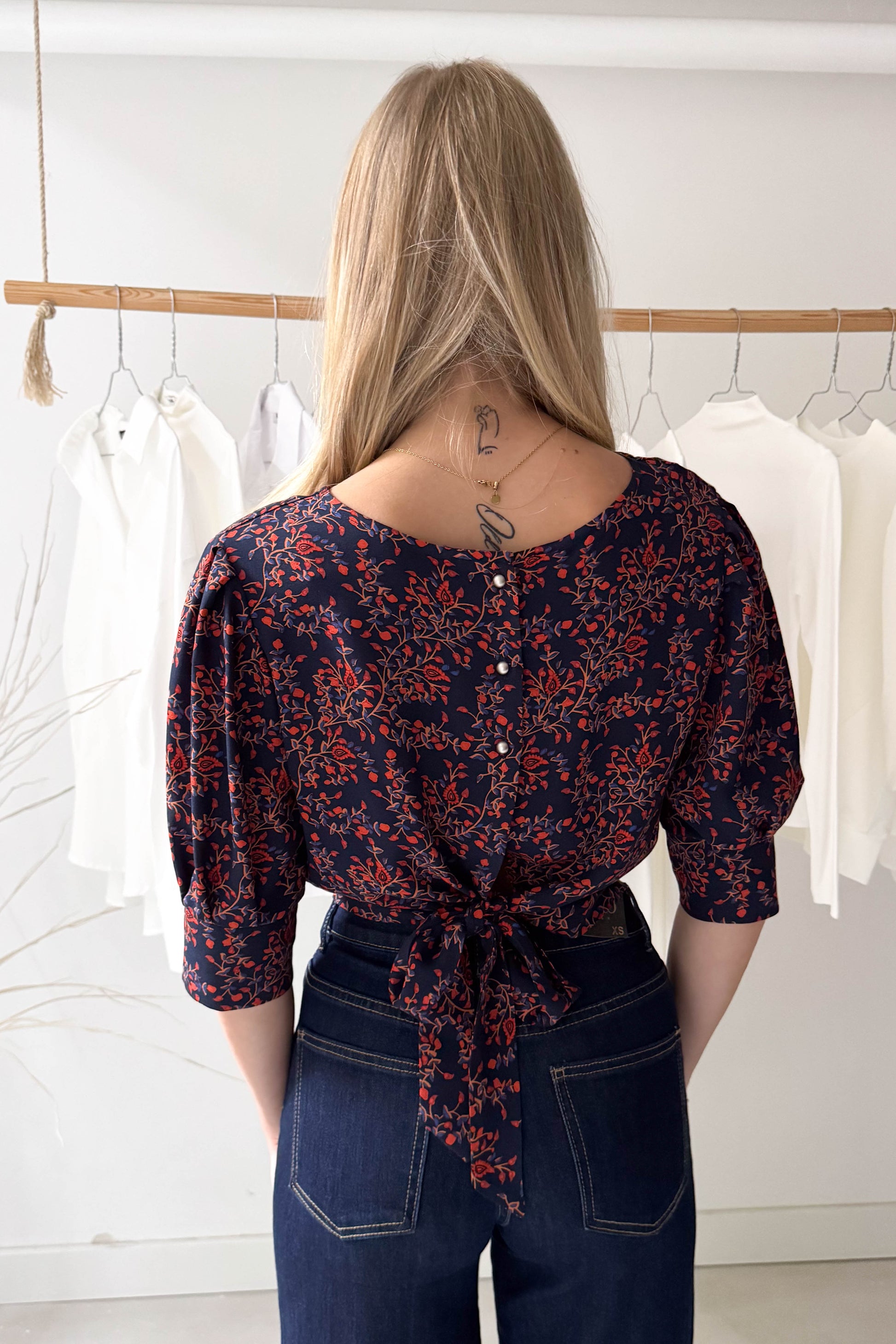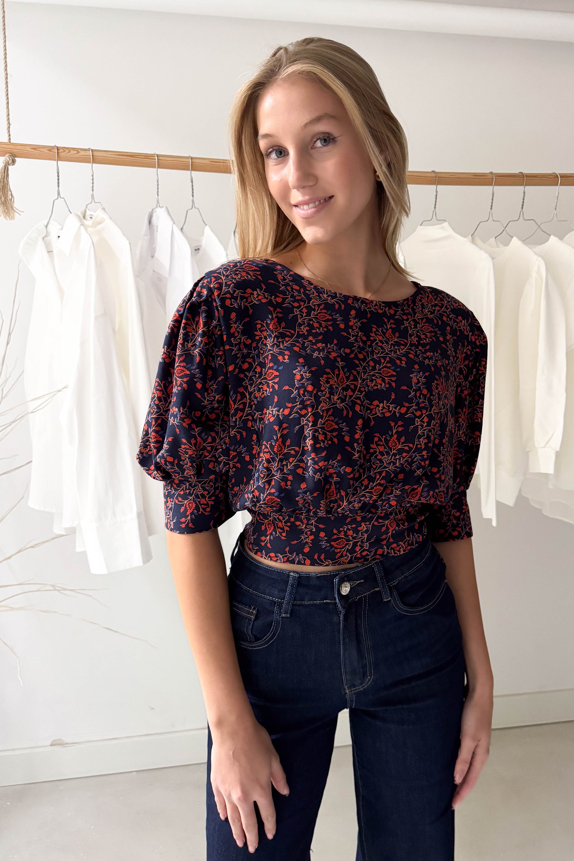 Puffos rövidujjú, rövidállású felső, széles derékpánttal, sötétkék alapon tégla színű virágokkal. Hátul enyhén kivágágott fazon és gombokkal illetve kötővel záródik.