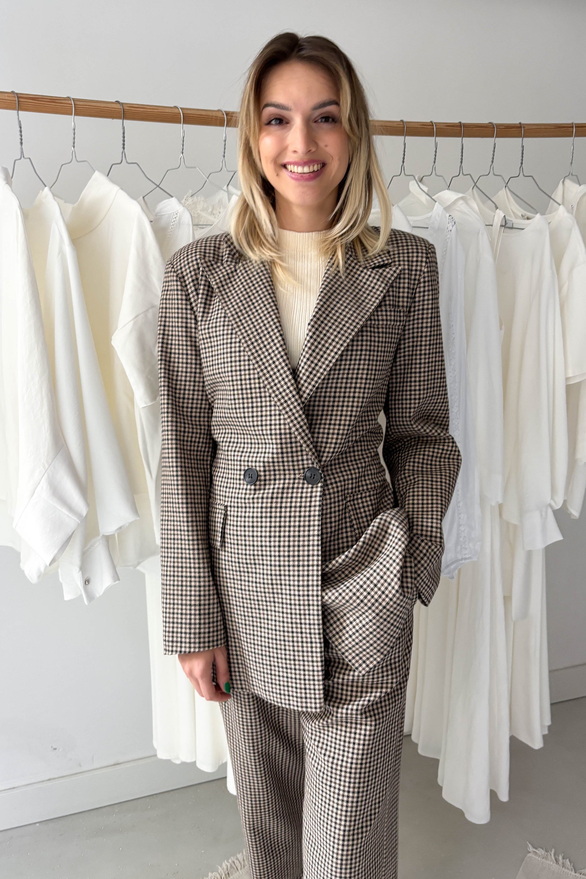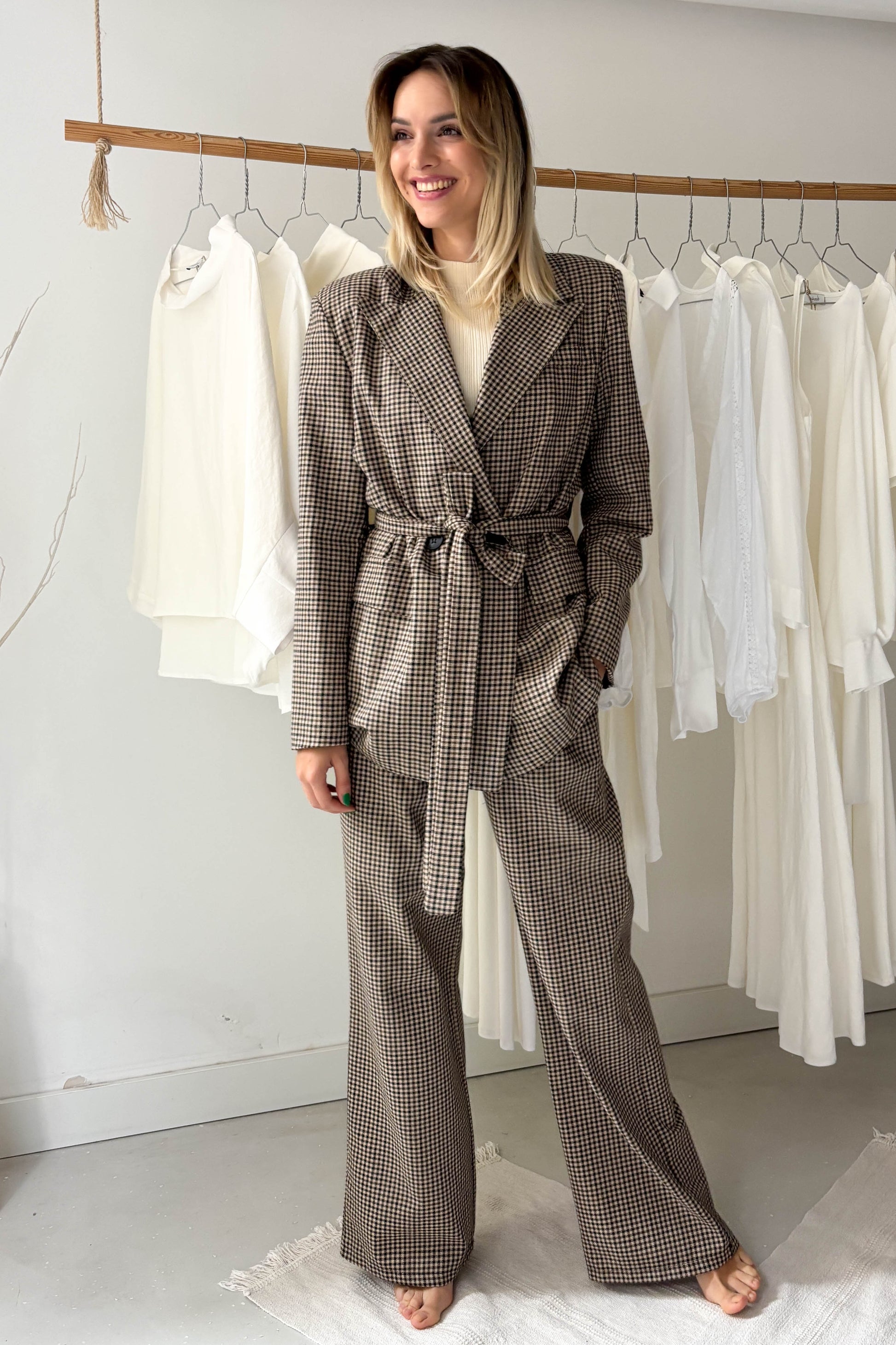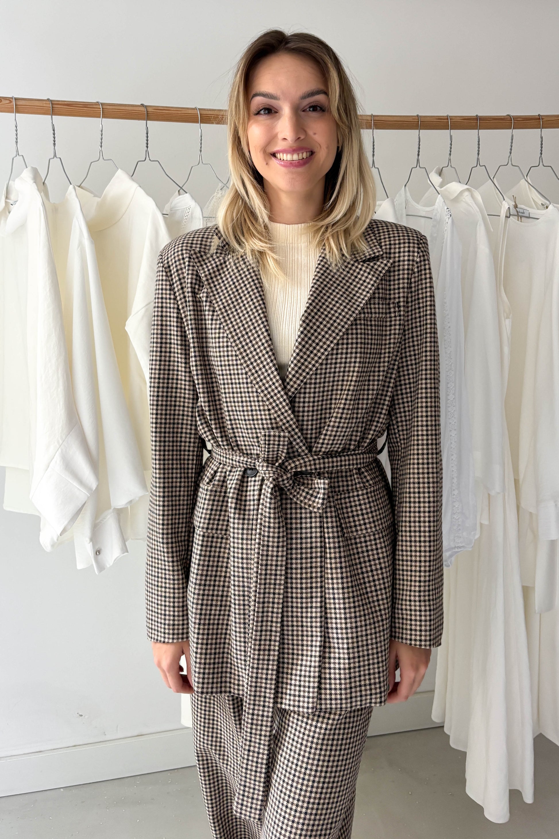 Hosszított szabású, bélelt, két gombos blézer. Válltöméses fazon. Derekrészen hamiszsebekkel és egy megkötővel van ellátva, amely által többféleképpen is hordható.