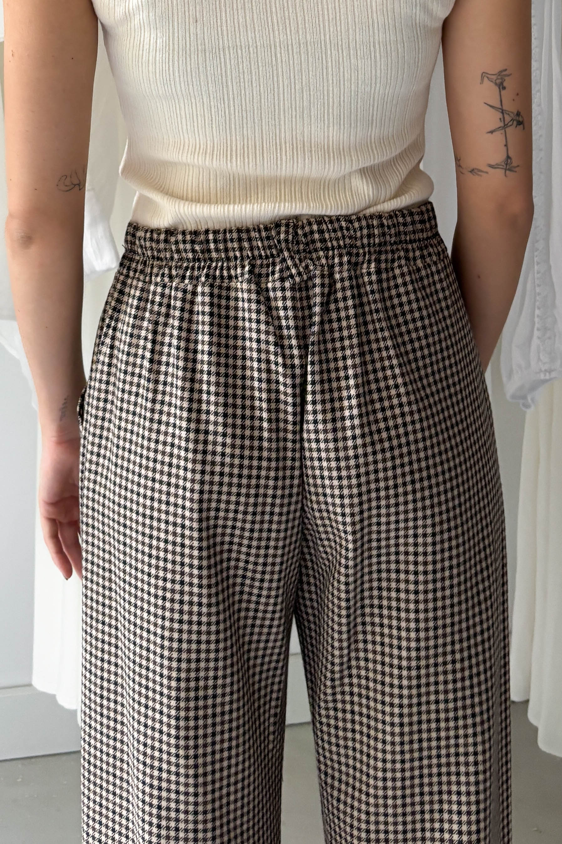 Elől hajtásos, hátul gumírozott derekú, zsebes nadrág. Elől középen cipzárral és egy gombbal záródik.