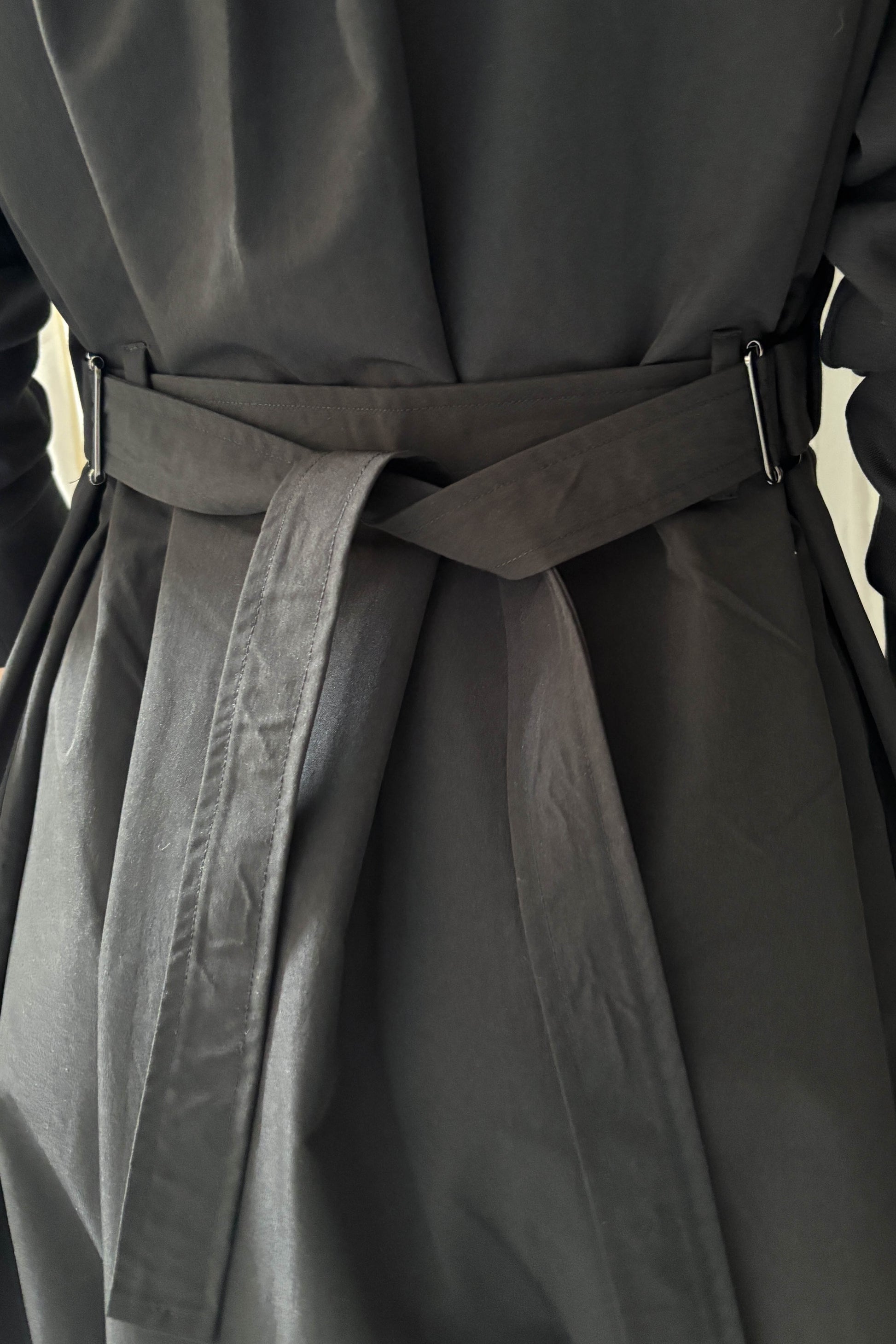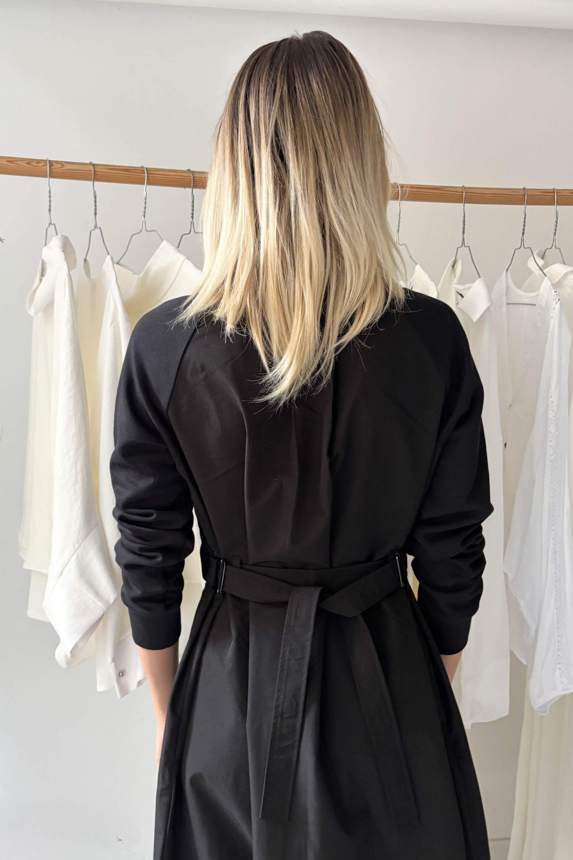 Két féle anyagból készült midi ruha. Az ujjak és a felső részének az eleje pulcsi puhaságú pamutból, a többi része pedig pamutkarton anyagból kászült. Magasított nyakú, hosszúujjú fazon. Alsórésze elől középen apró gombokkal záródik. Derékrészen egy megkötővel szűkíthető fazon.