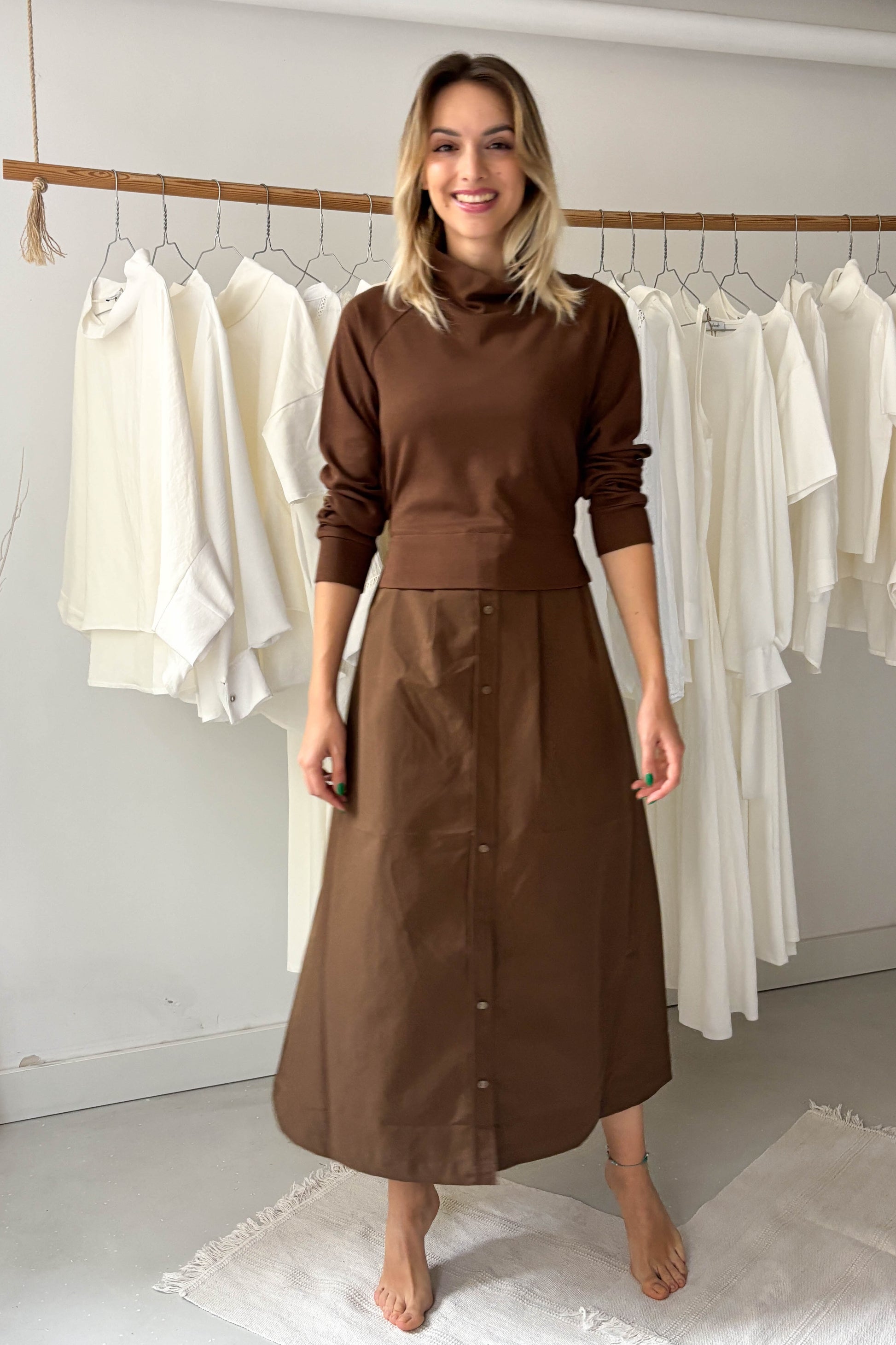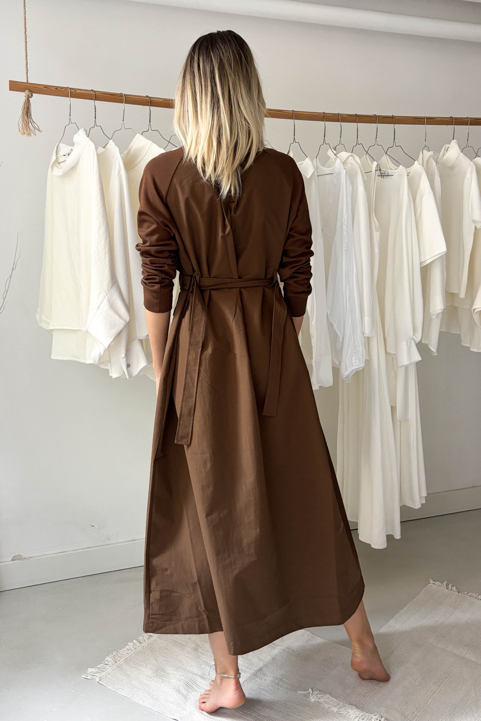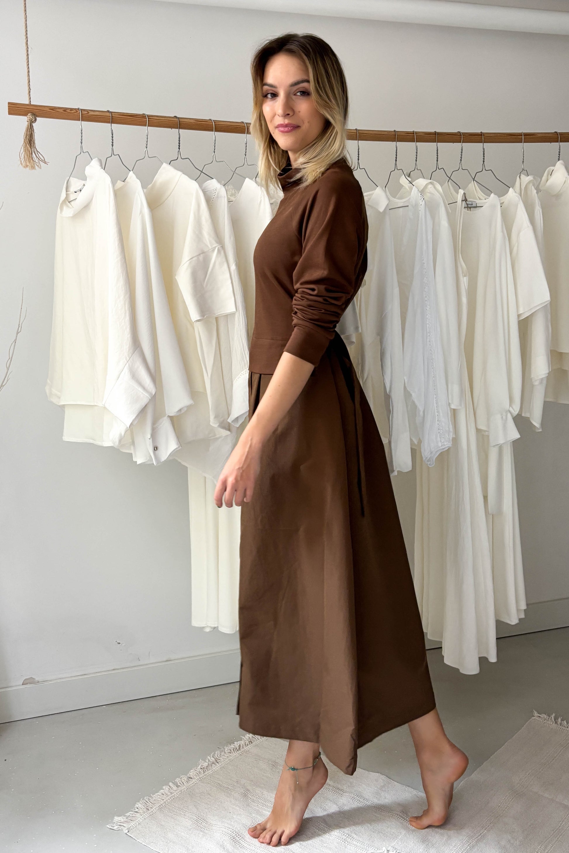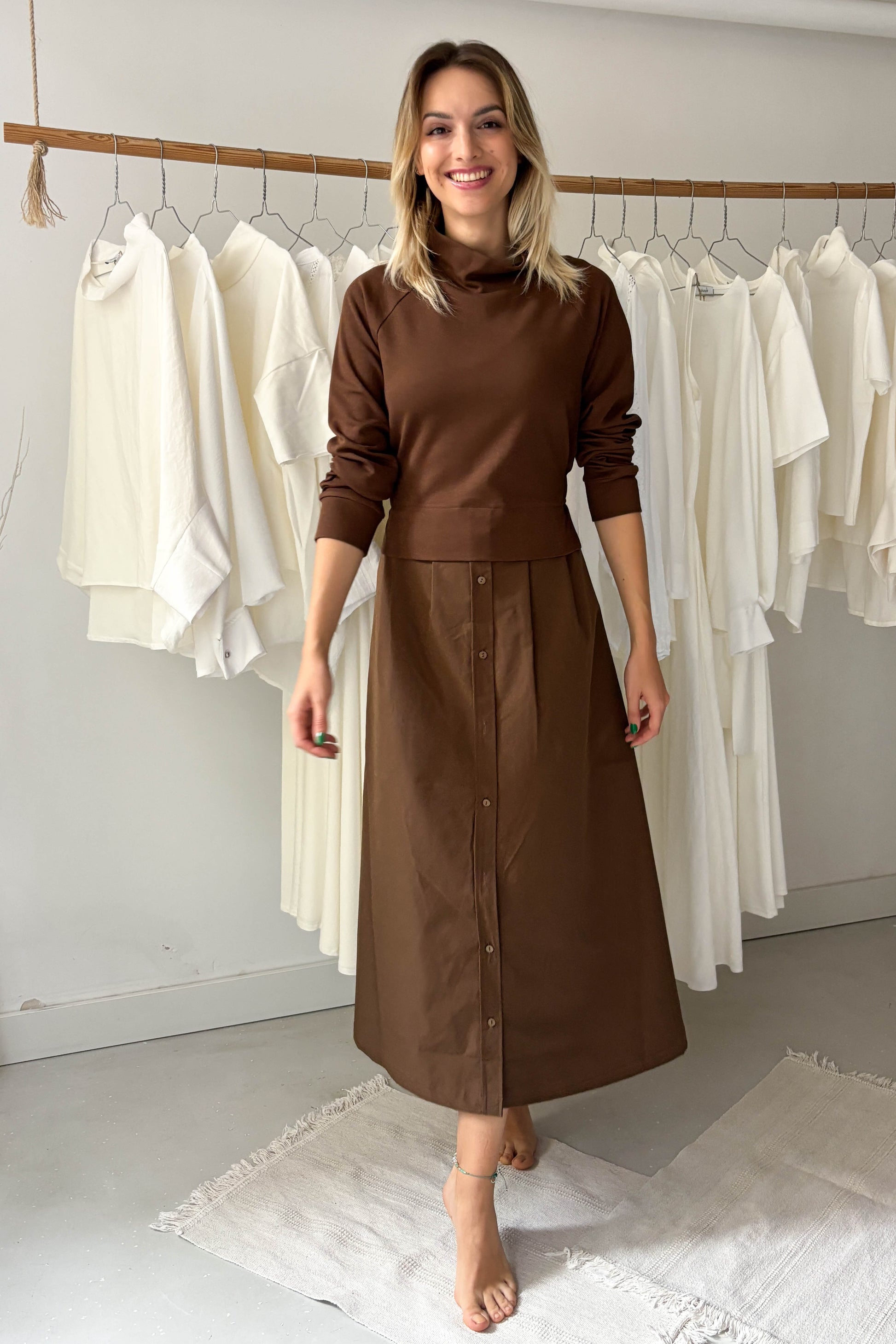Két féle anyagból készült midi ruha. Az ujjak és a felső részének az eleje pulcsi puhaságú pamutból, a többi része pedig pamutkarton anyagból kászült. Magasított nyakú, hosszúujjú fazon. Alsórésze elől középen apró gombokkal záródik. Derékrészen egy megkötővel szűkíthető fazon.