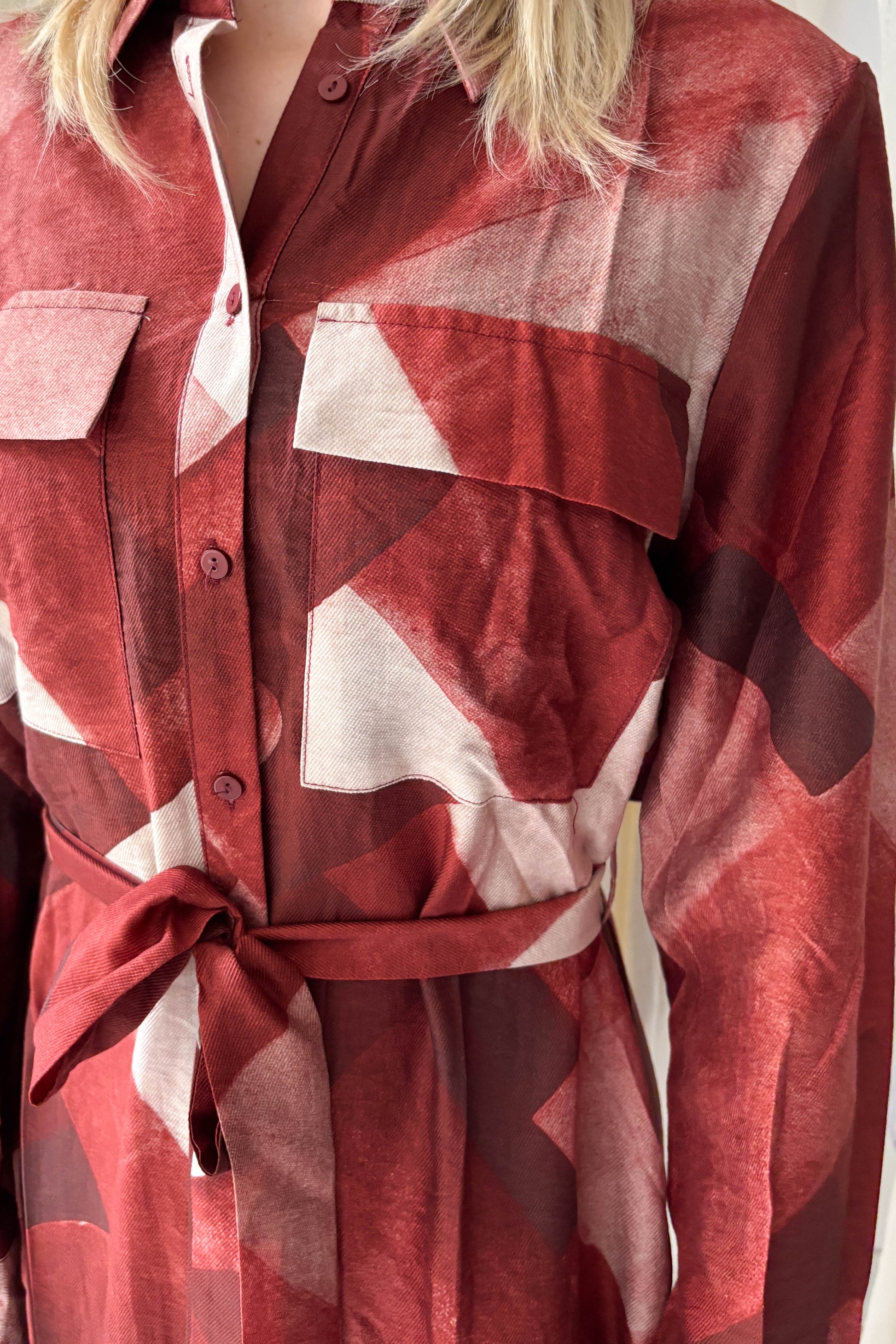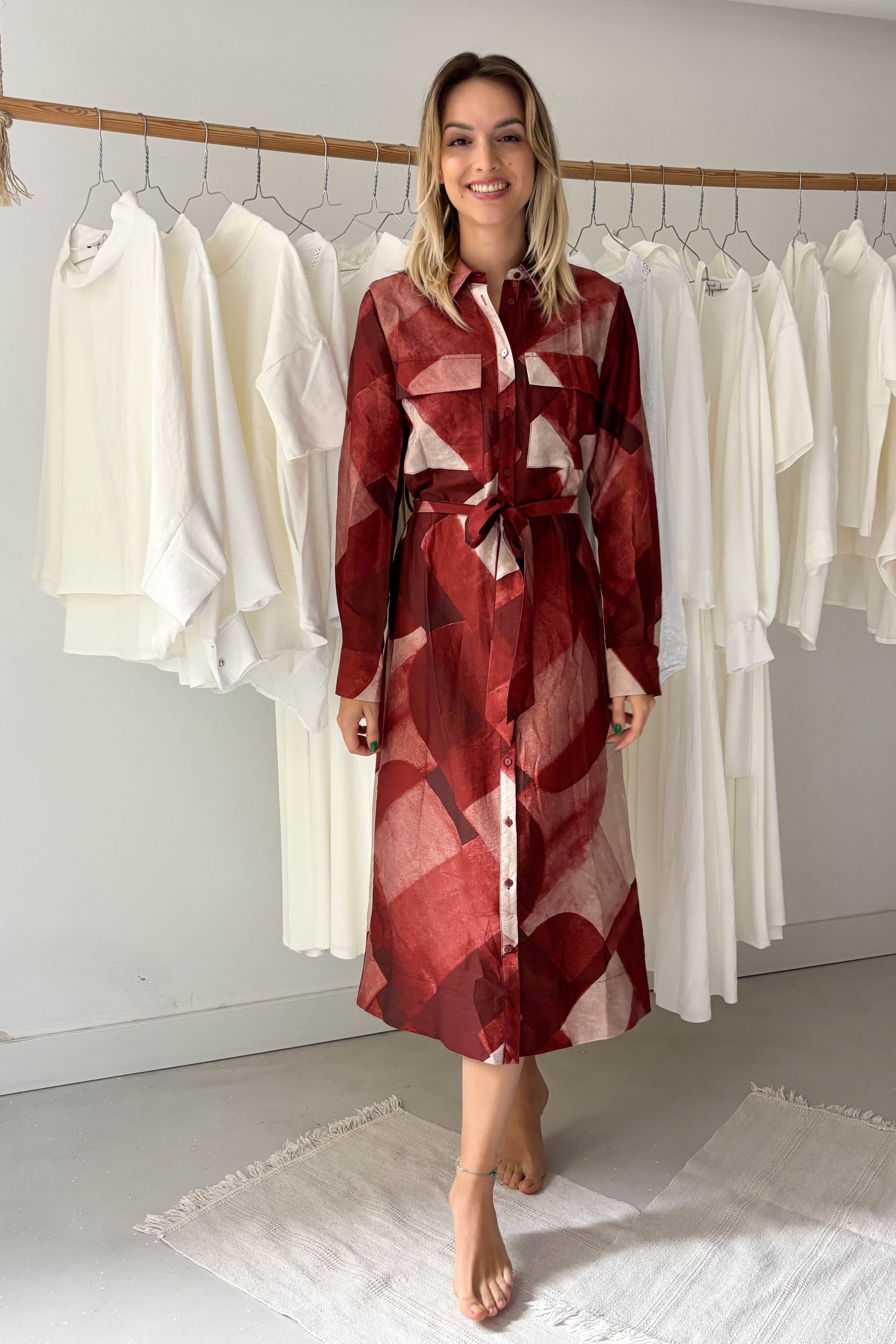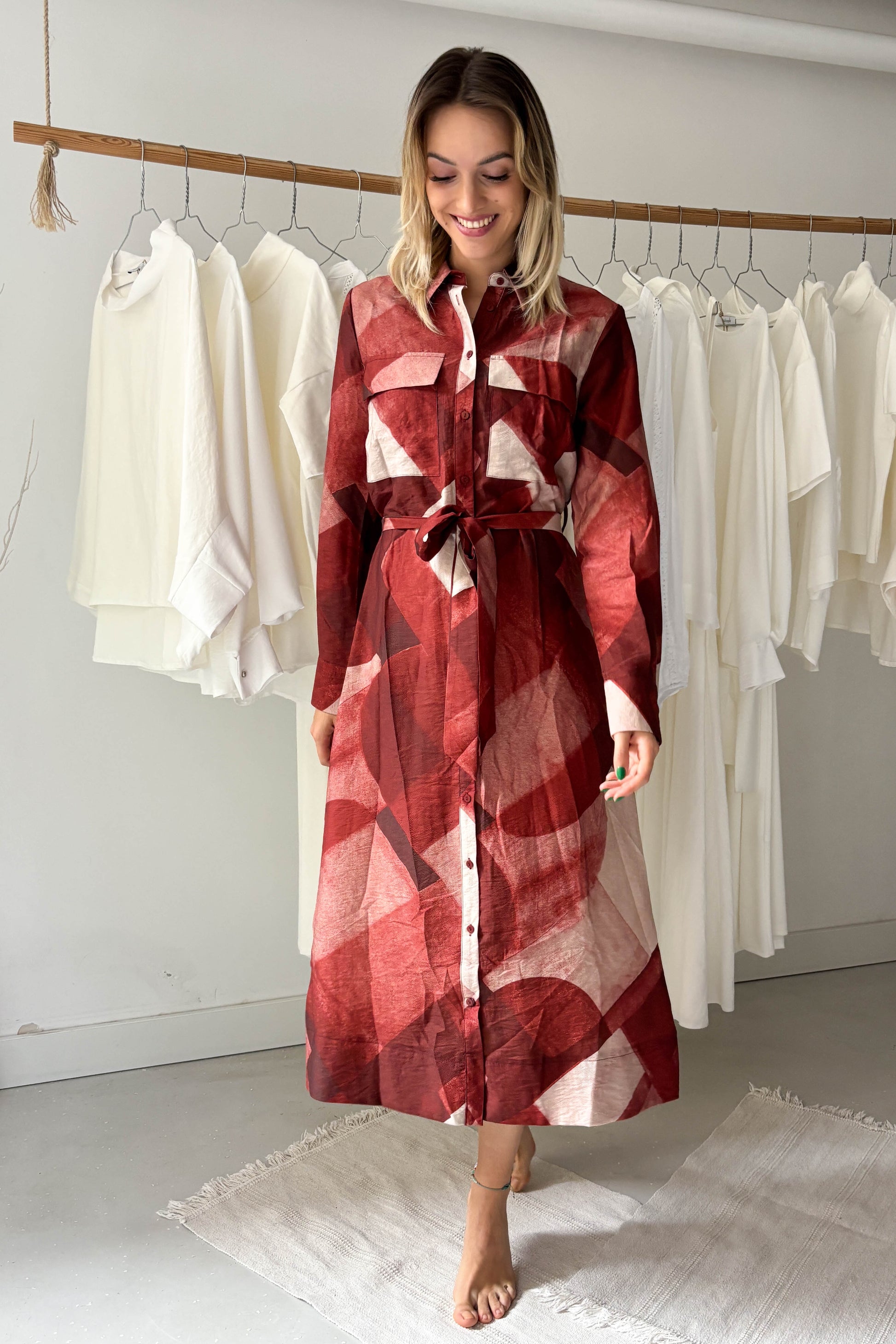 Galléros, hosszúujjú, midi ingruha. Mellrészen zsebekkel, derékrészen megkötővel van ellátva. Középen és az ujjak végén apró gombokkal záródik.