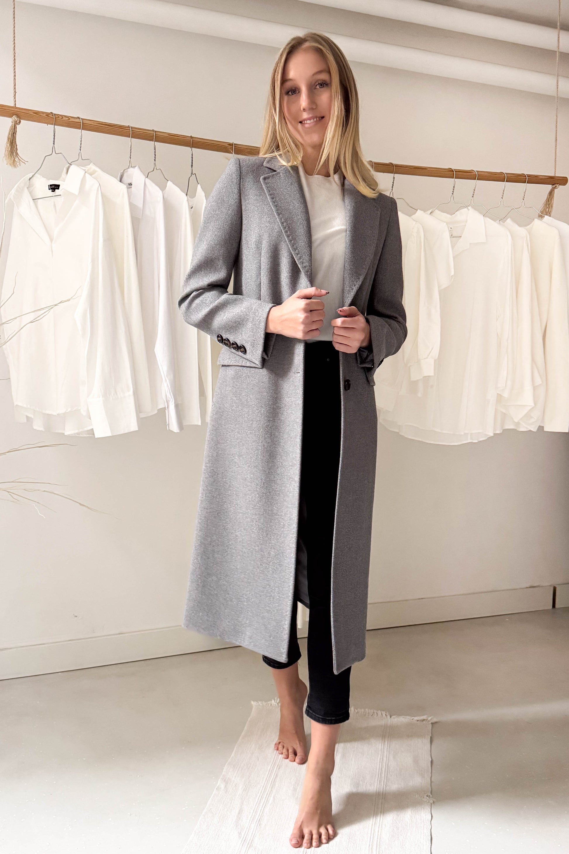 Hosszú szövetkabát szürke színben. Válltöméses, bélelt, szűkített fazon. Derékrészen álzsebekkel van ellátva. Középen két gombbal és rejtett gombbal záródik.