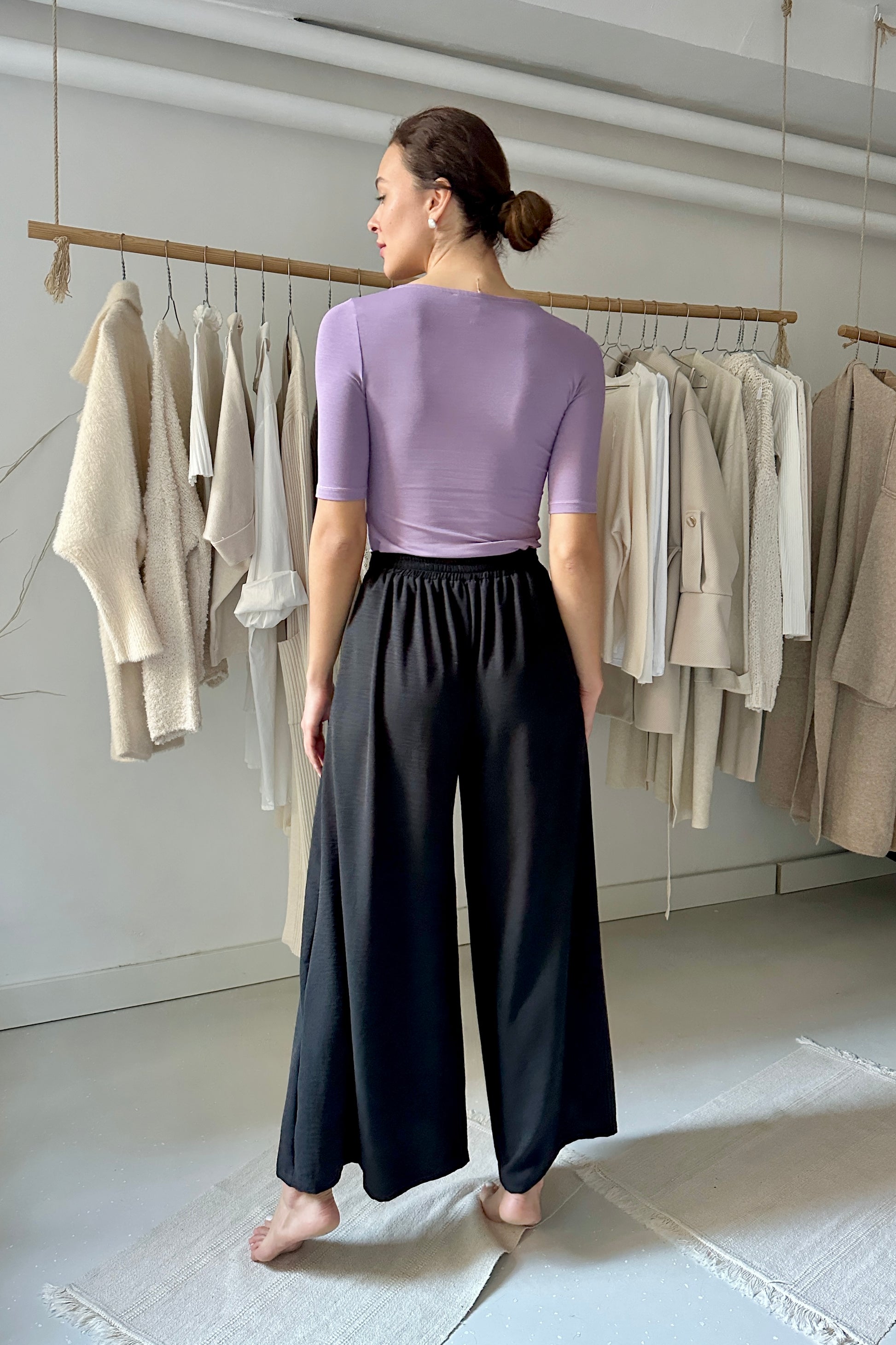 95% cotton, 5% elastane - cotton jersey. Elastic, soft premium quality cotton . Thanks to its close-fitting cut, it's really pretty. Machine washable at 30 degrees. The model is 177 cm tall.