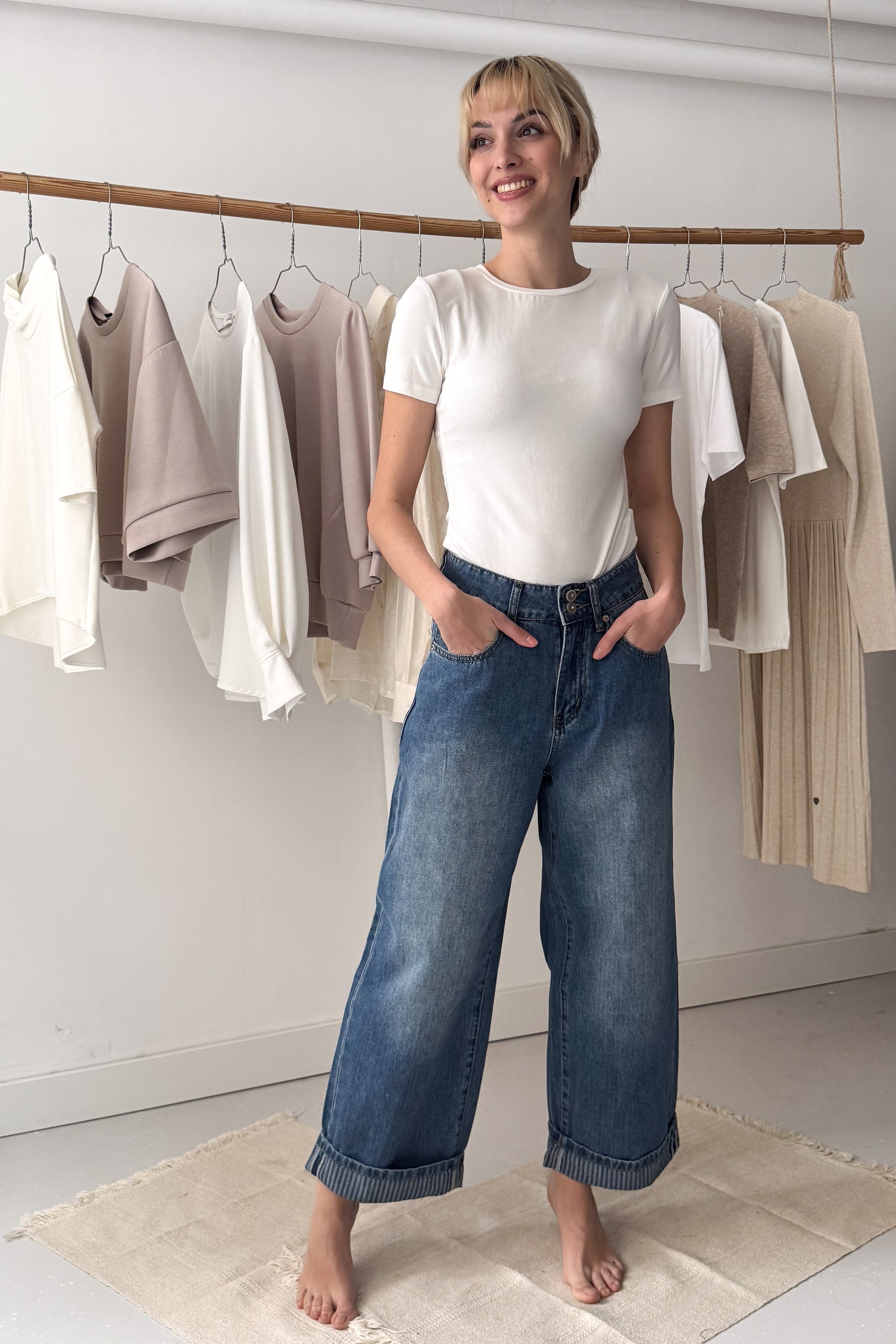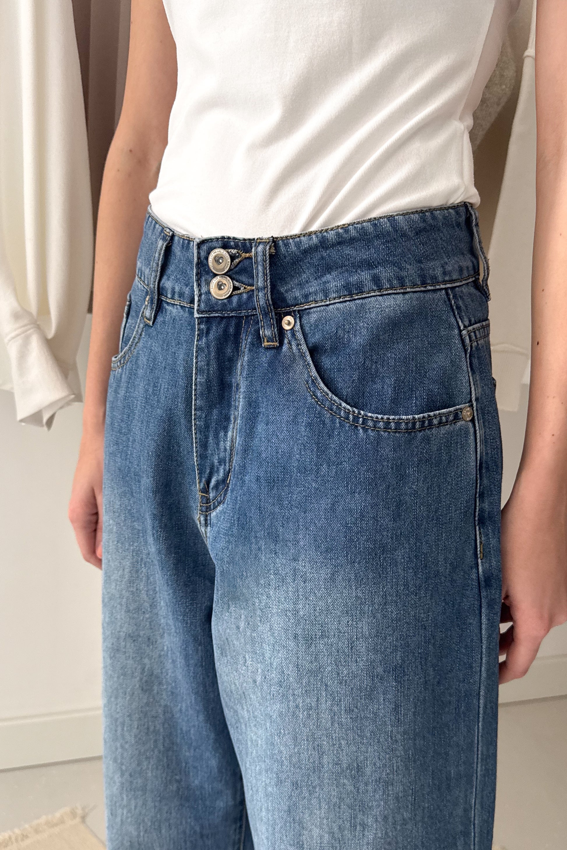 Kék színű ballon farmernadrág, csíkos farzsebbel és csíkos visszahajtással a szárak alján. Elöl egy gombbal és cipzárral záródó fazon. Puha, de nem rugalmas anyagú.