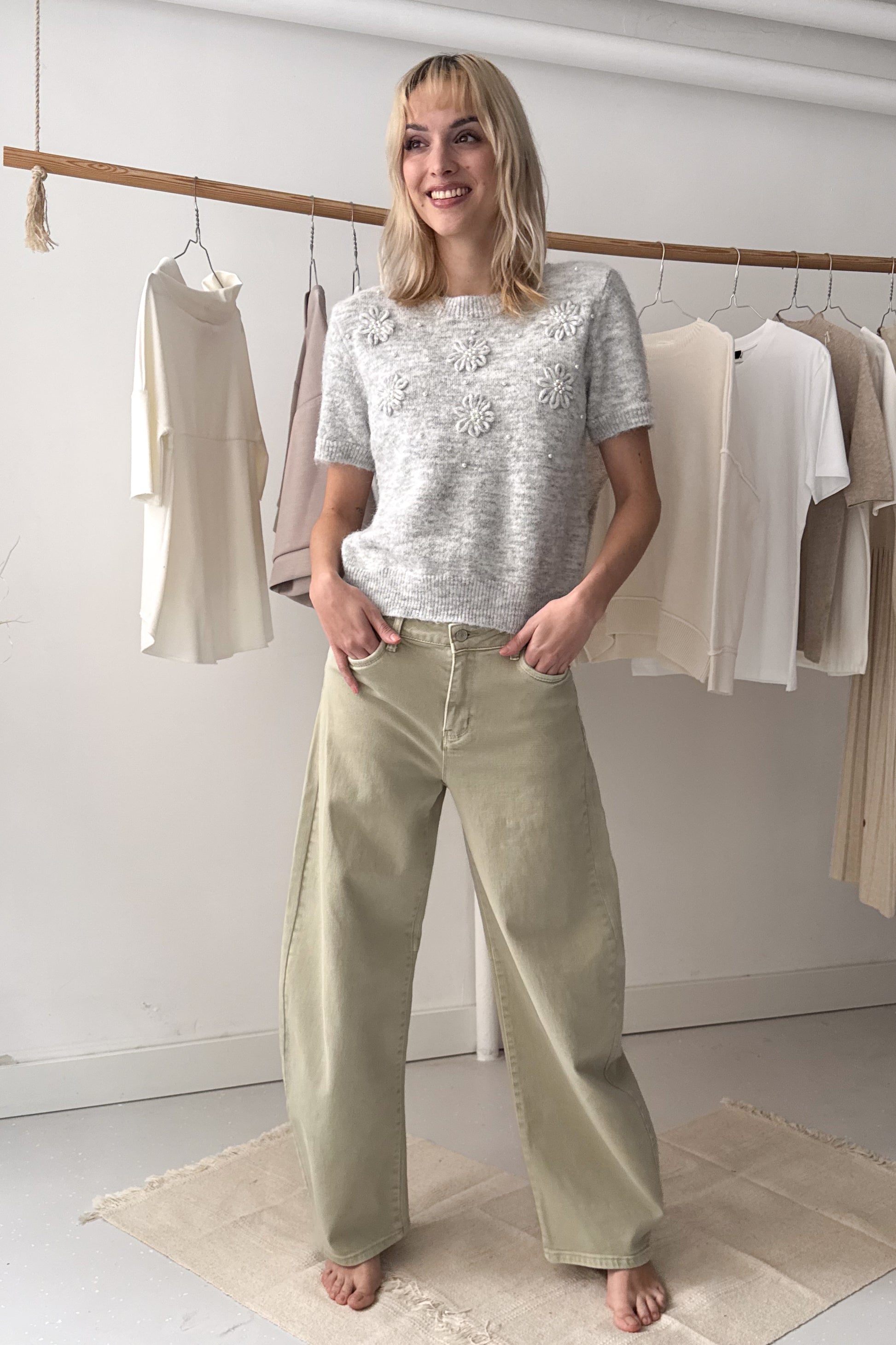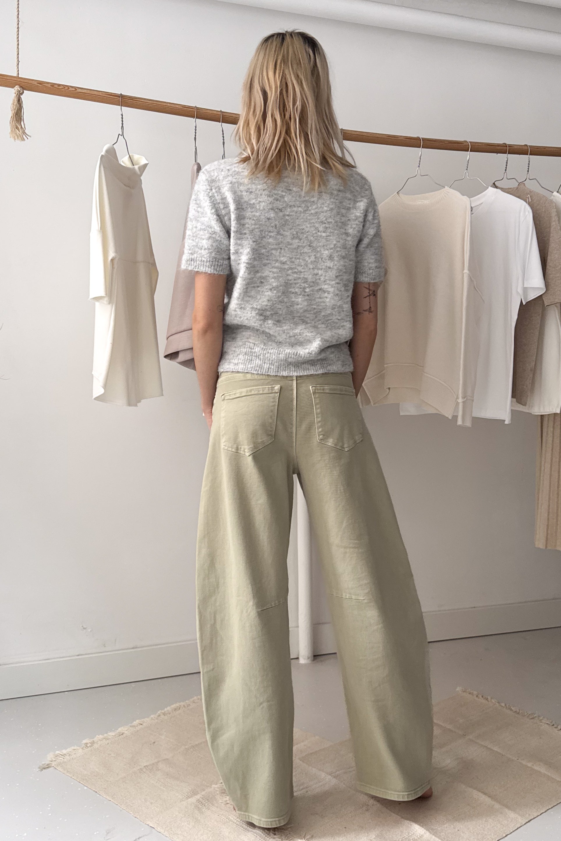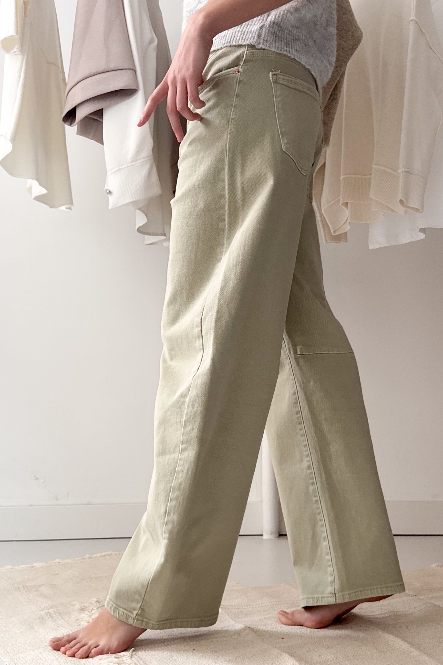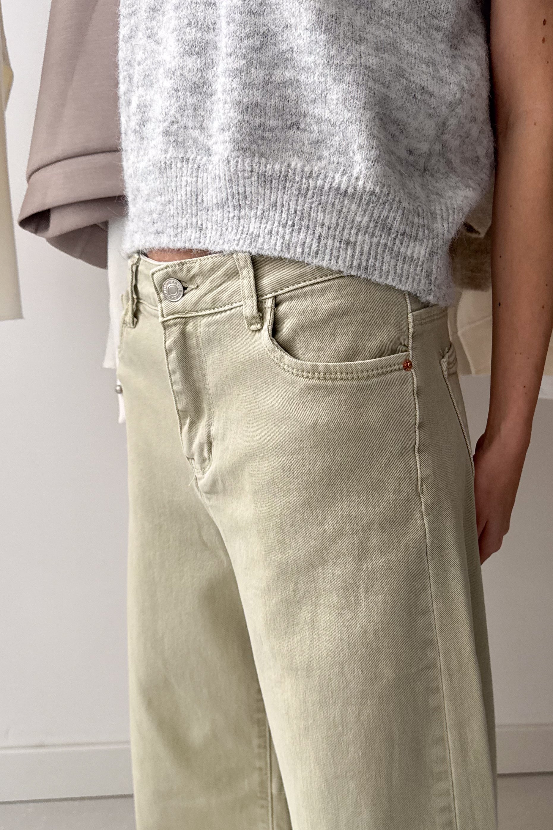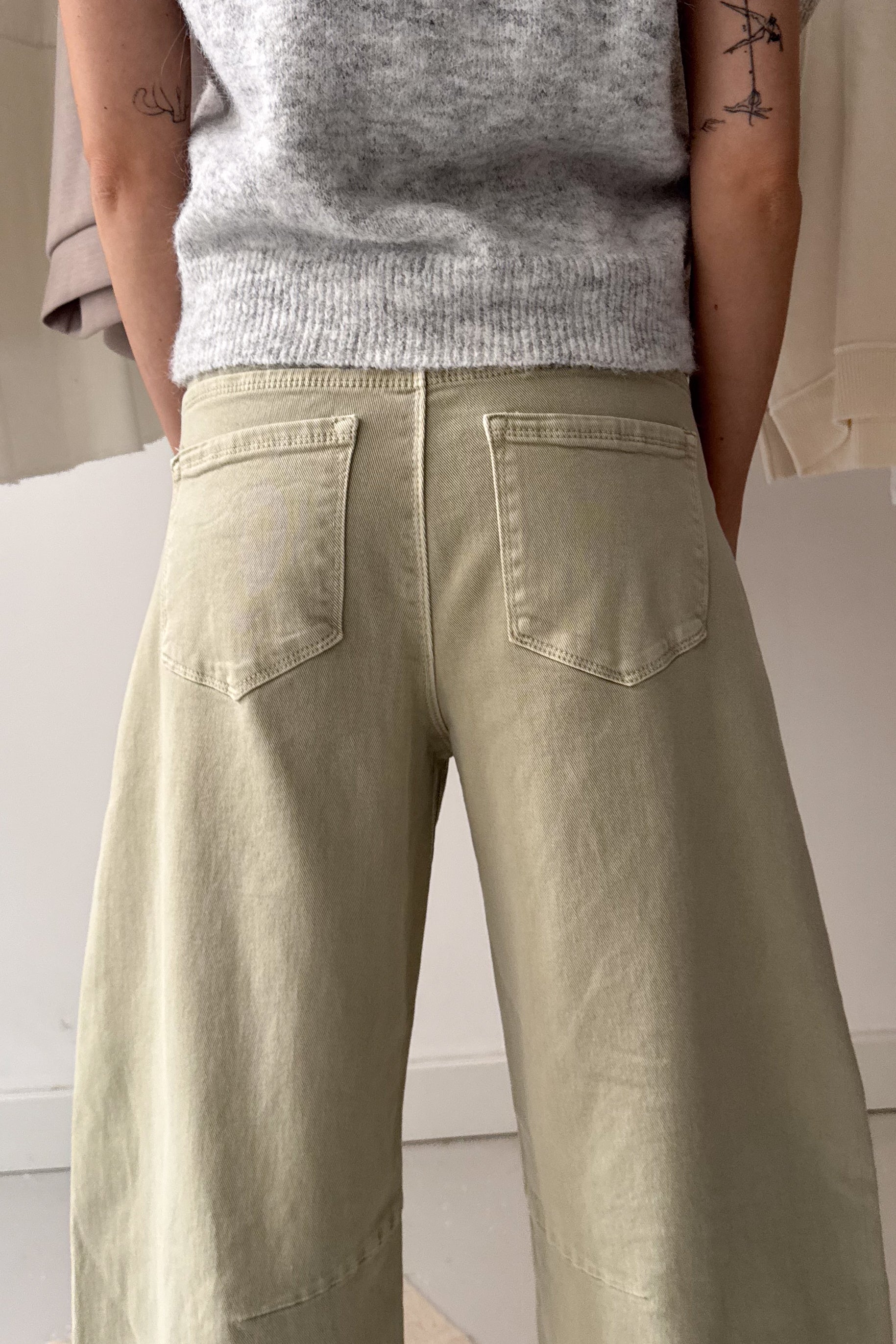 Pisztáciazöld ballon farmer. Bő szabású, bokánál enyhén szűkül. Zsebes fazon.