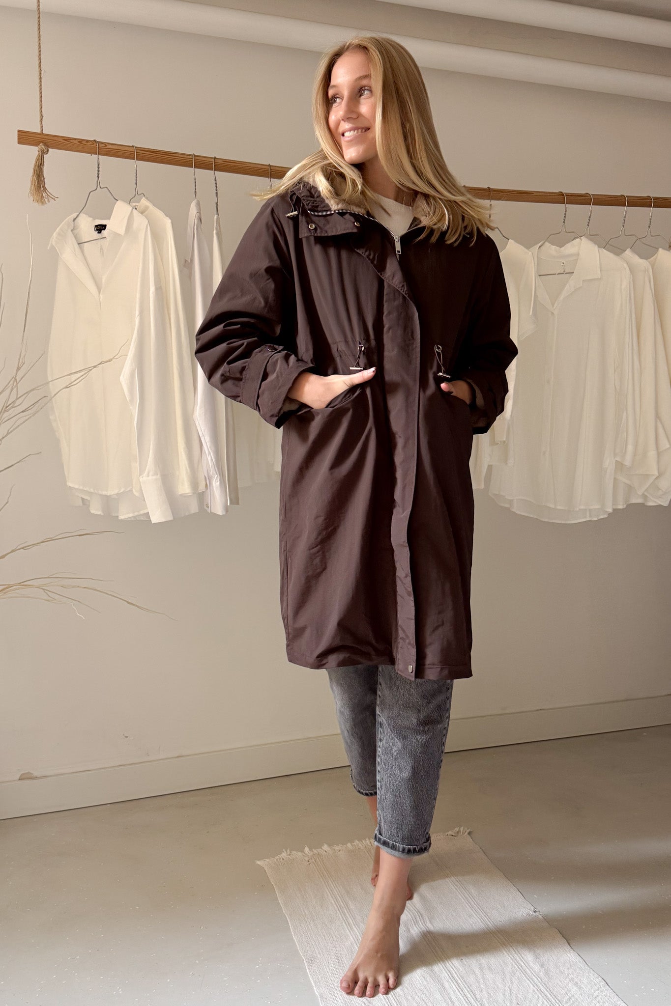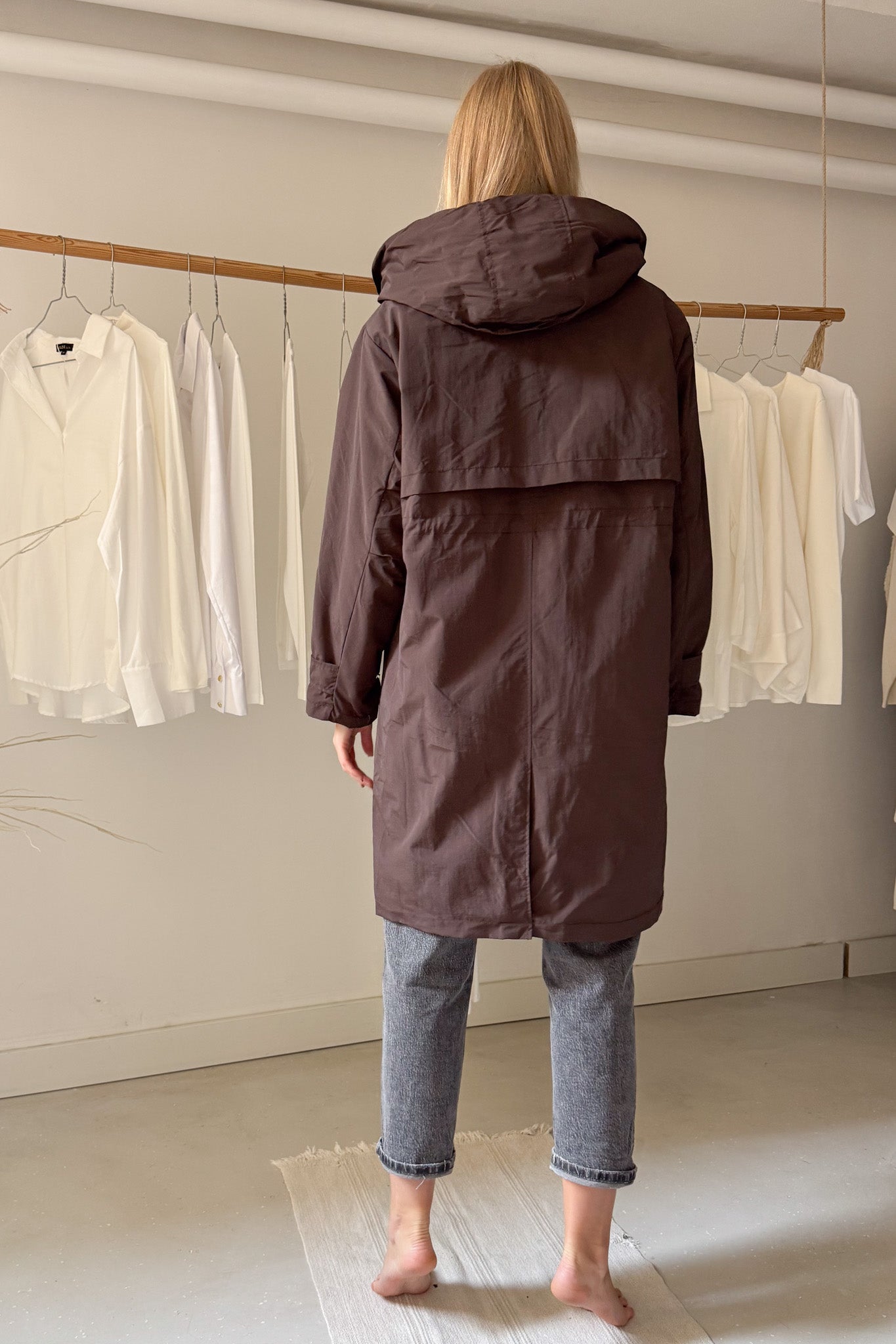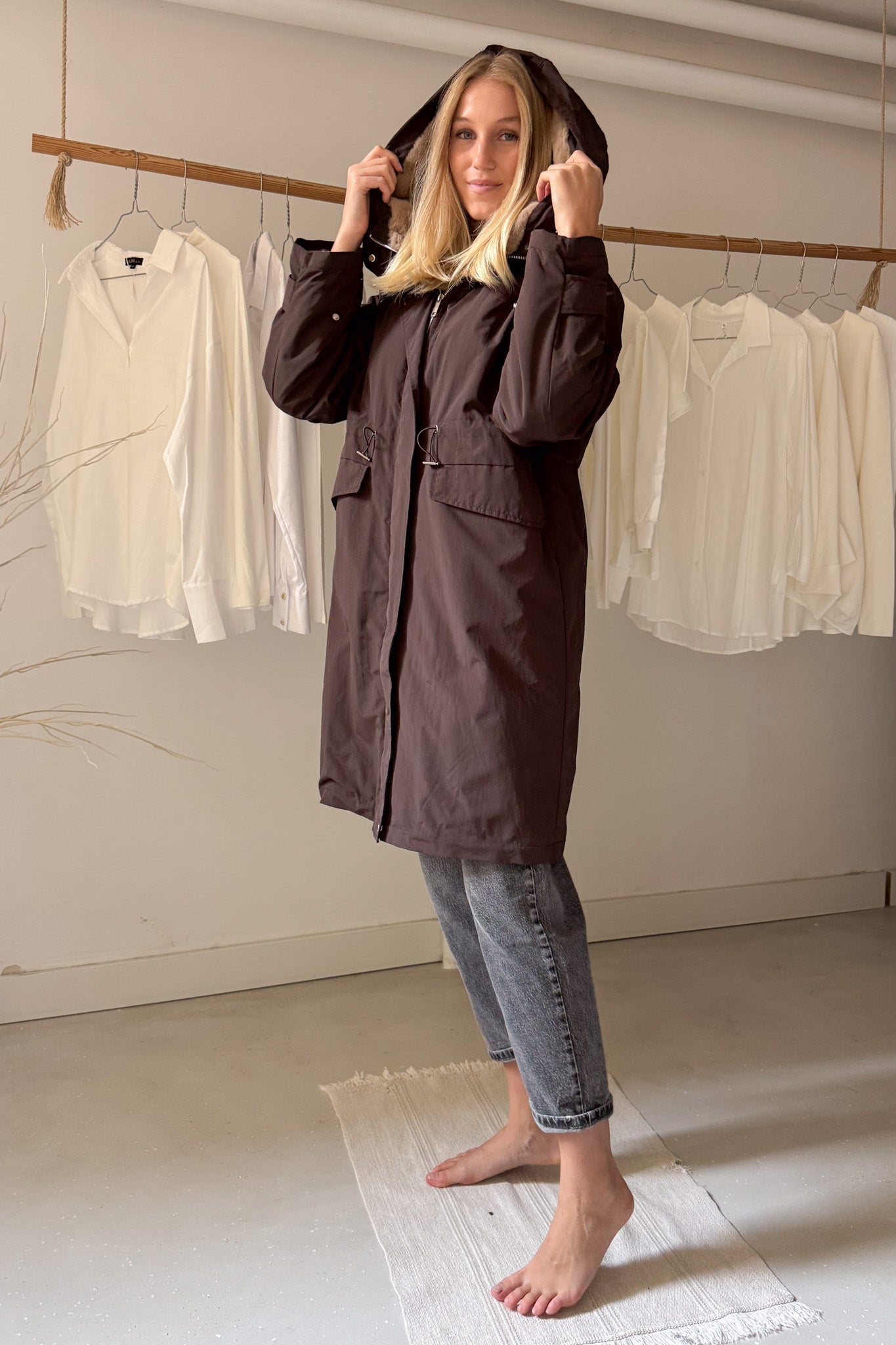 Kapucnis, térdig érő kabát, csokibarna színben. Szőrme hatású béléssel van ellátva. Elől cipzárral és a két végén egy-egy patenttal záródik. Az ujjak végén patenttal állítható mandzsetta van. Derékrészen szűkíthető, zsebes fazon.