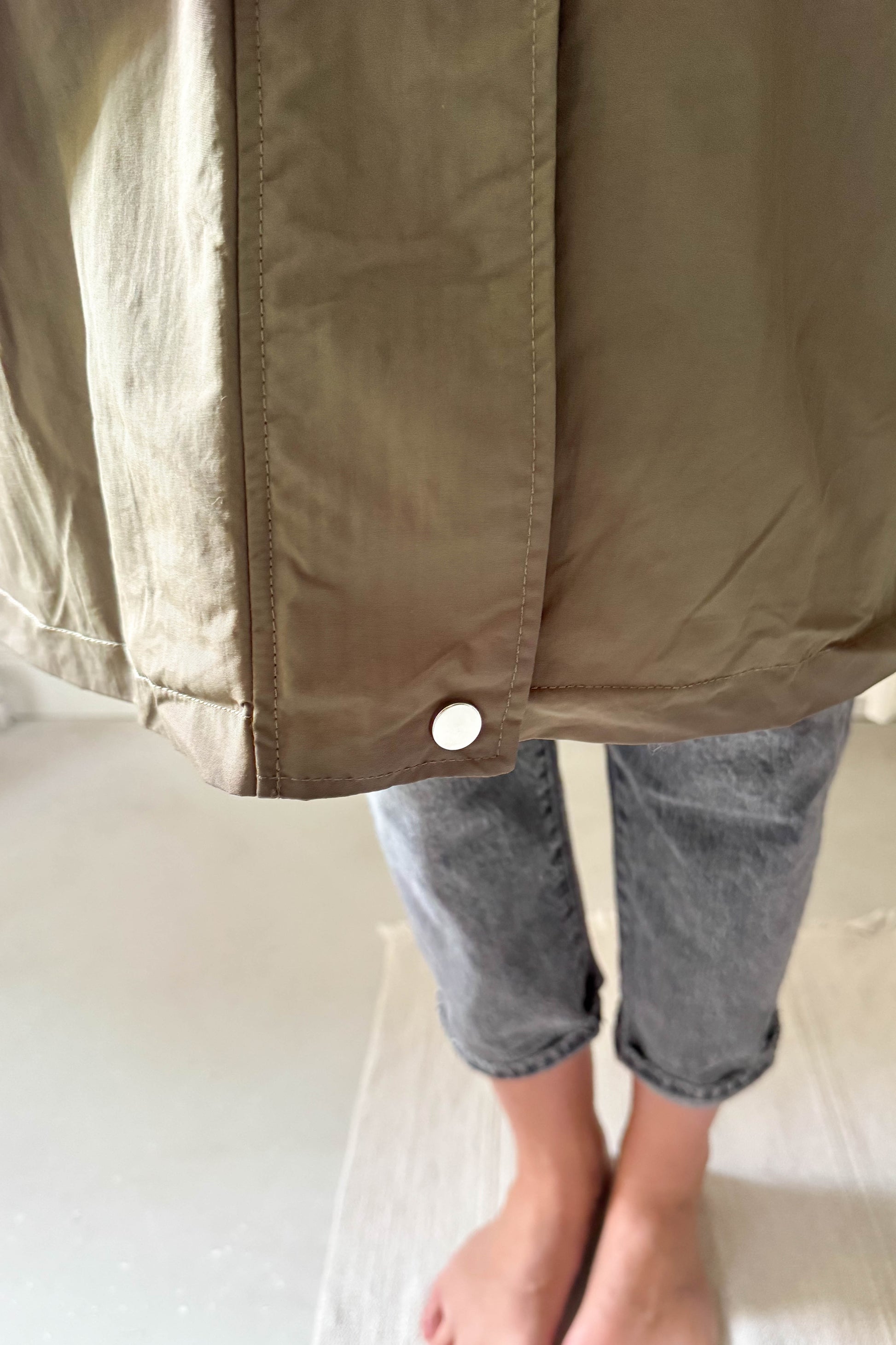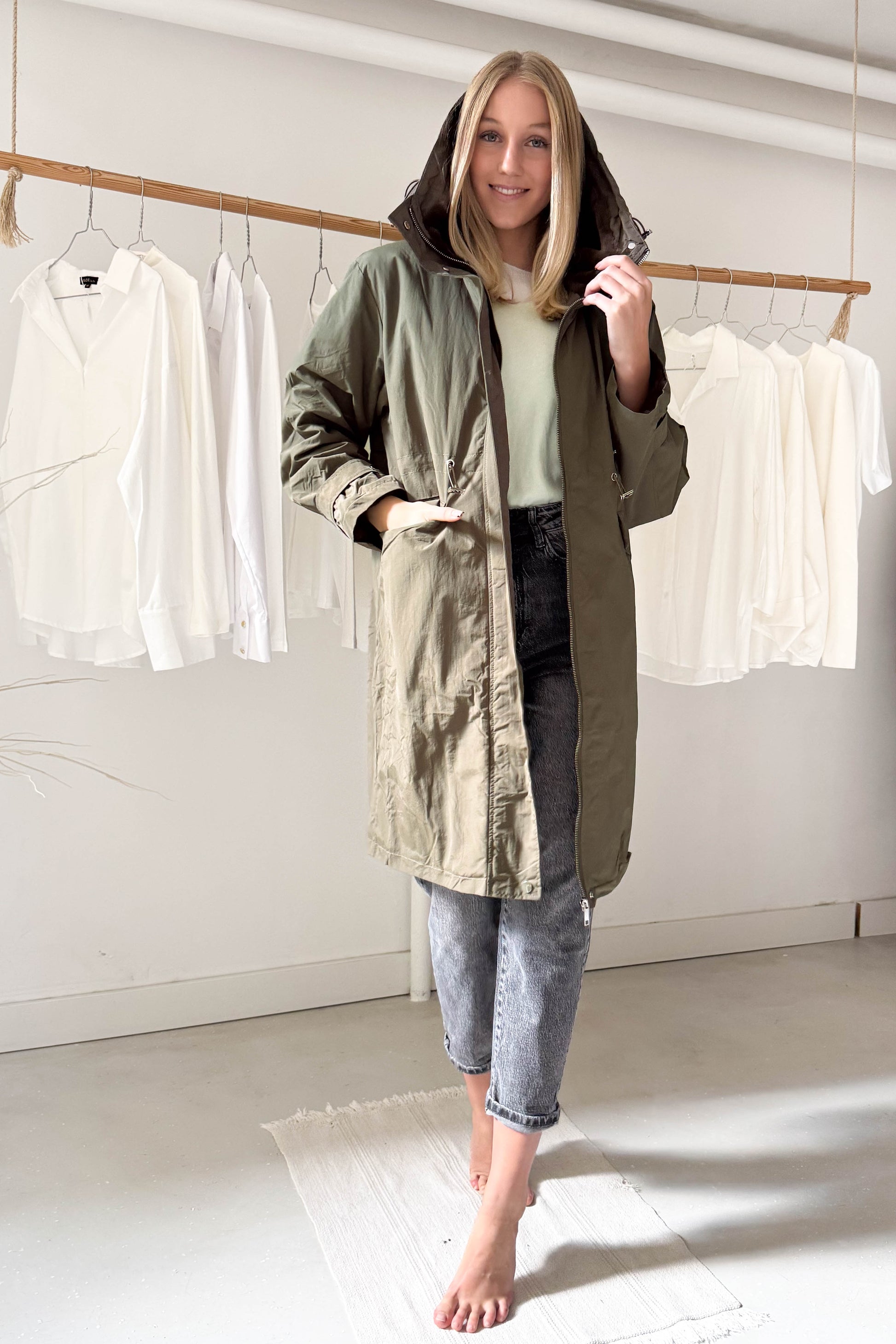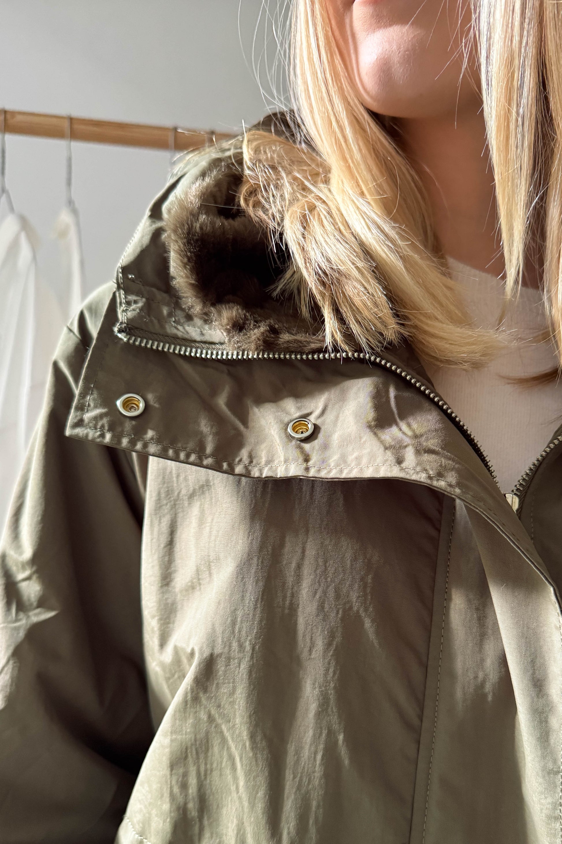 Kapucnis, térdig érő kabát, khaki színben. Szőrme hatású béléssel van ellátva. Elől cipzárral és a két végén egy-egy patenttal záródik. Az ujjak végén patenttal állítható mandzsetta van. Derékrészen szűkíthető, zsebes fazon.