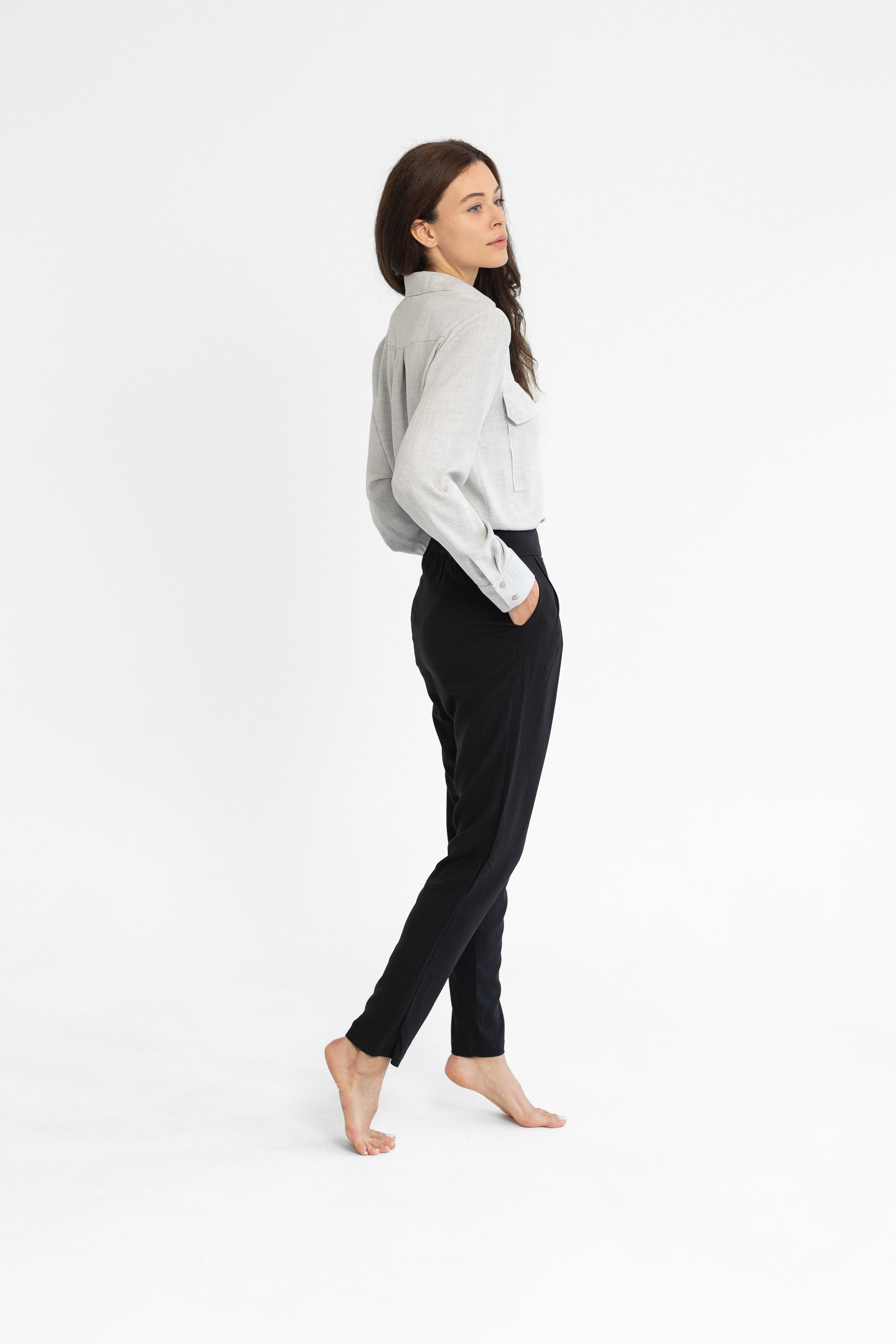 Soft flockon fabric with 100% viscose composition. The extra-lined pocket flaps of the two front pockets make this casual, yet elegant style special. We recommend one size up to size 34-40. Machine washable at 30 degrees. The model is 177 cm tall.