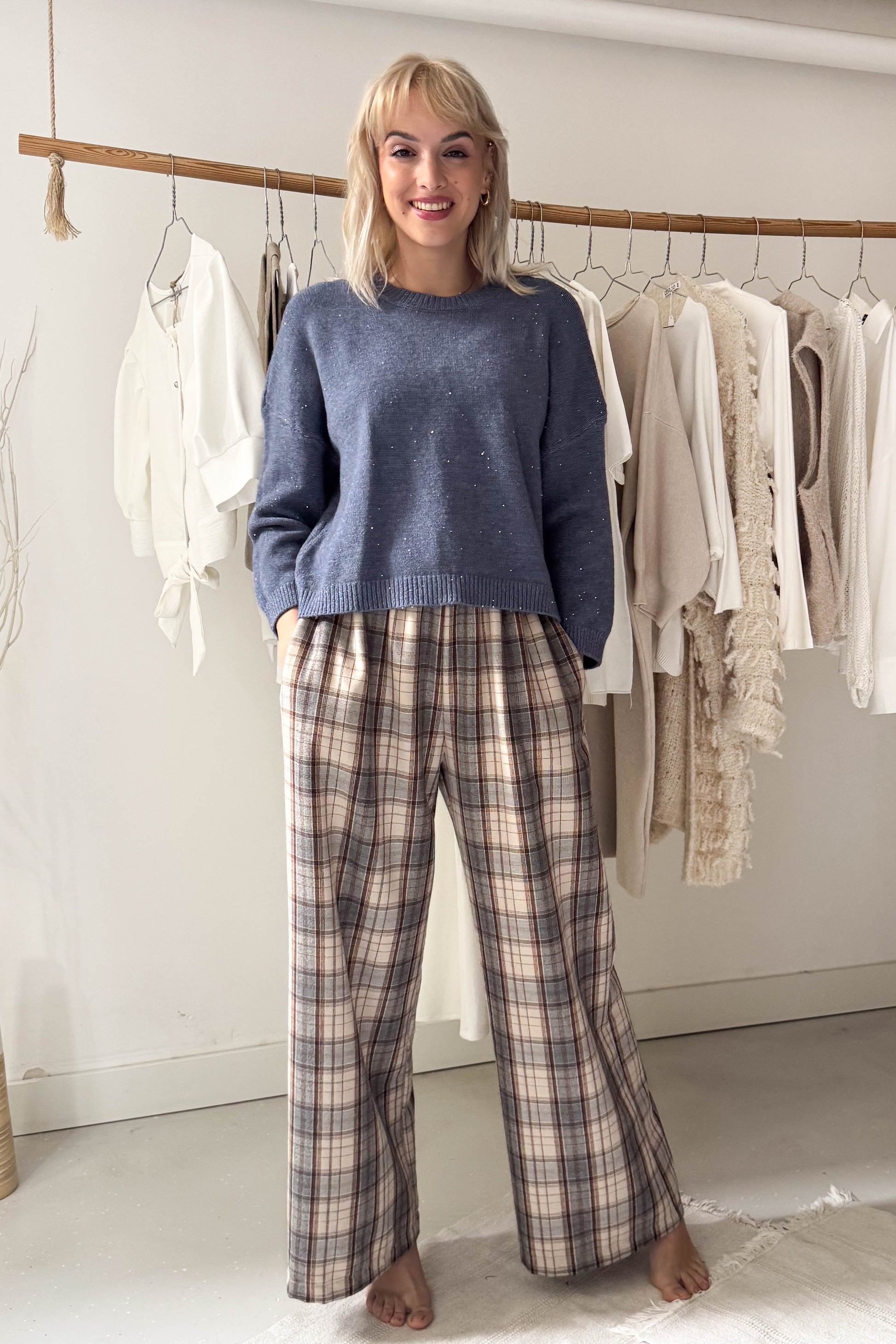 Round neck, long sleeves, dropped shoulders knitted sweatshirt in poppy blue. Sparkling design with tiny sequins. Matching neck, sleeve ends and bottom.