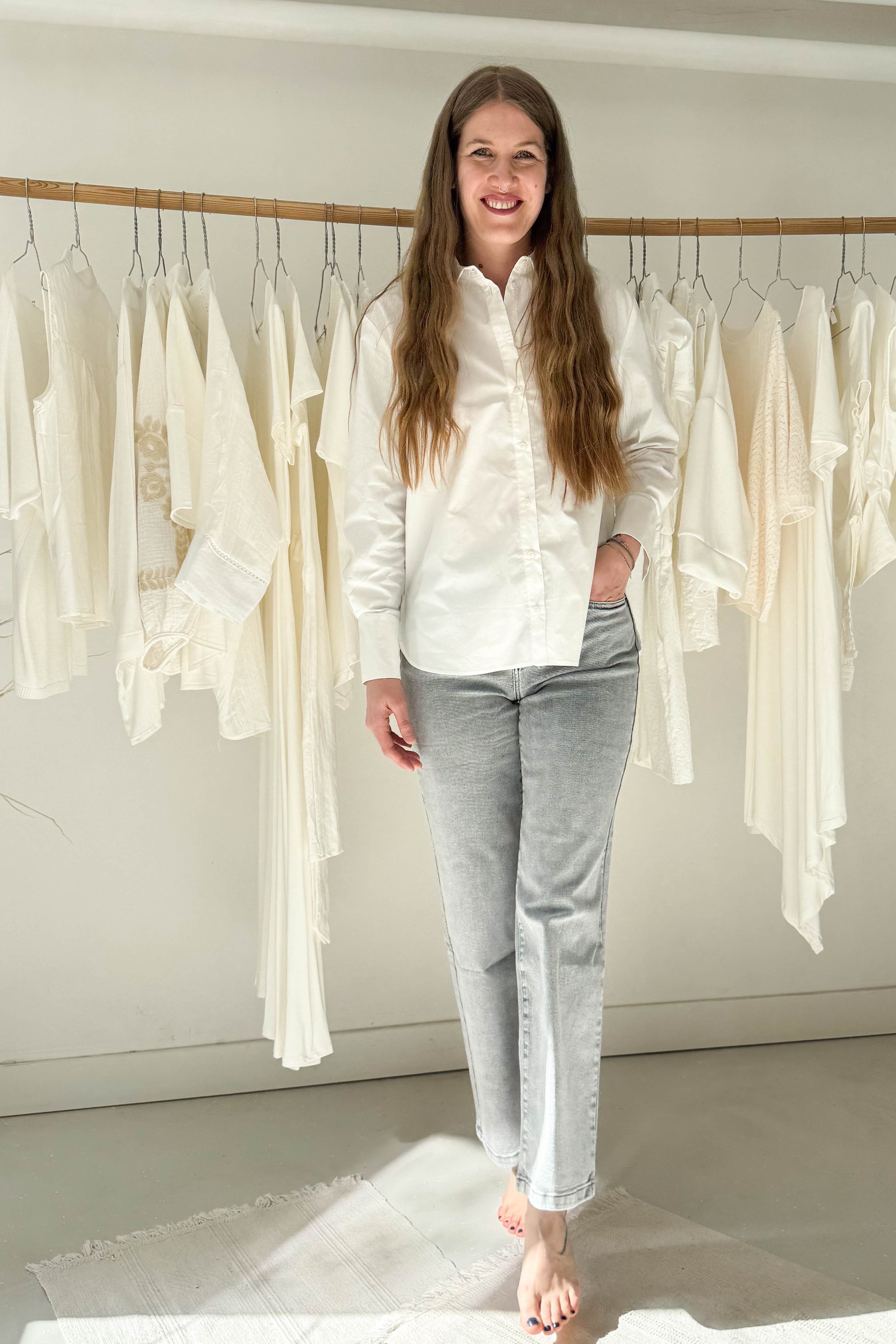 A collared, long-sleeved, wide-cut, white cotton shirt. It closes in front with thick but small buttons.