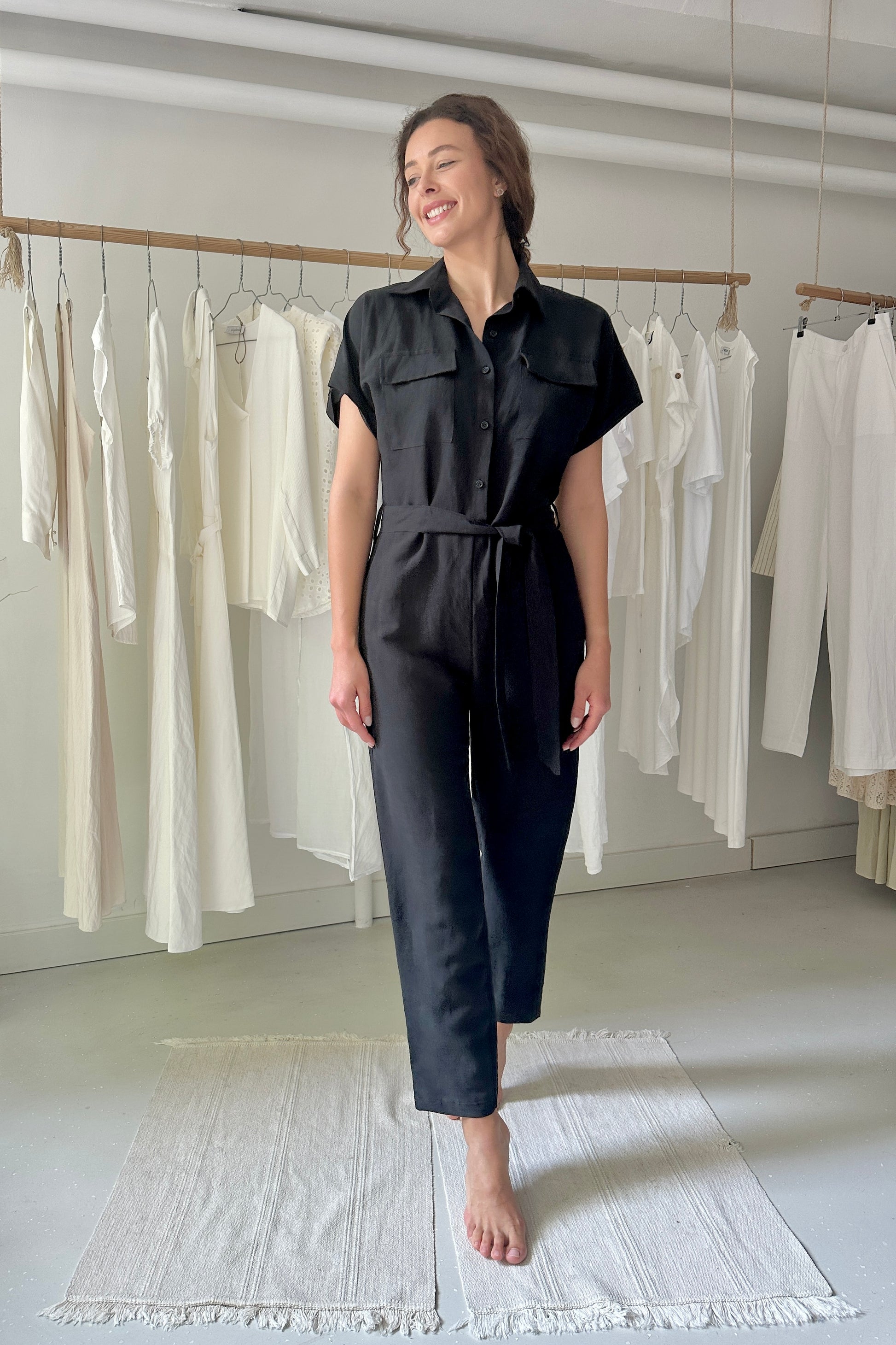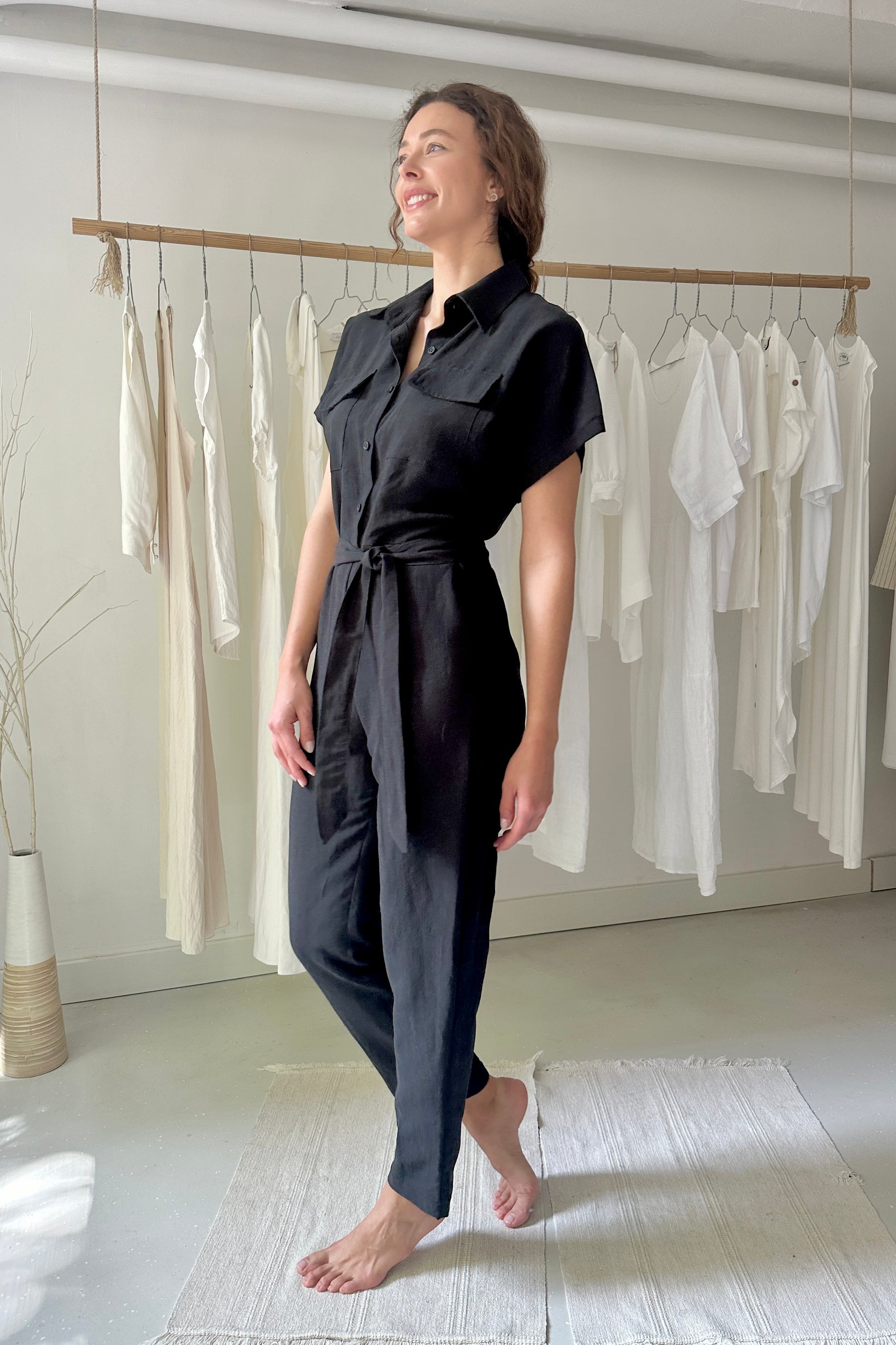 Short-sleeved overalls made of a linen-viscose blend with buttons and a tie. Ideal for taller girls due to the length of the pants, but the bottom can also be rolled up. The model is 177 cm tall and wears size M.