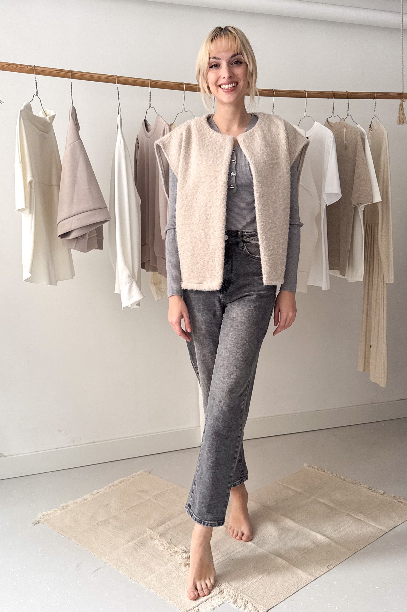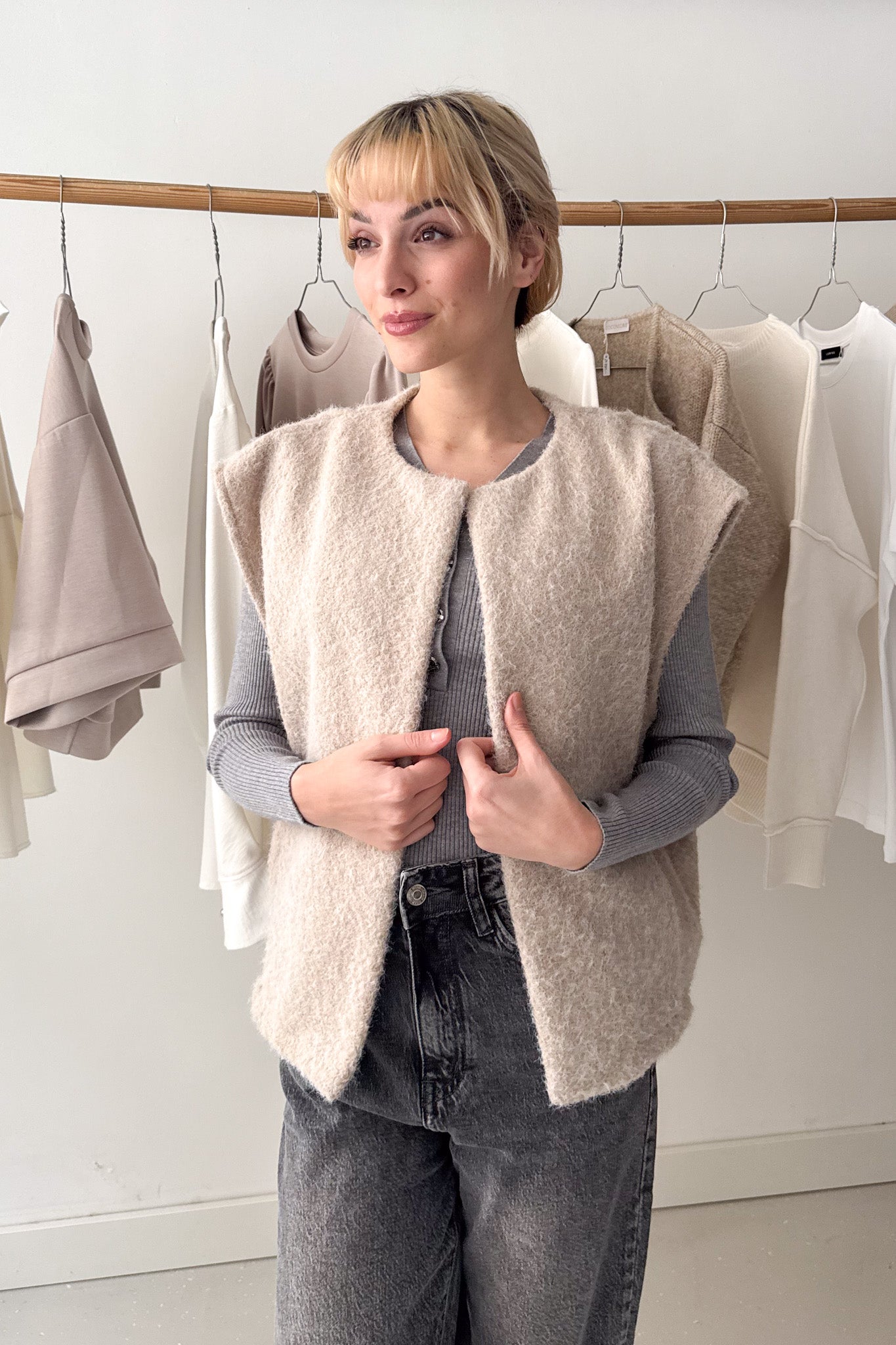 Puha, oversize, szőrös mellény mandulabarna színben.
