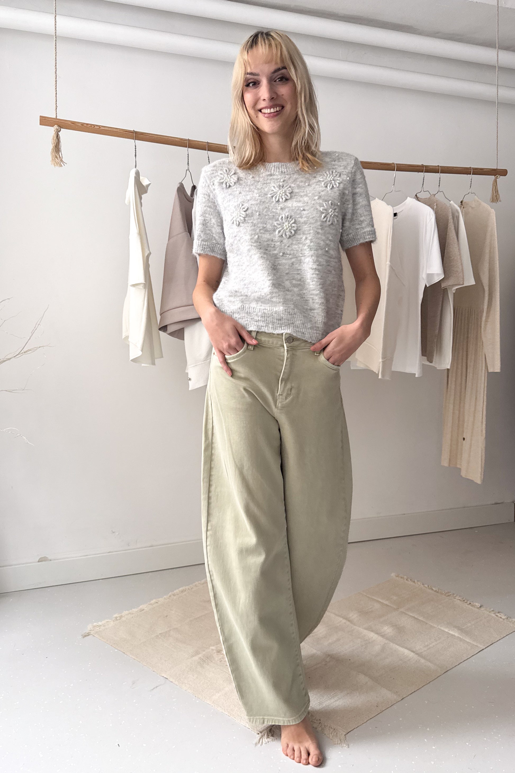 Kerek nyakú, rövidujjú, laza fazonú, szürke kötött felső. Elöl kötött virágok és gyöngy díszítéssel van ellátva. A nyakán, az ujjak végén és alul passzés.ú
