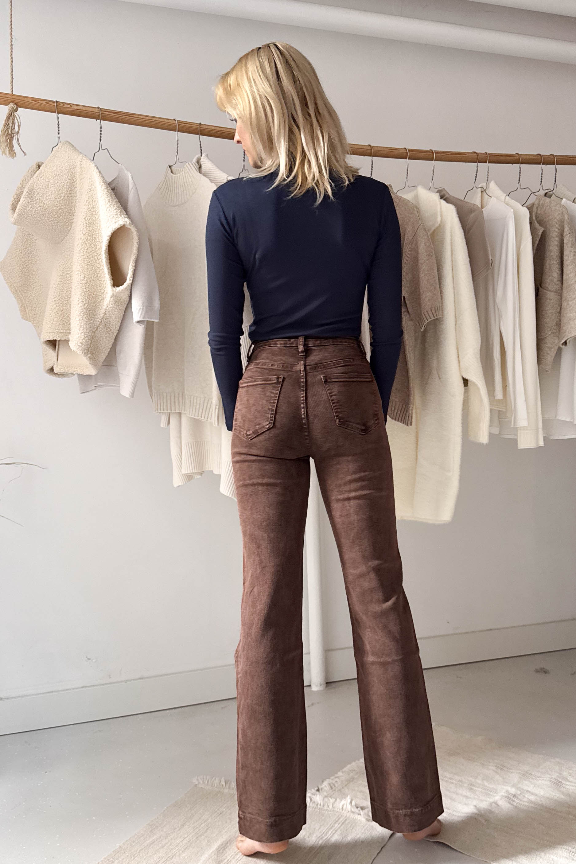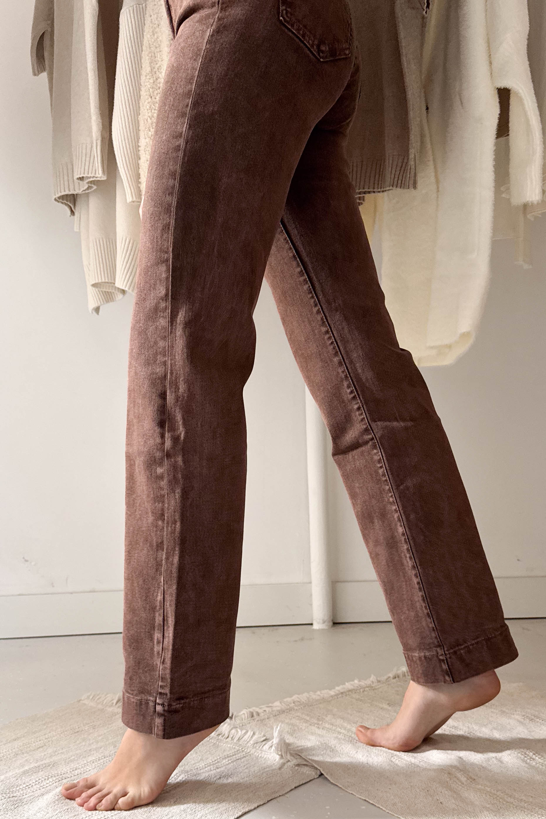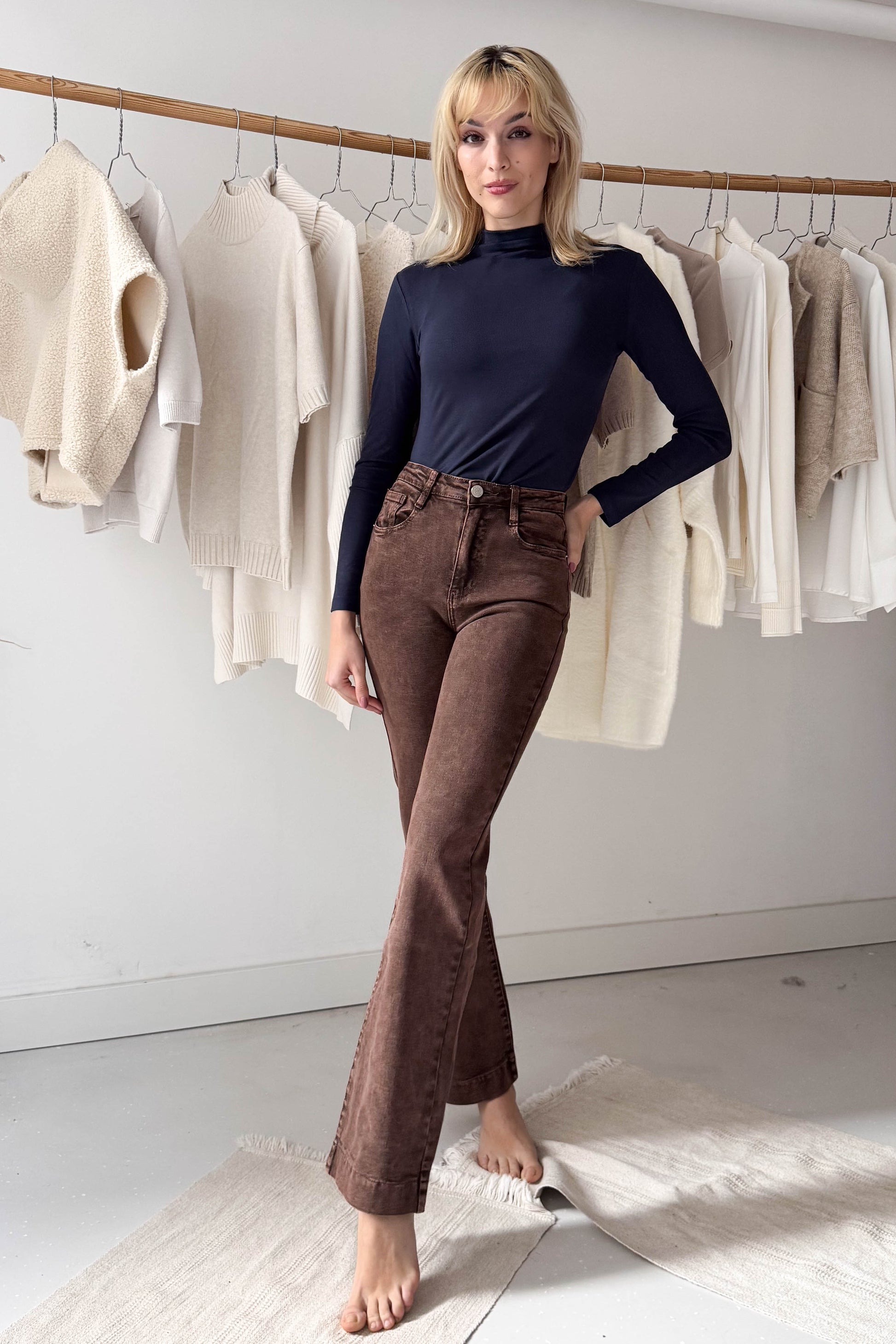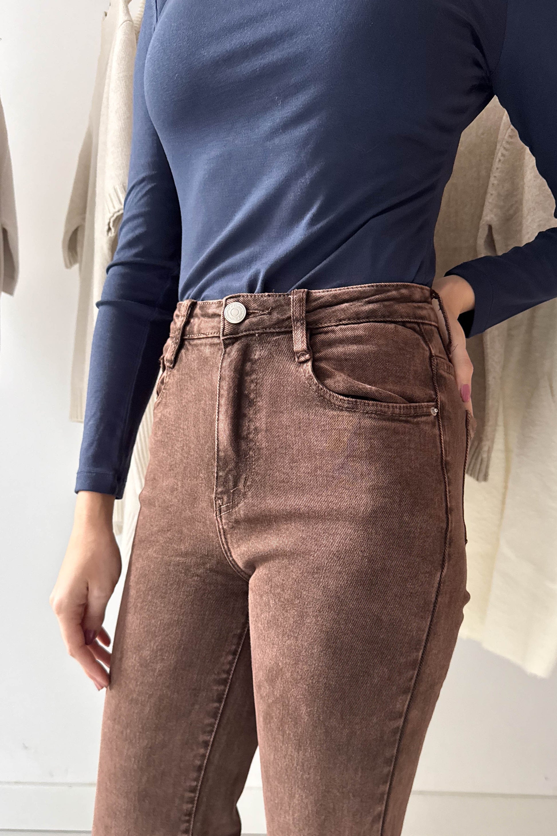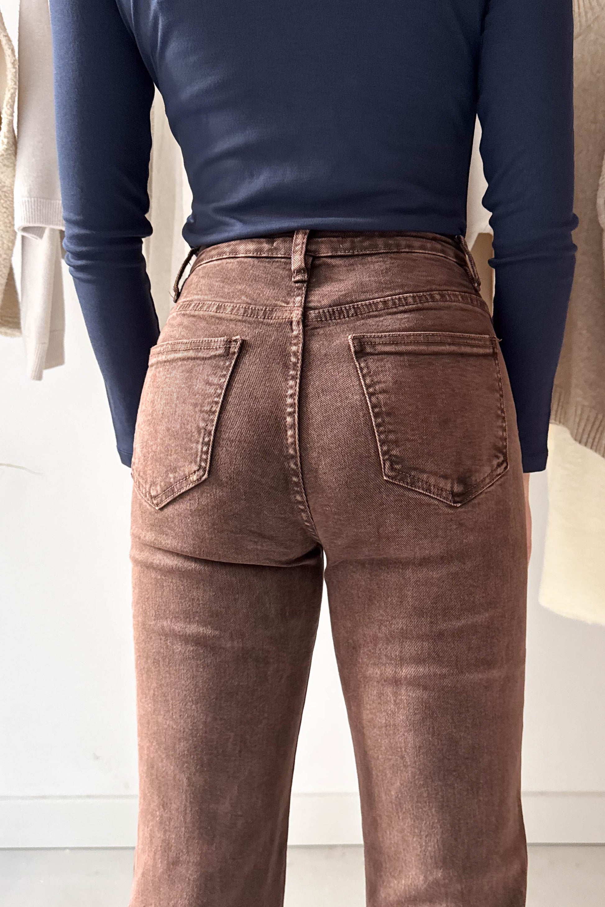 Wide leg fazonú farmer nadrág, rozsdabarna színben. Rugalmas anyagú, fokozatosan bővülő A-vonalú szabás.