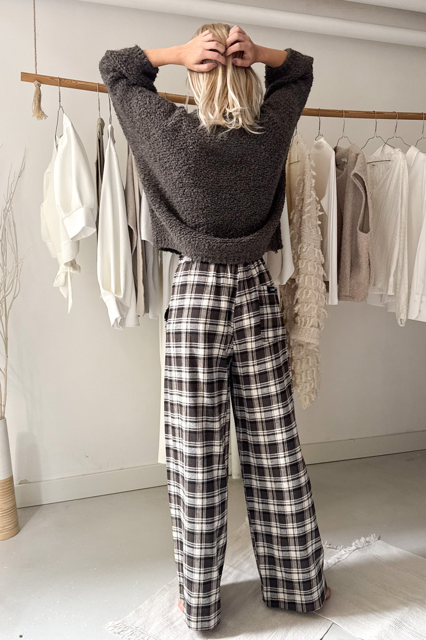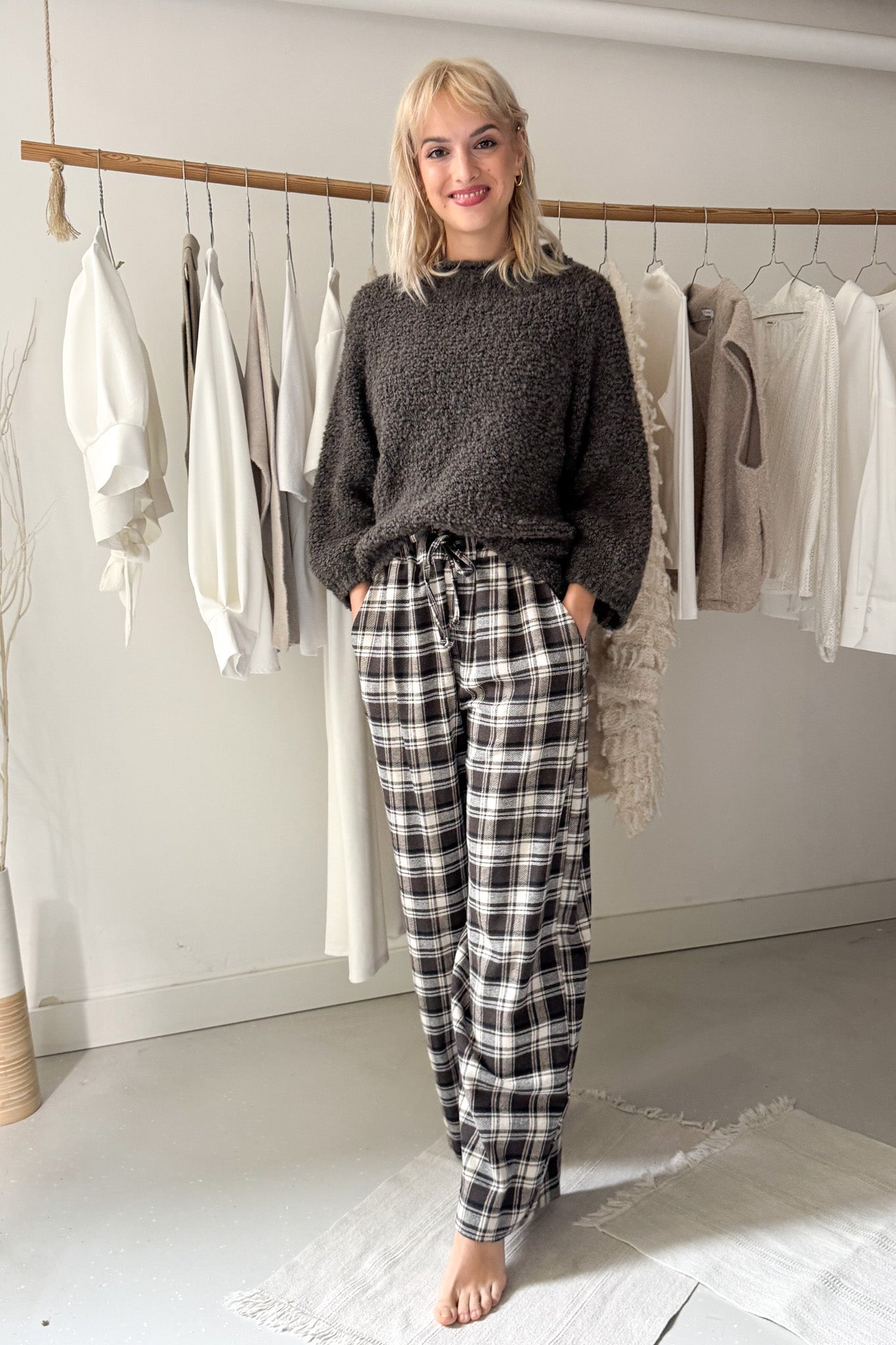 Buklé hatású, puha, lazán kötött felső. Állónyakú, 3/4-es ujjú fazon. A nyaka, az ujjak vége és a derékrésze passzés.