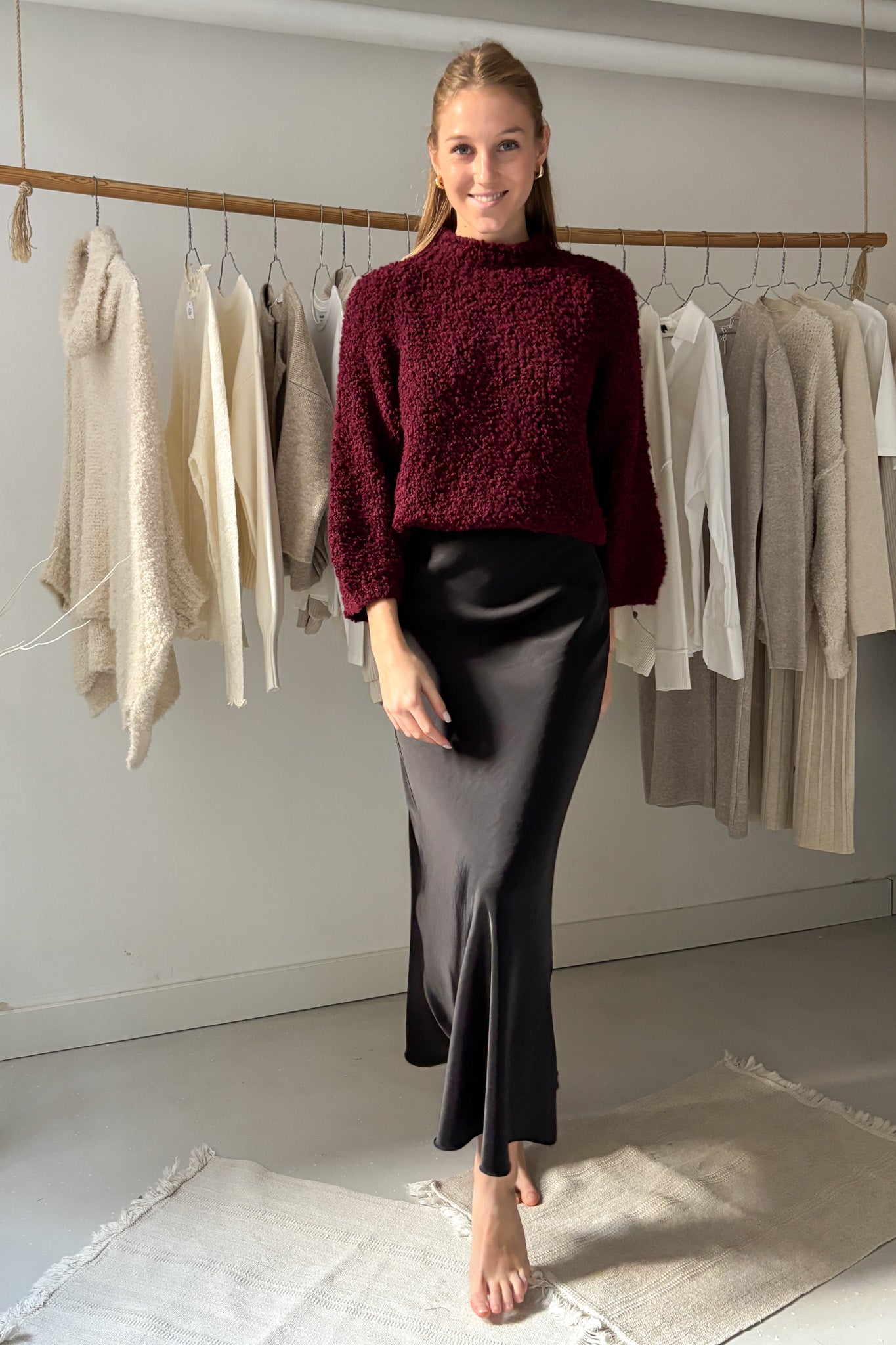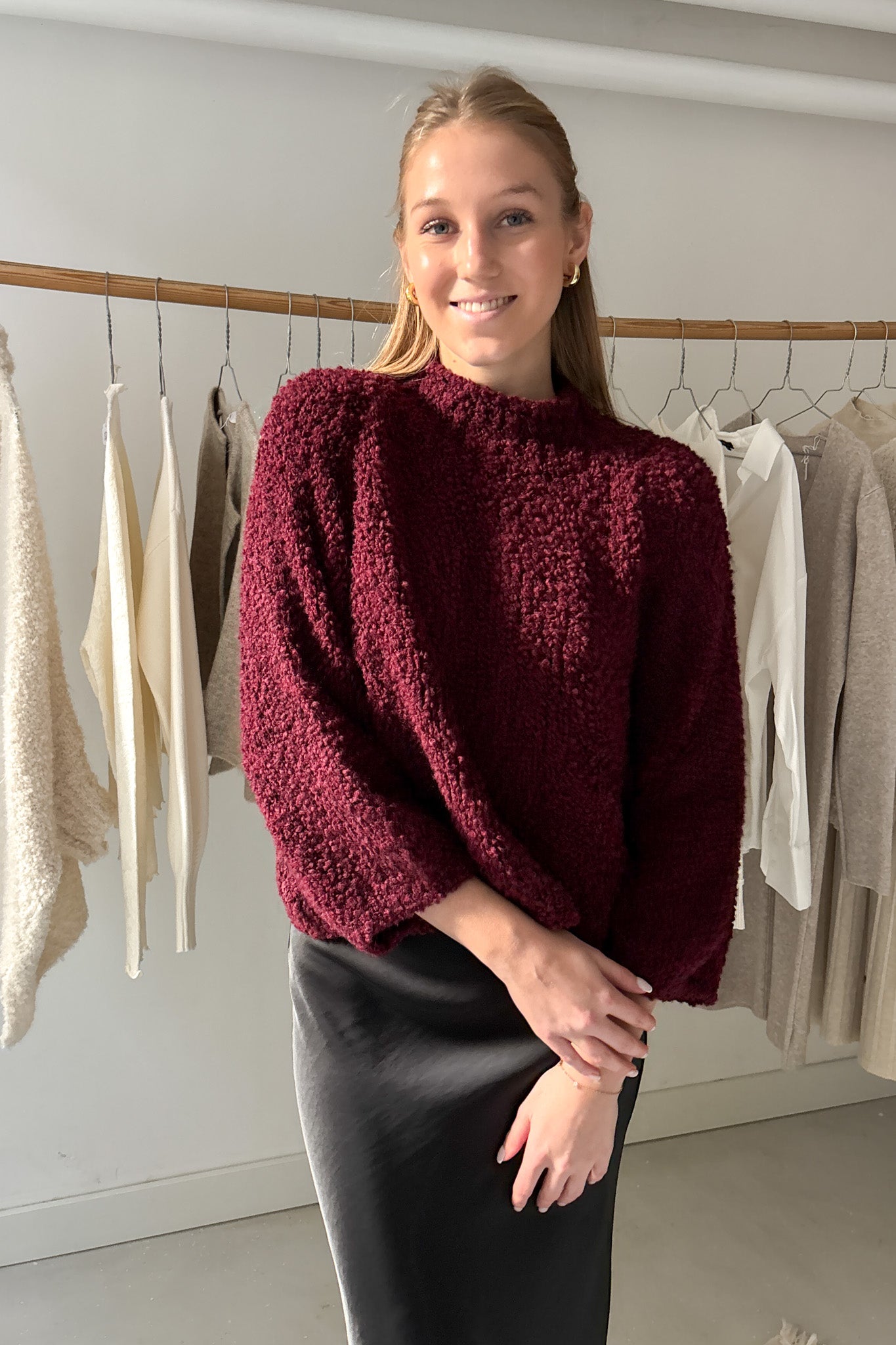 Buklé anyagú, puha, lazán kötött felső. Magasított nyakú, 3/4-es ujjú fazon. A nyaka, az ujjak vége és alul passzés.
