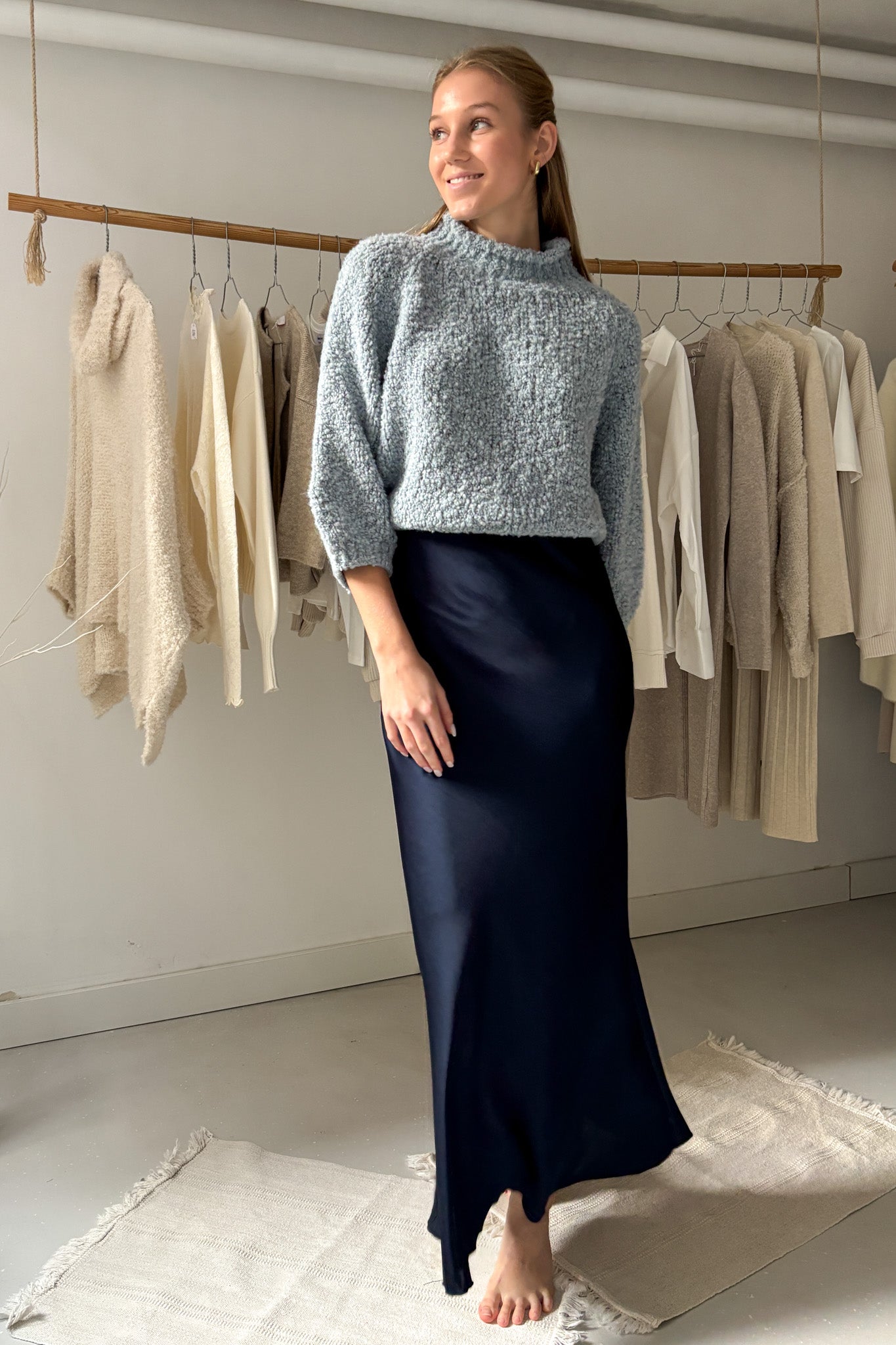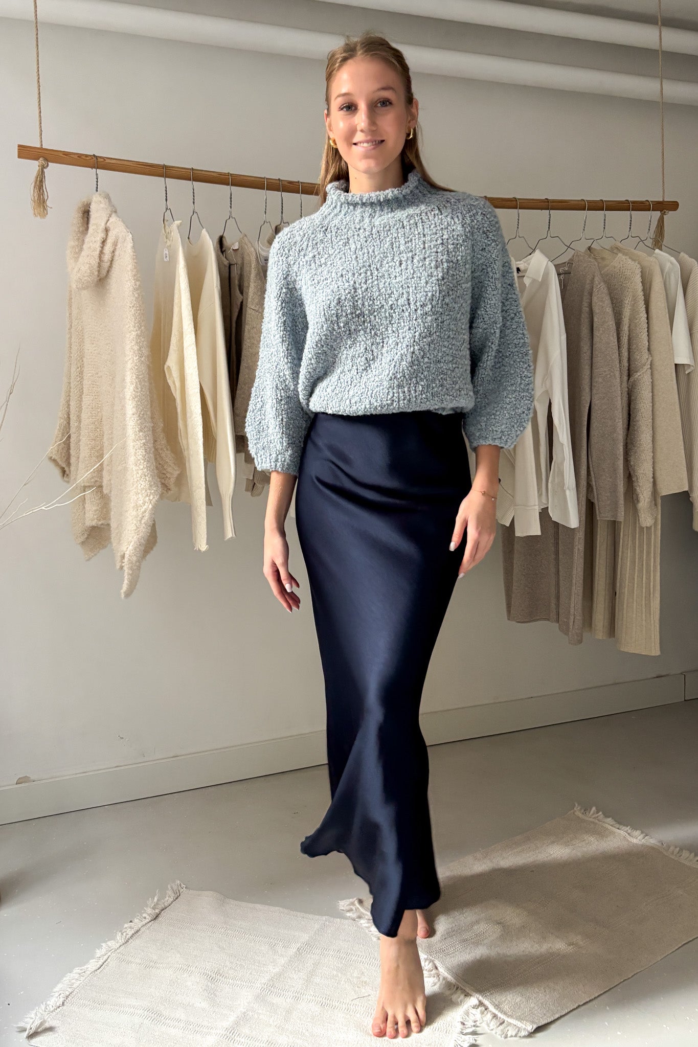 Buklé anyagú, puha, lazán kötött felső. Magasított nyakú, 3/4-es ujjú fazon. A nyaka, az ujjak vége és alul passzés.