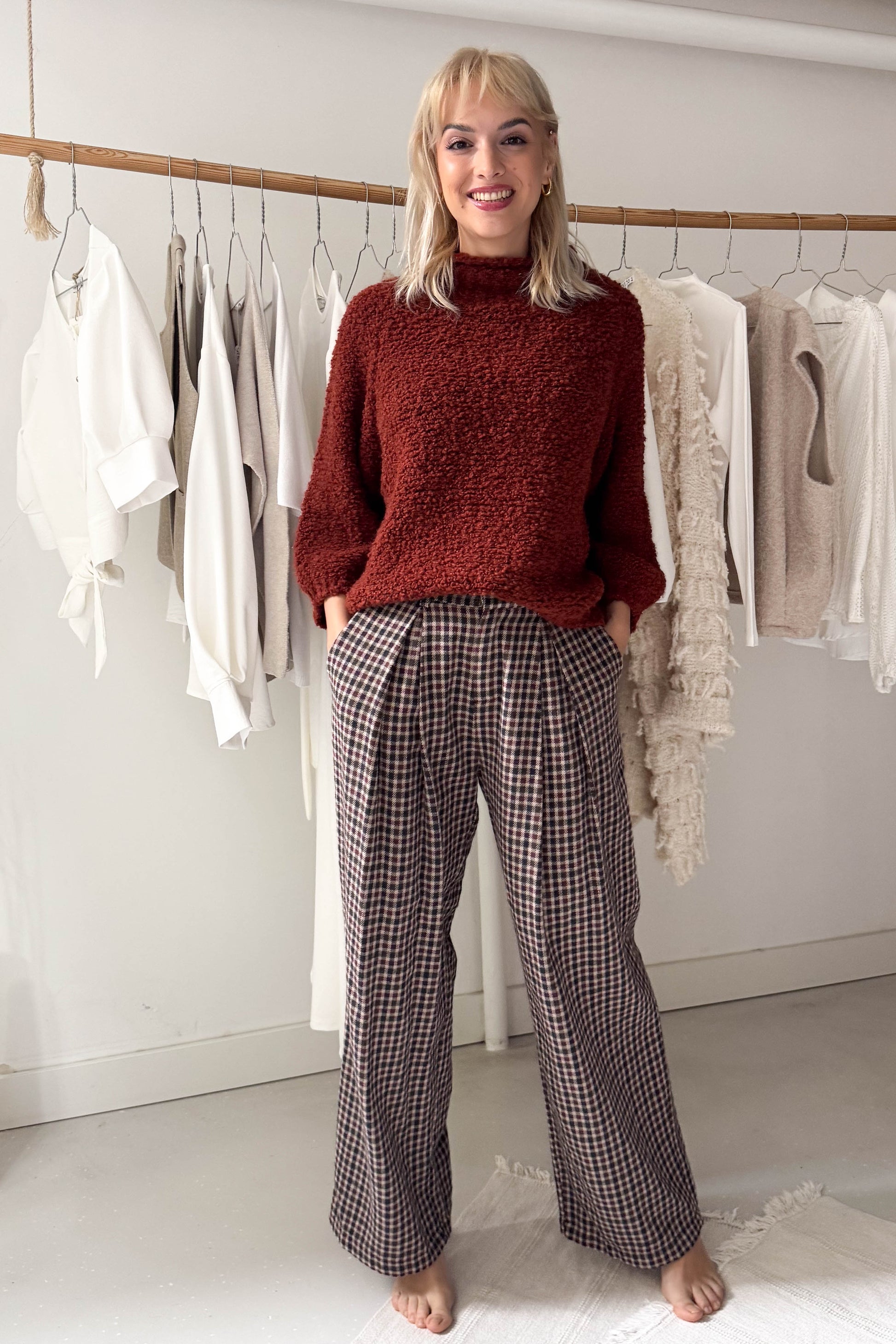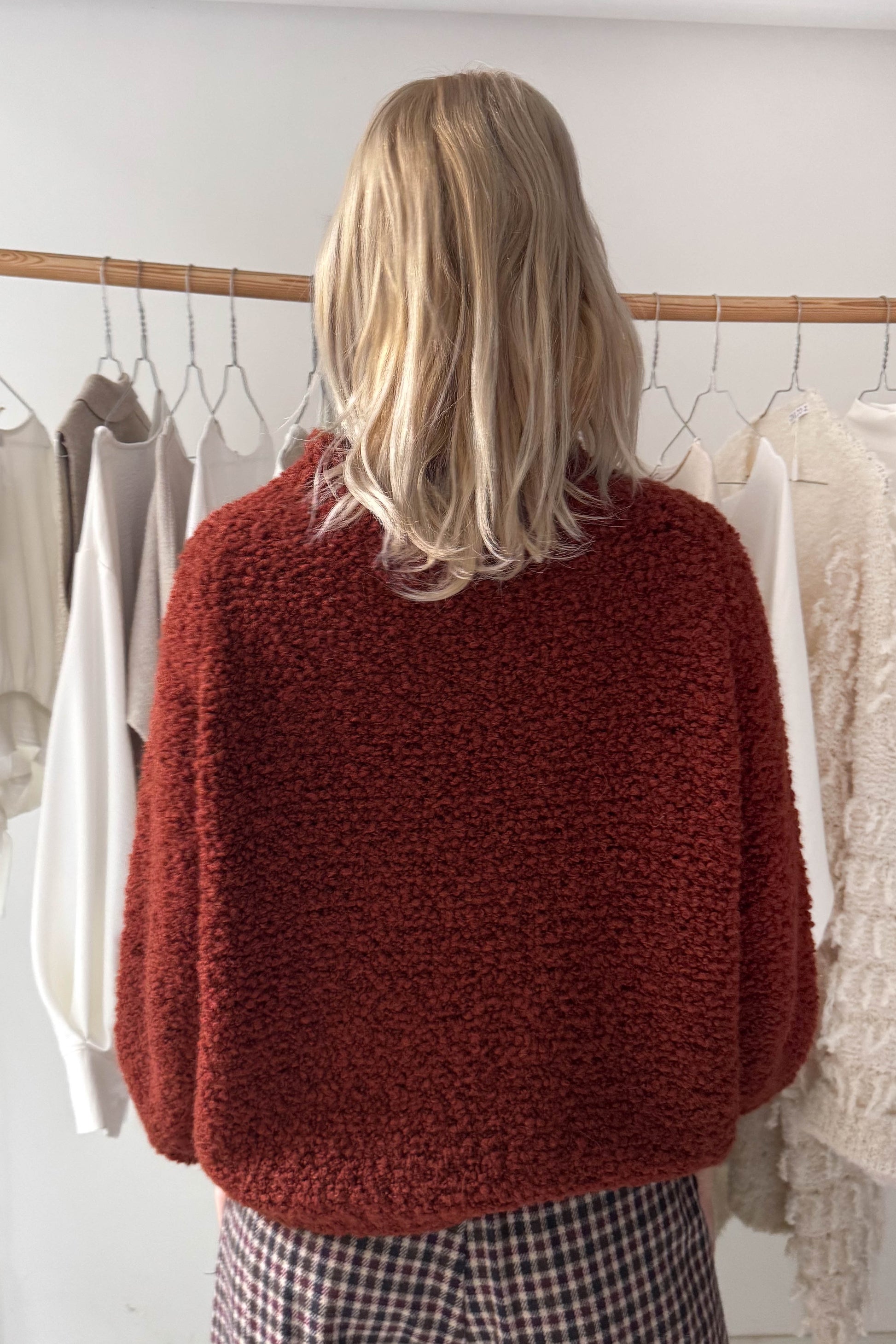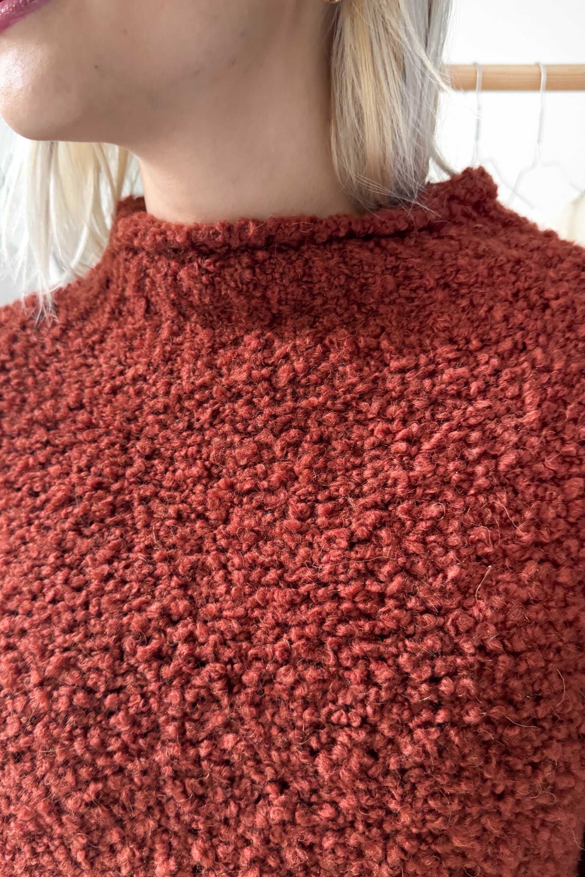 Buklé hatású, puha, lazán kötött felső. Magas nyakú, ejtett vállú, 3/4-es ujjú fazon. A nyaka, az ujjak vége és alul passzés.