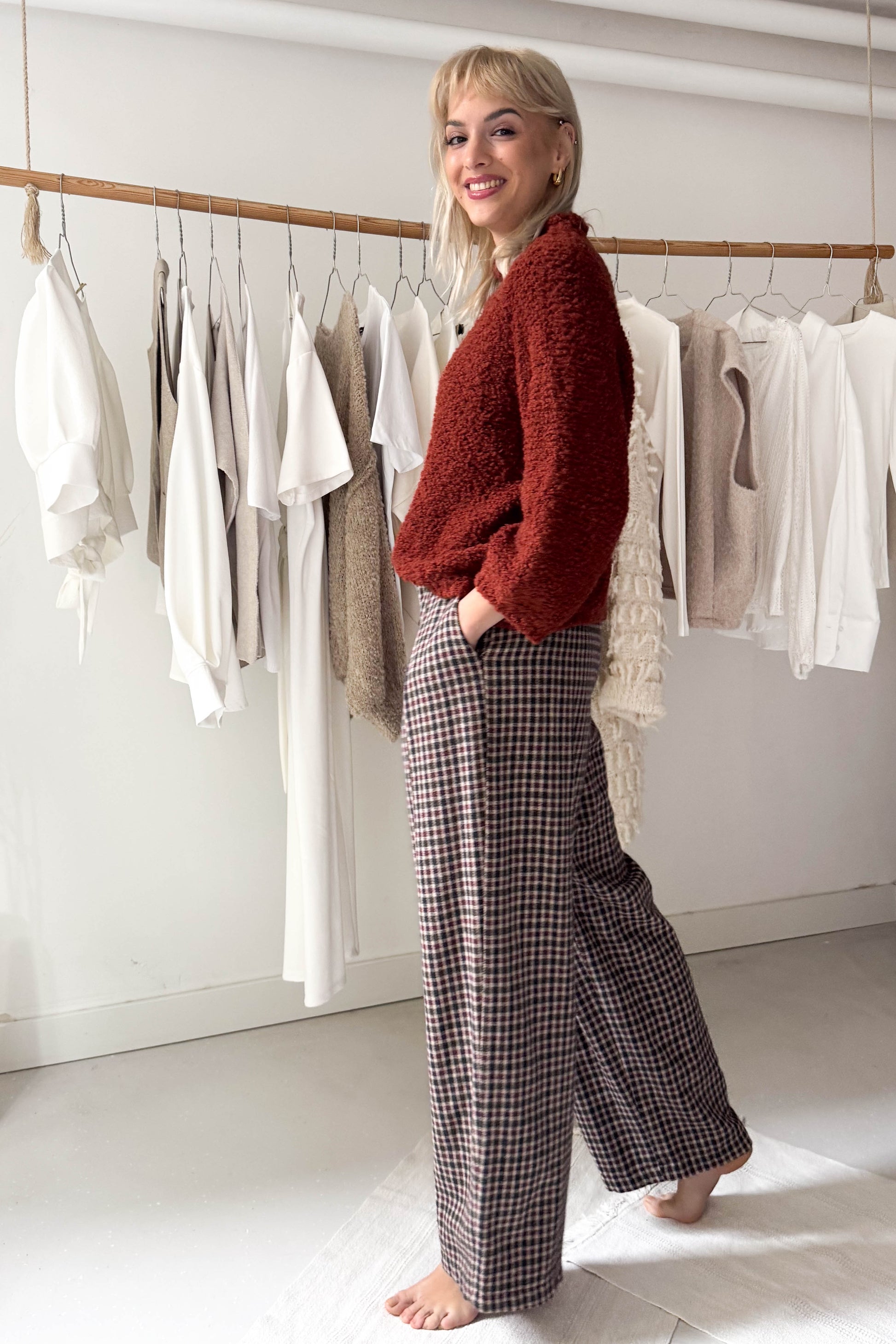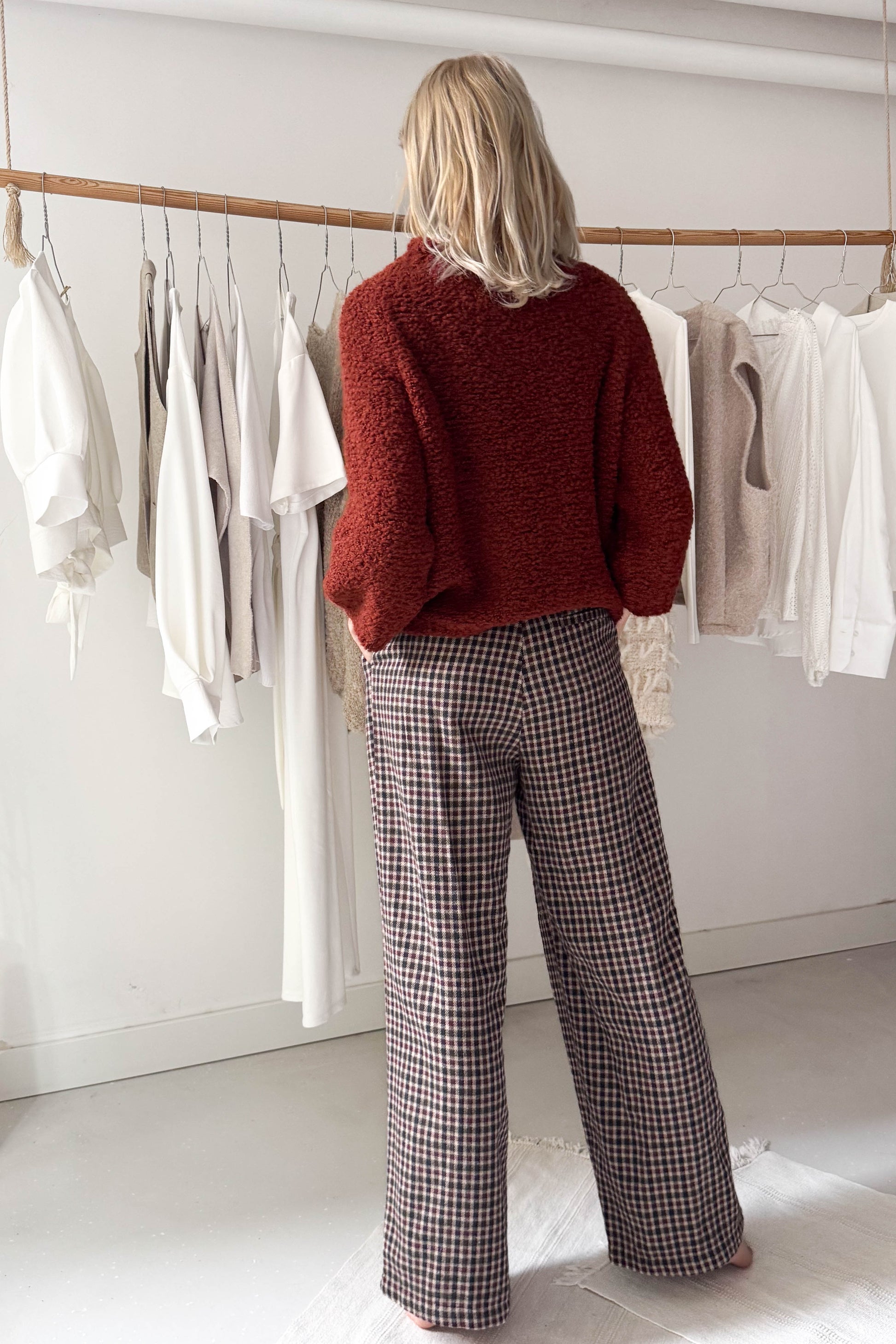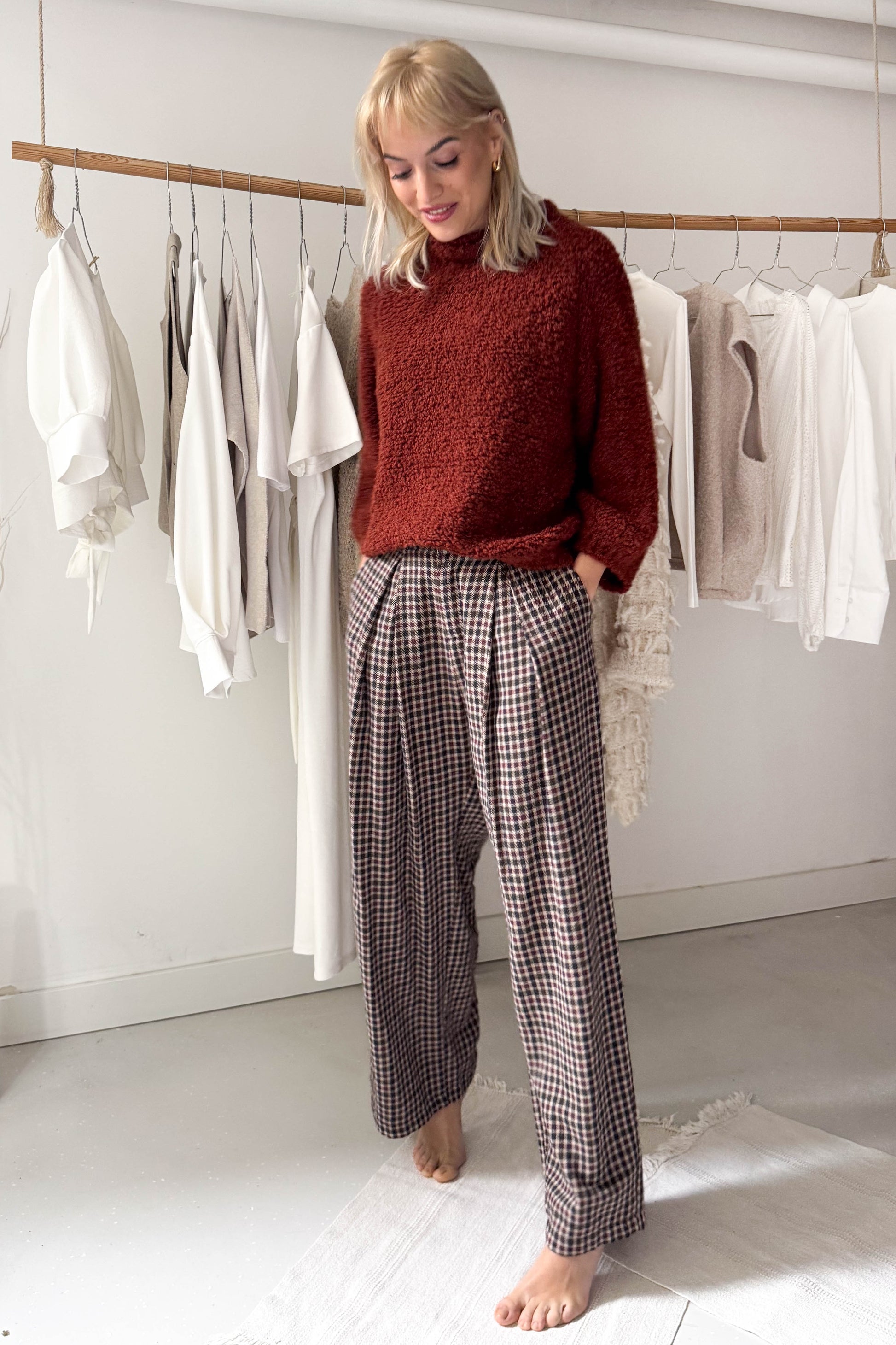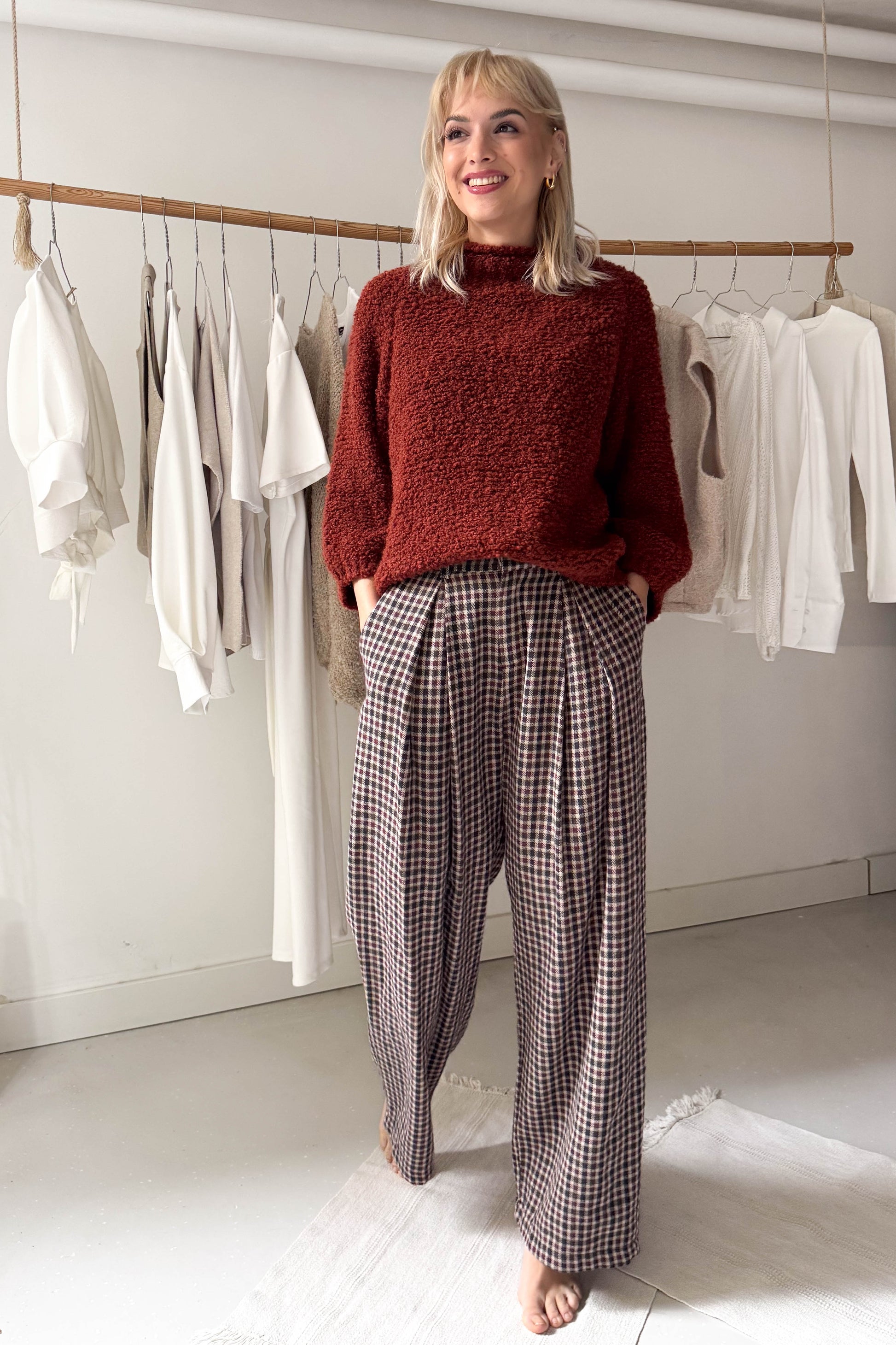 Buklé hatású, puha, lazán kötött felső. Magas nyakú, ejtett vállú, 3/4-es ujjú fazon. A nyaka, az ujjak vége és alul passzés.