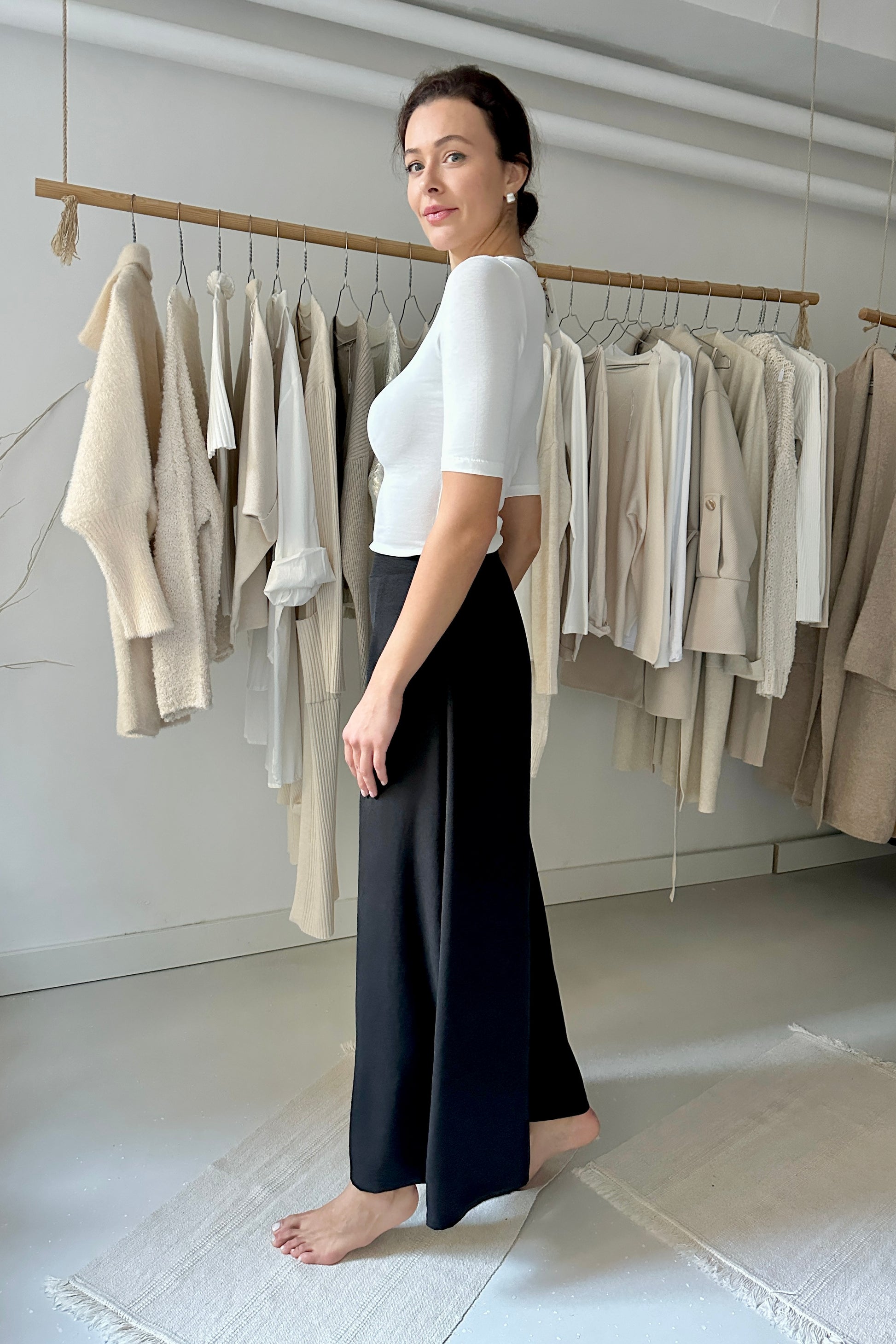 95% pamut, 5% elasztán - pamut jersey. Elasztikus, puha prémium minőségű pamut. Testhezálló szabásának köszönhetően igazán csinos viselet. Gépben 30 fokon mosható. A modell 177 cm magas.