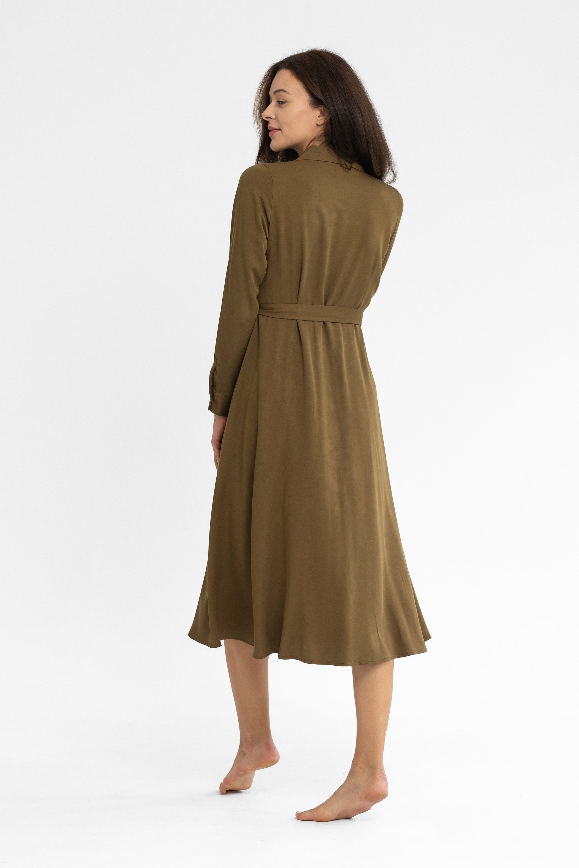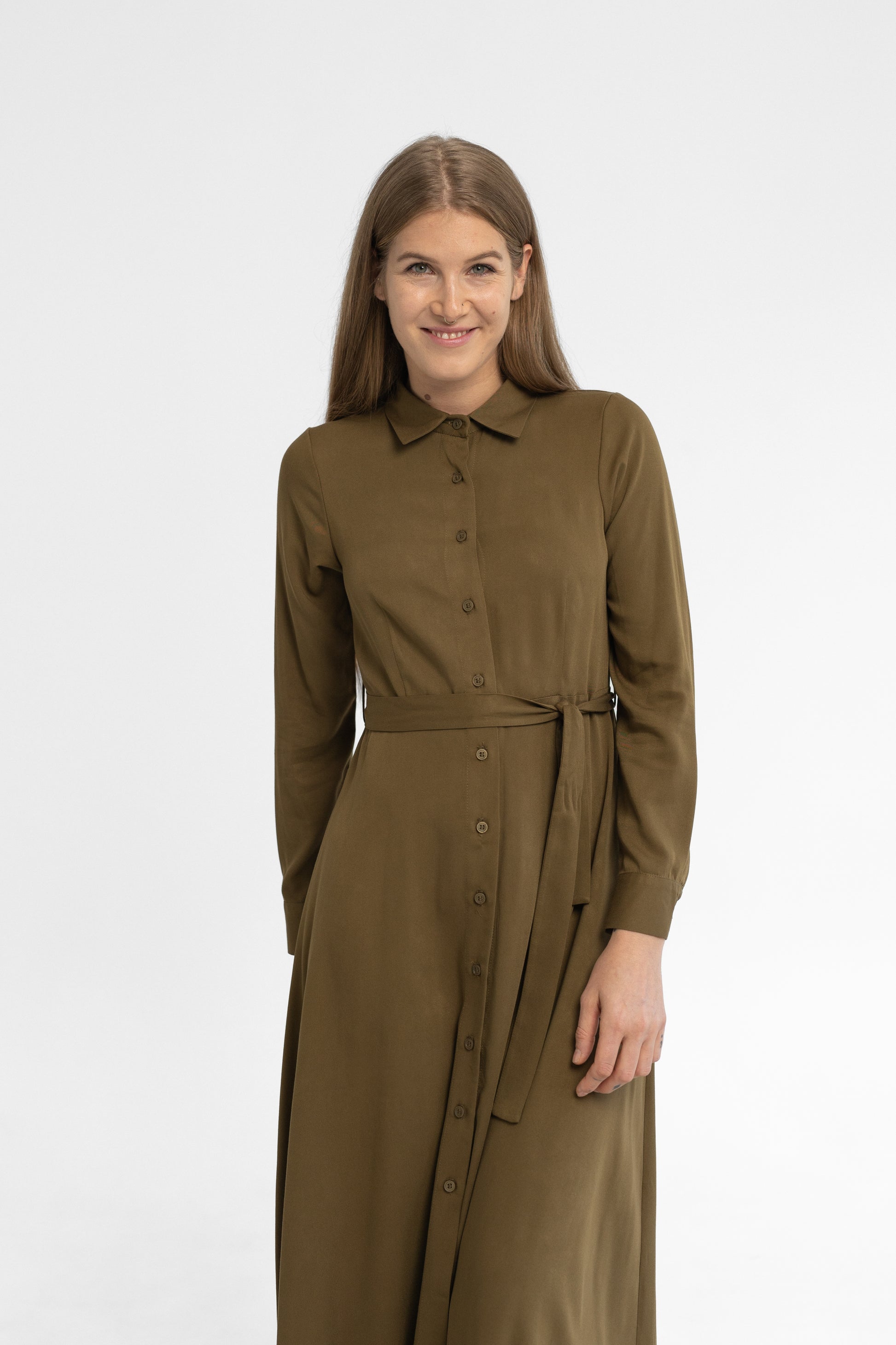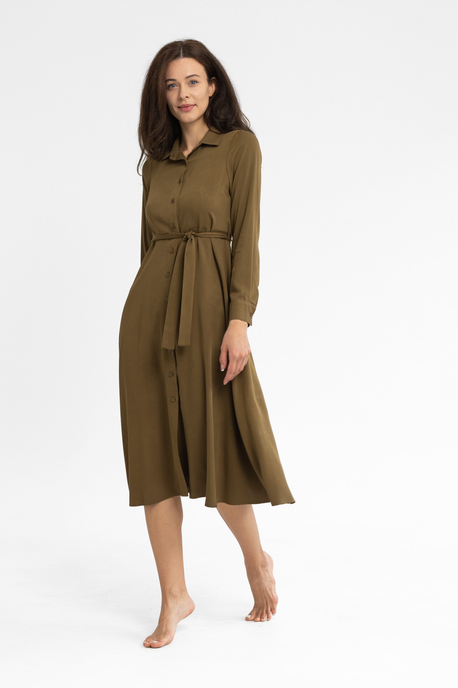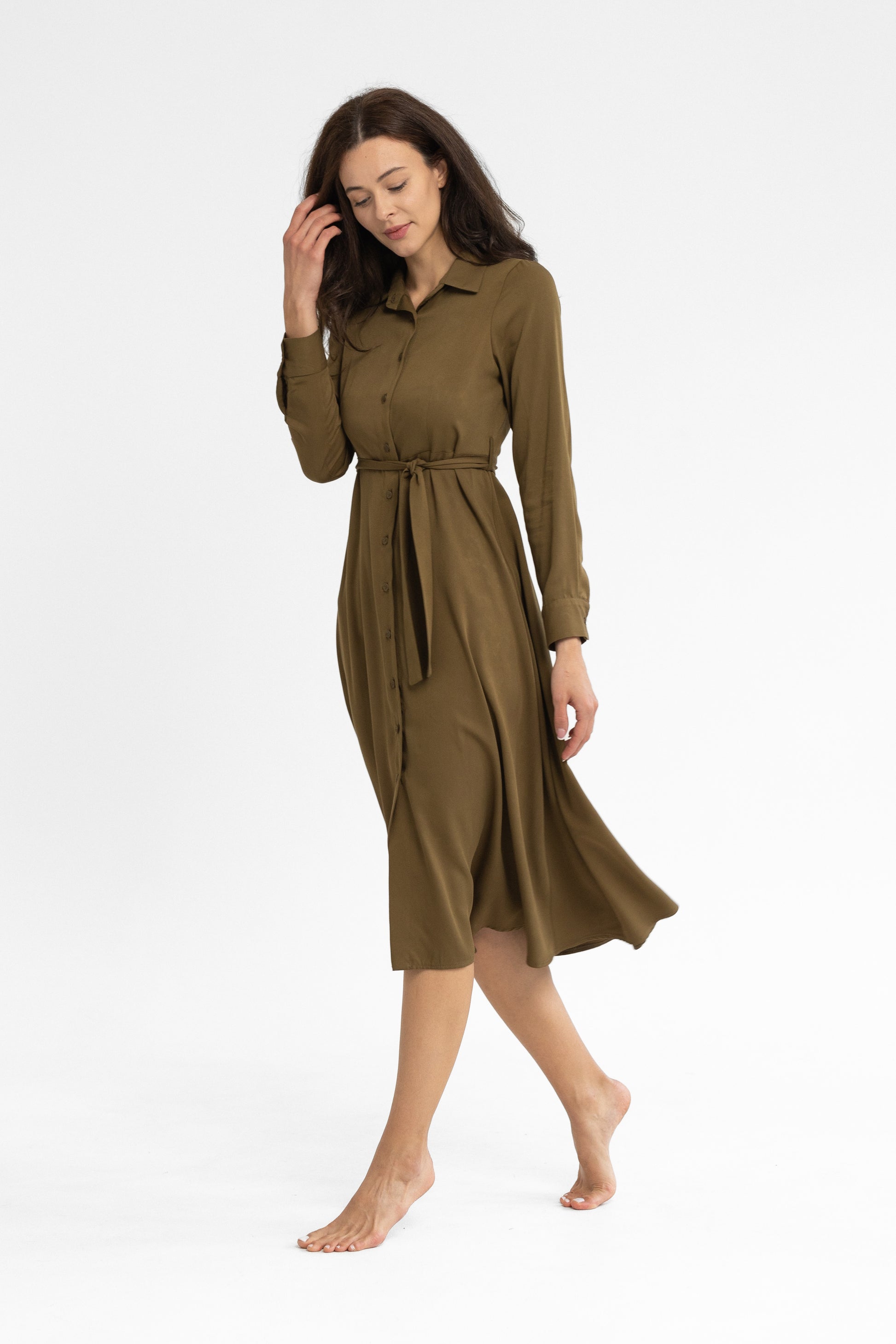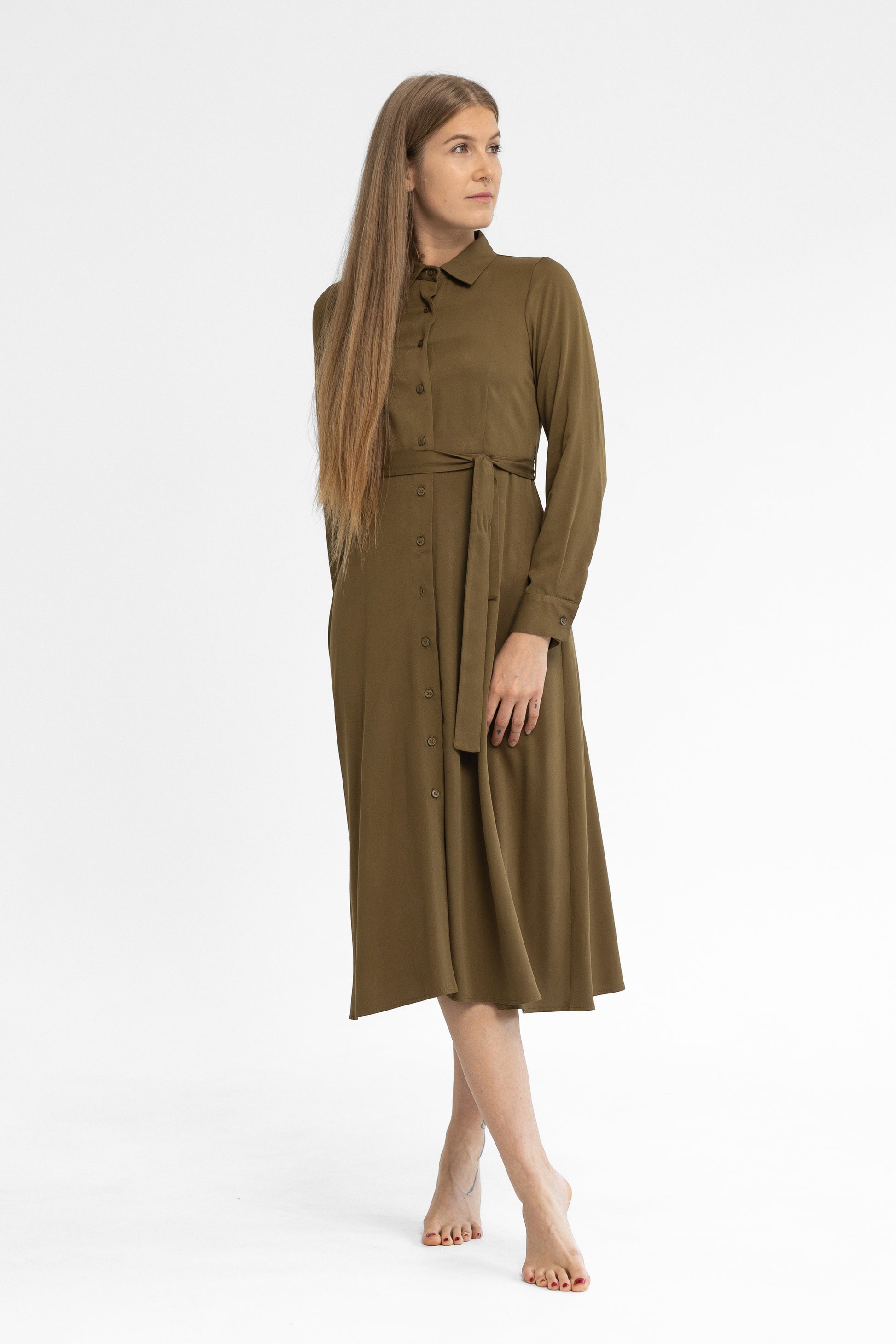 Vékony, szép esésű 100% viszkóz szövet. Hosszú ujjú, elöl végig gombos fazon. Galléros nyakmegoldással, deréktól “A” vonalban bővülő szoknyarésszel. Egy igazán nőies, klasszikus alapdarab. Nyáron ujjtlan verzióban is gyártjuk. Kézzel mosható, fonákján vasalható. A modellek 177 és 174 cm magasak és S méretű ruhát viselnek.