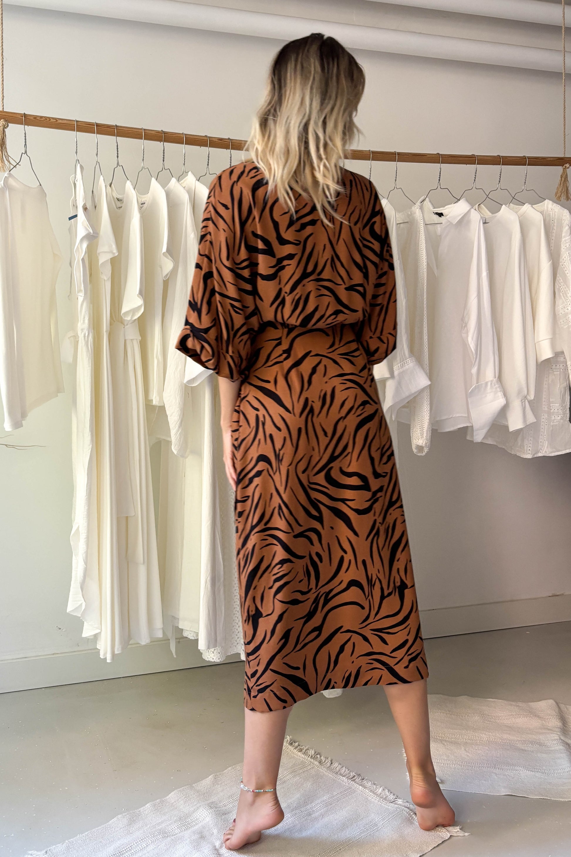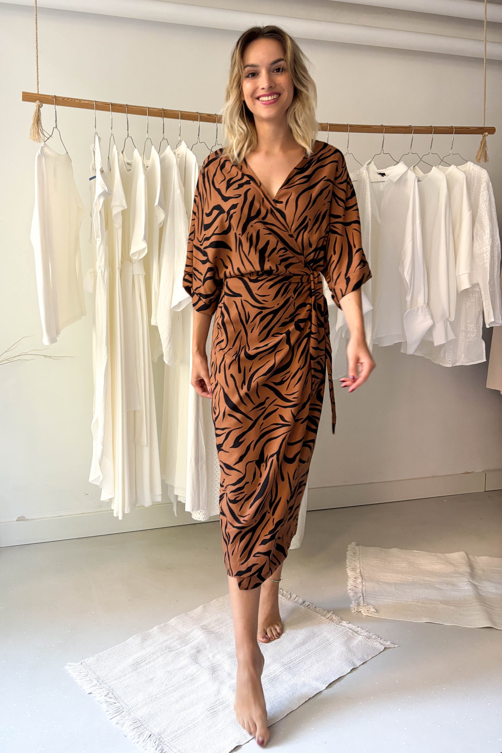 Kimonó ruha tigrismintával. Ejtett vállú, rövidujjú fazon.