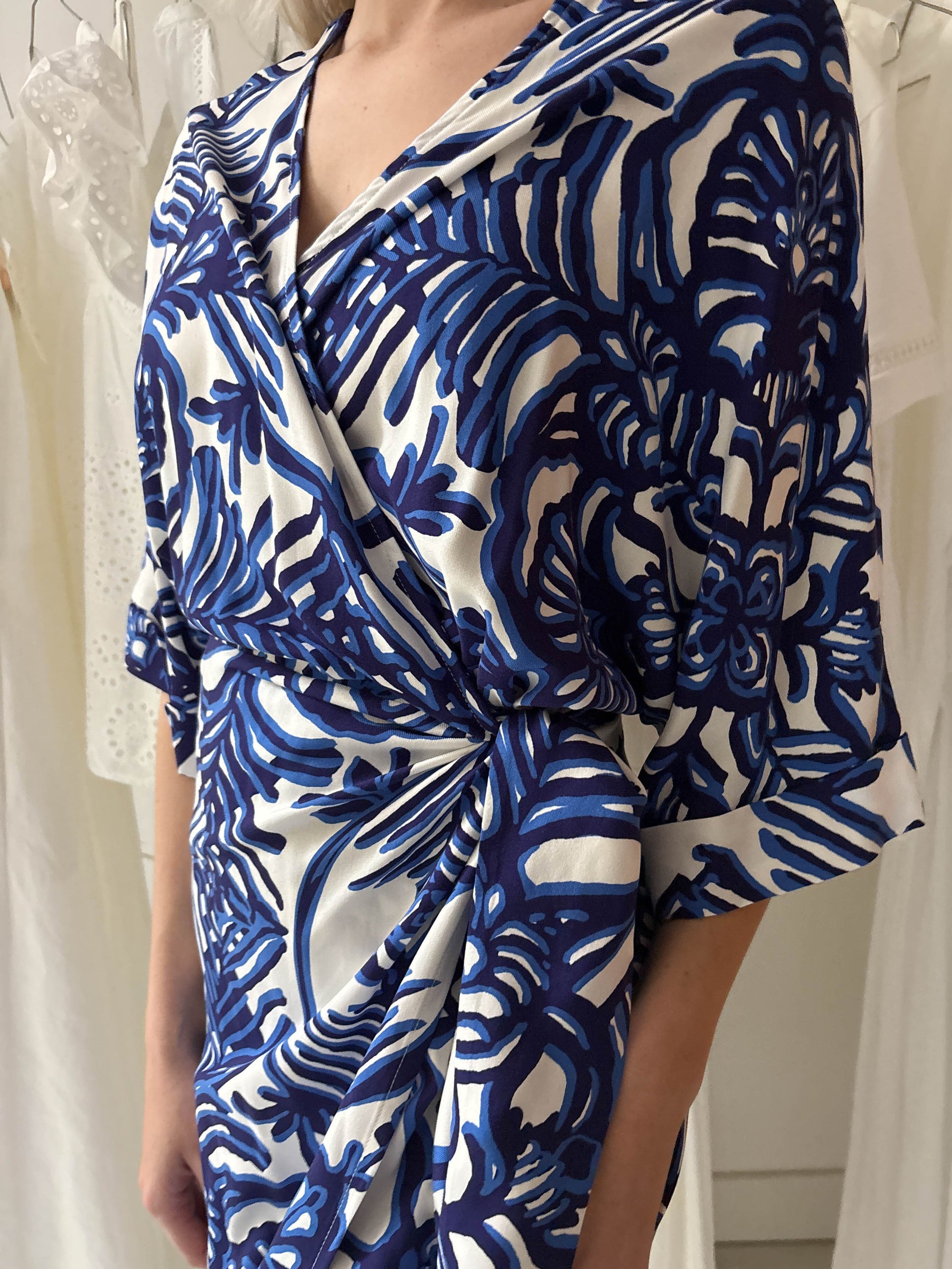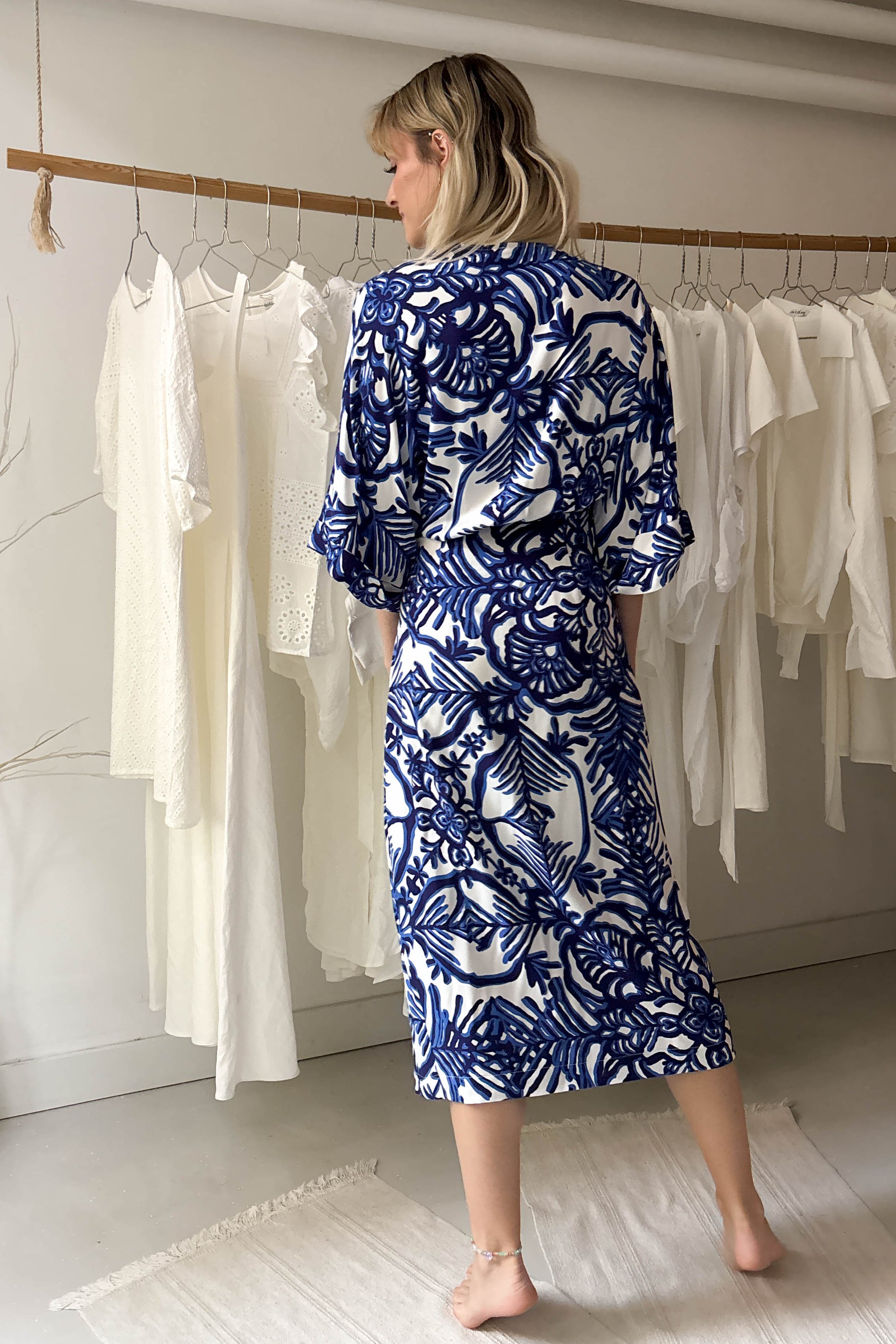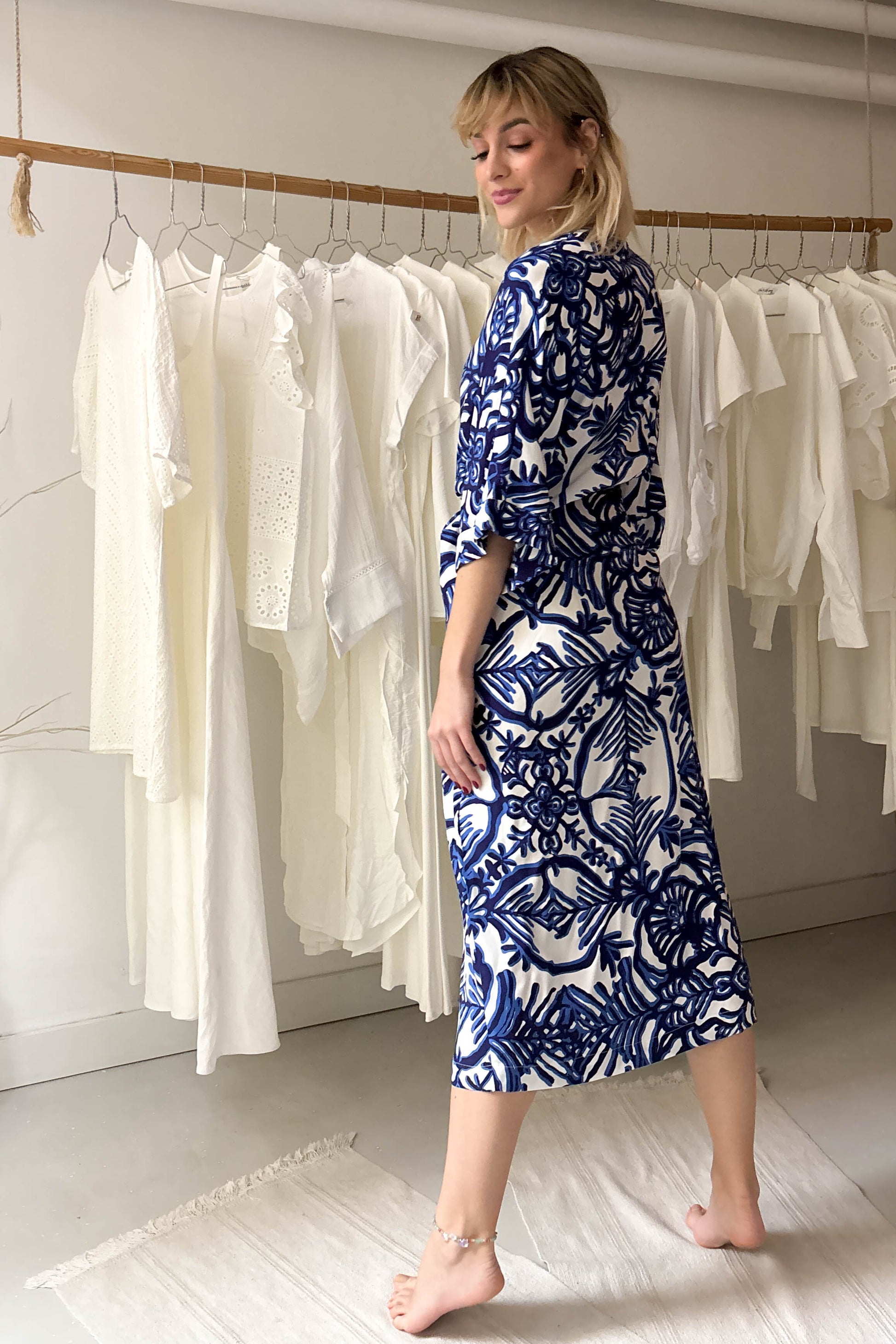 Kimonó ruha sötétkék mintával. Ejtett vállú, rövidujjú fazon.