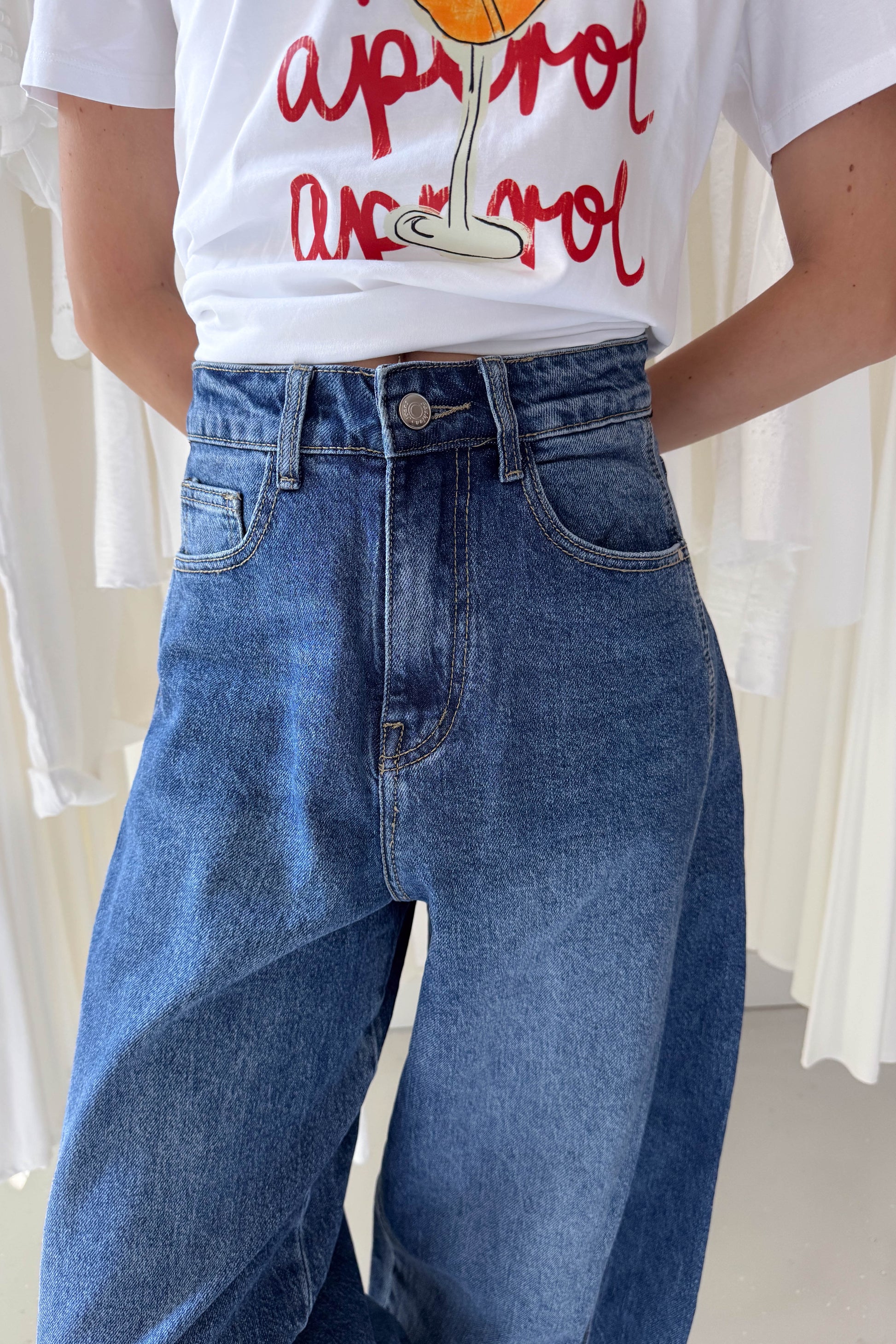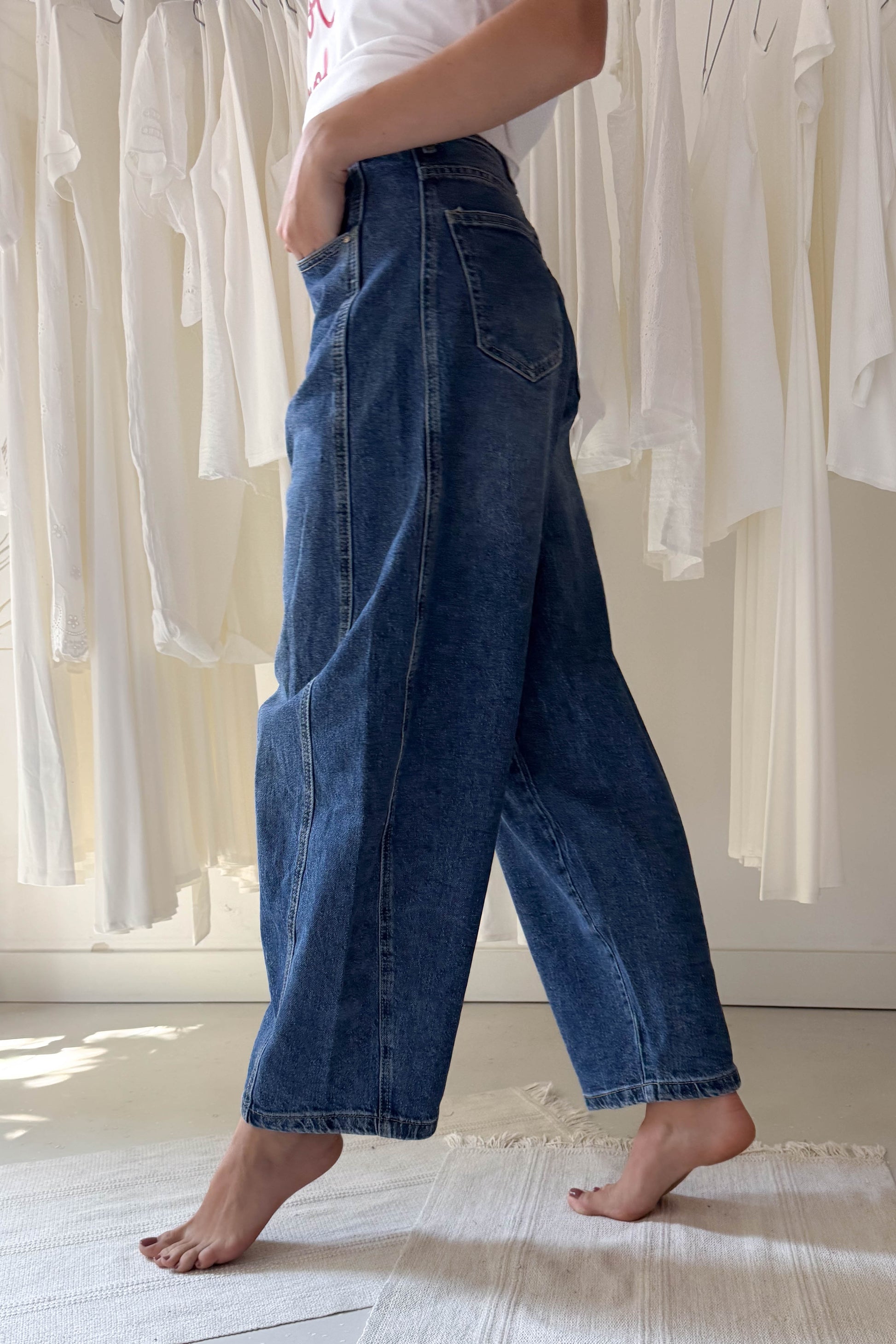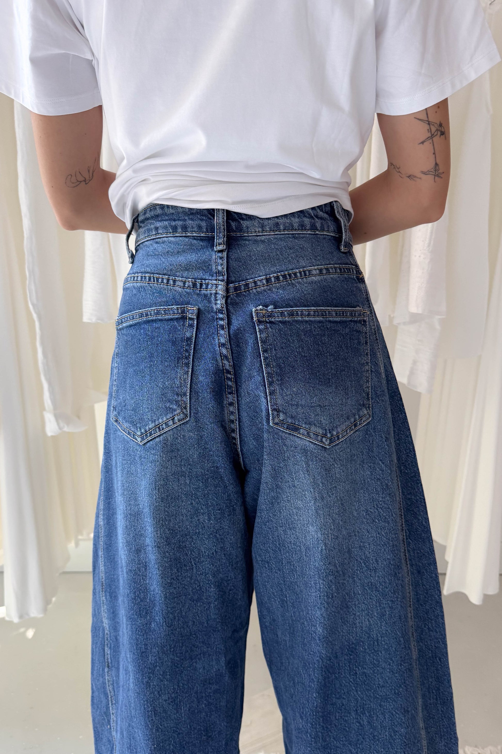 Sötétkék színű, ballon fit szabású farmernadrág. Elől a plusz hosszanti varrás nyújtja a lábakat.