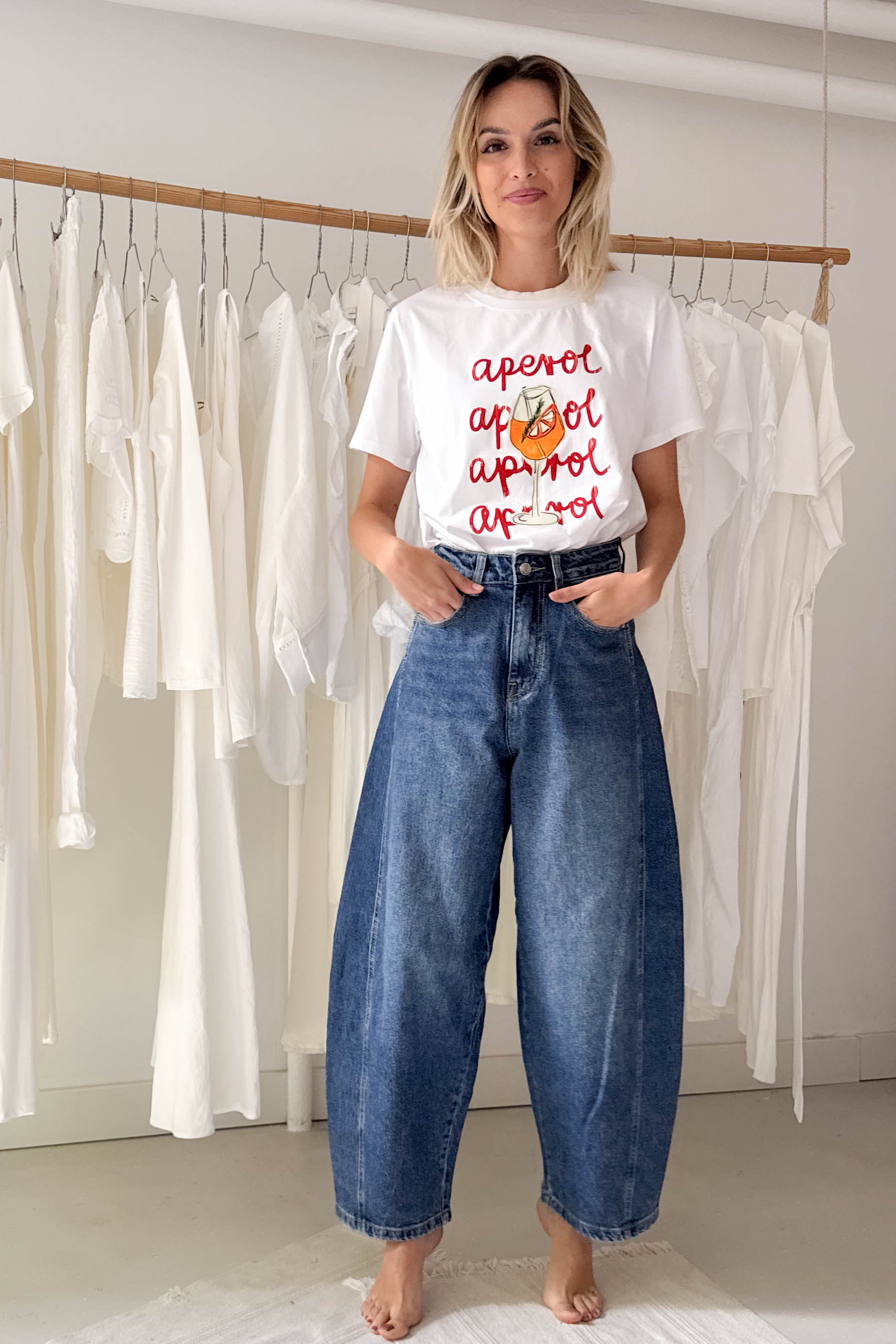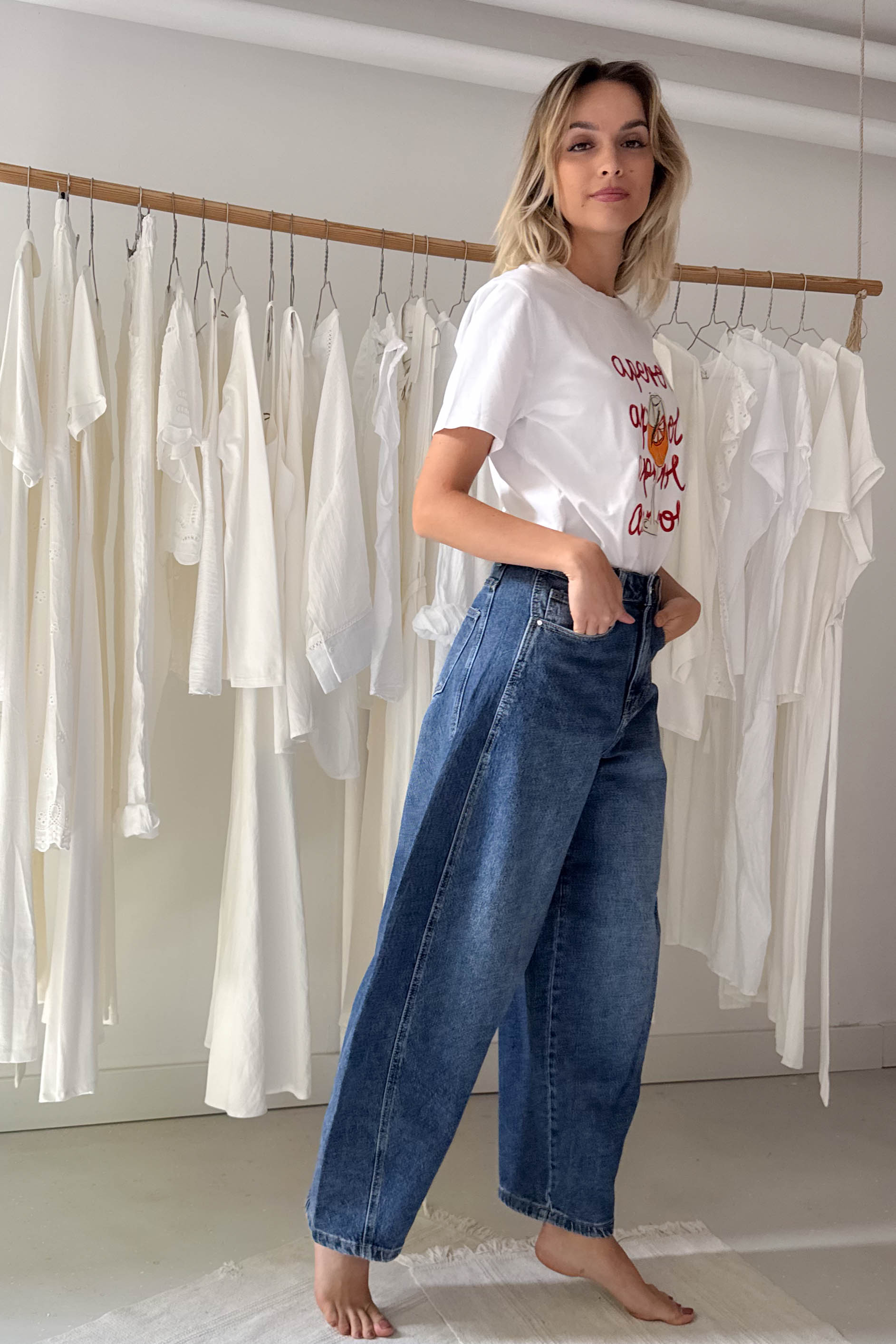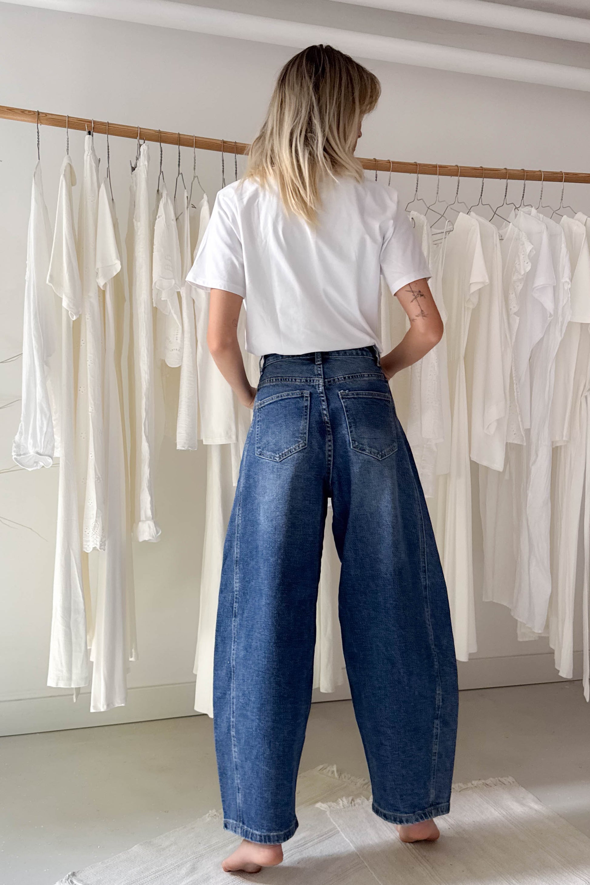Sötétkék színű, ballon fit szabású farmernadrág. Elől a plusz hosszanti varrás nyújtja a lábakat.