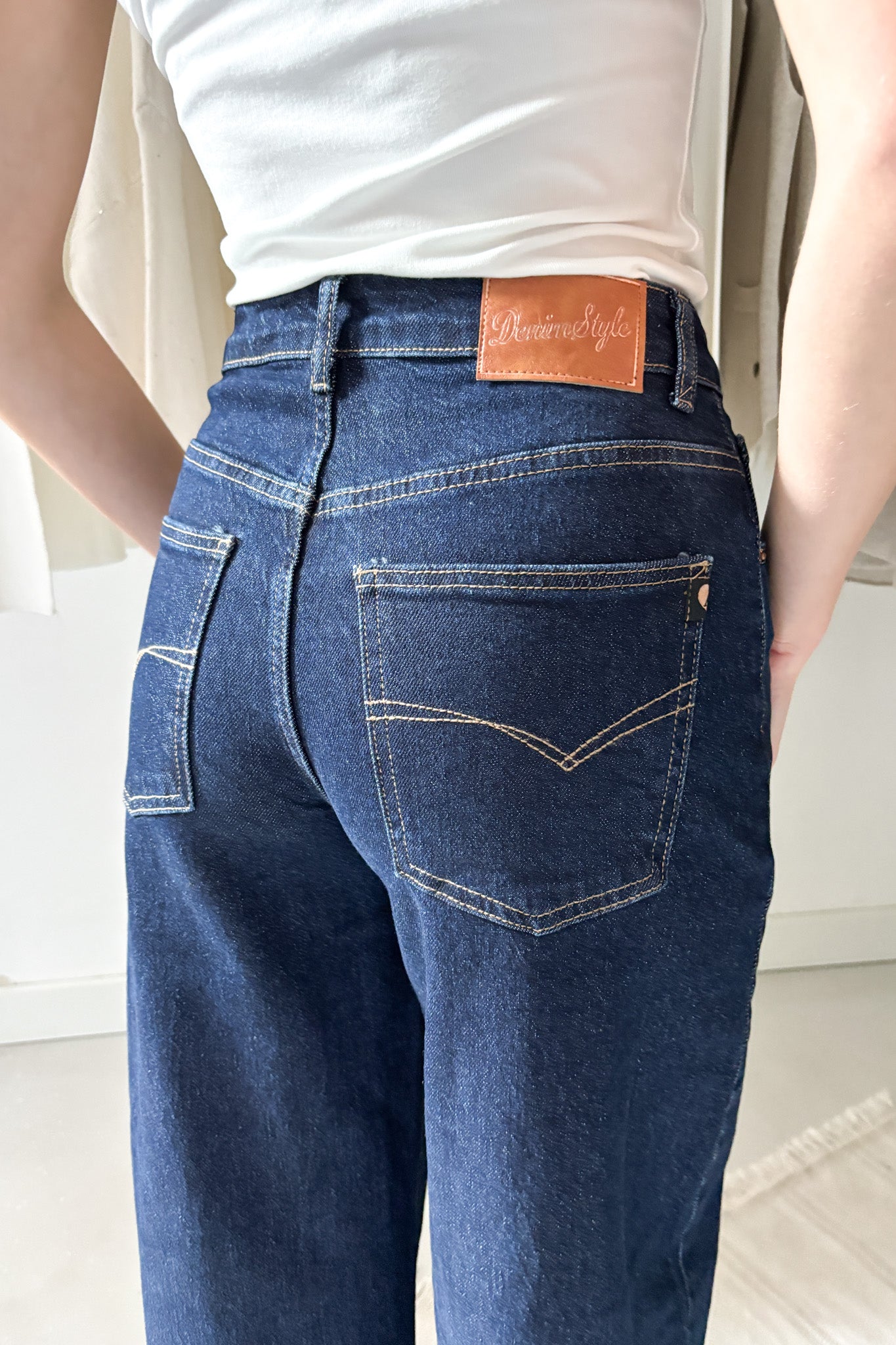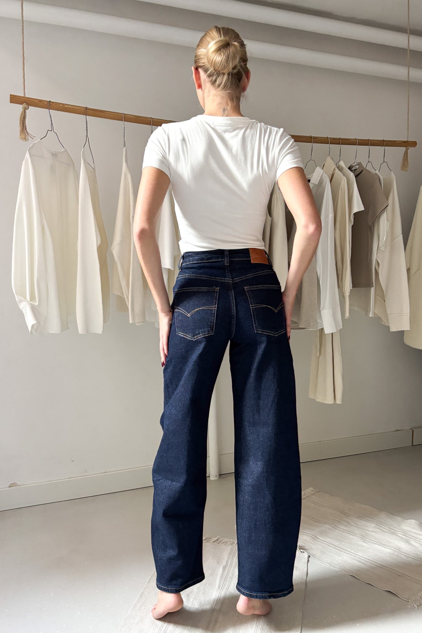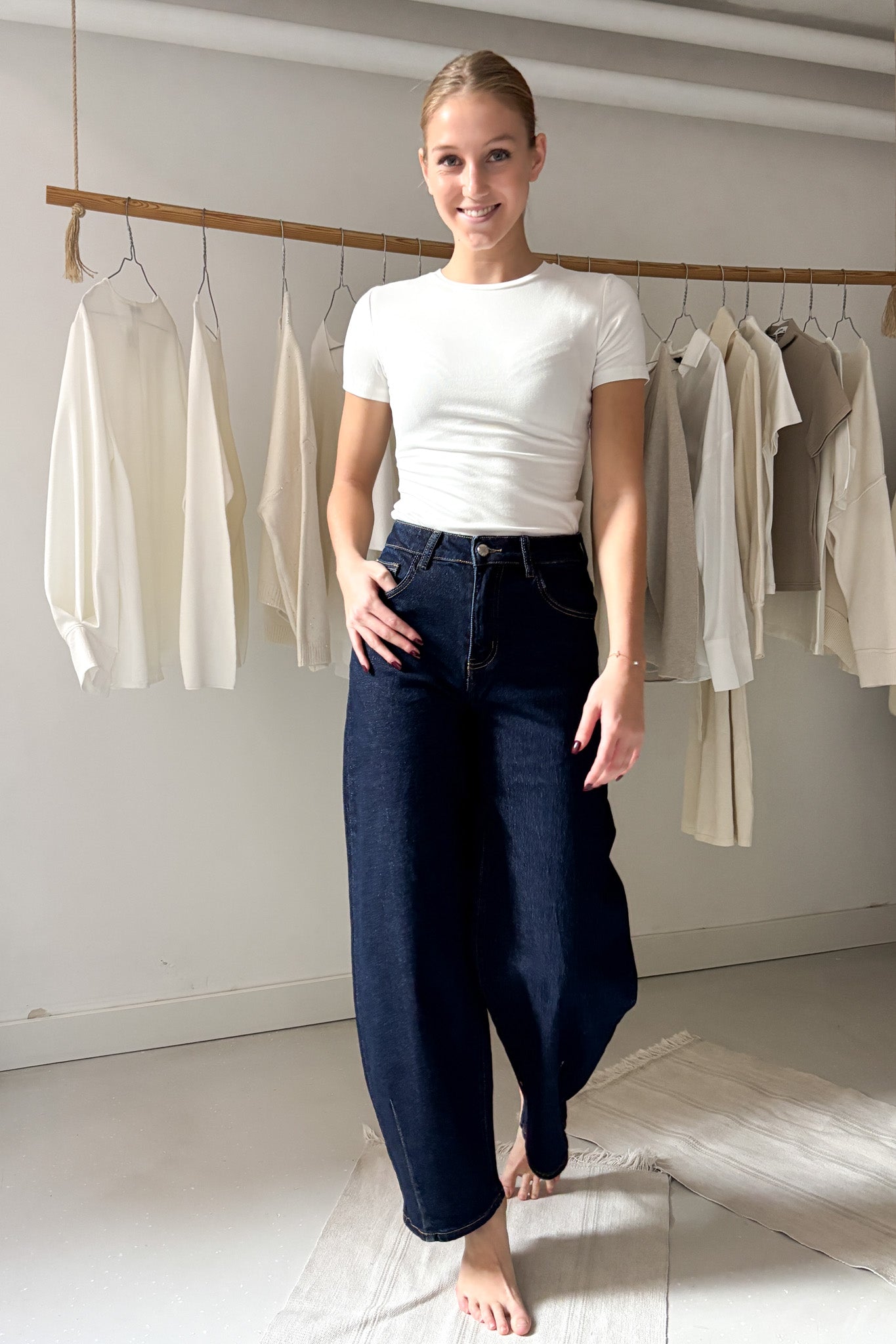 Sötétkék ballon farmer. Bő szabású, azonban bokánál enyhén szűkül. Zsebes fazon.