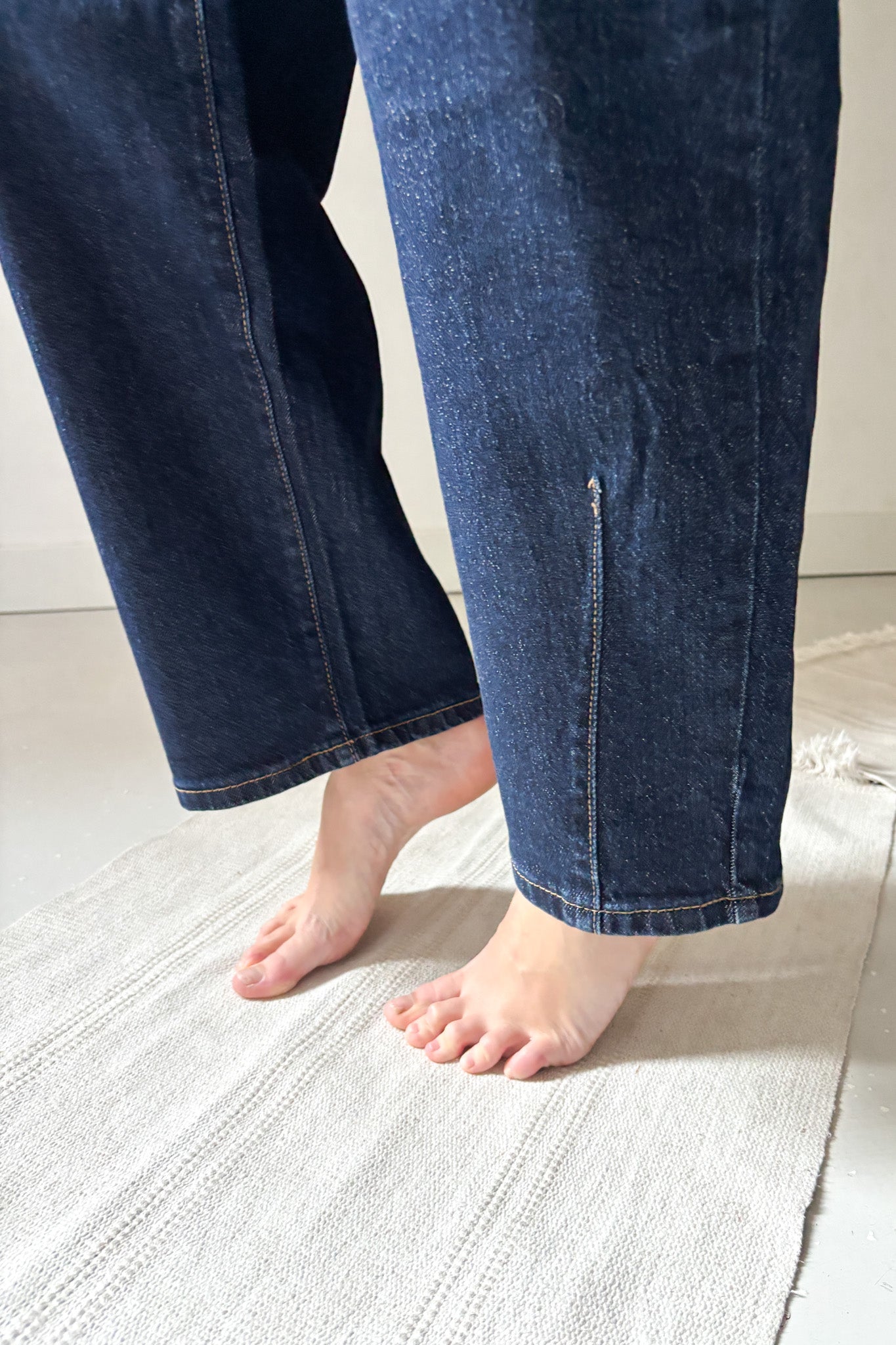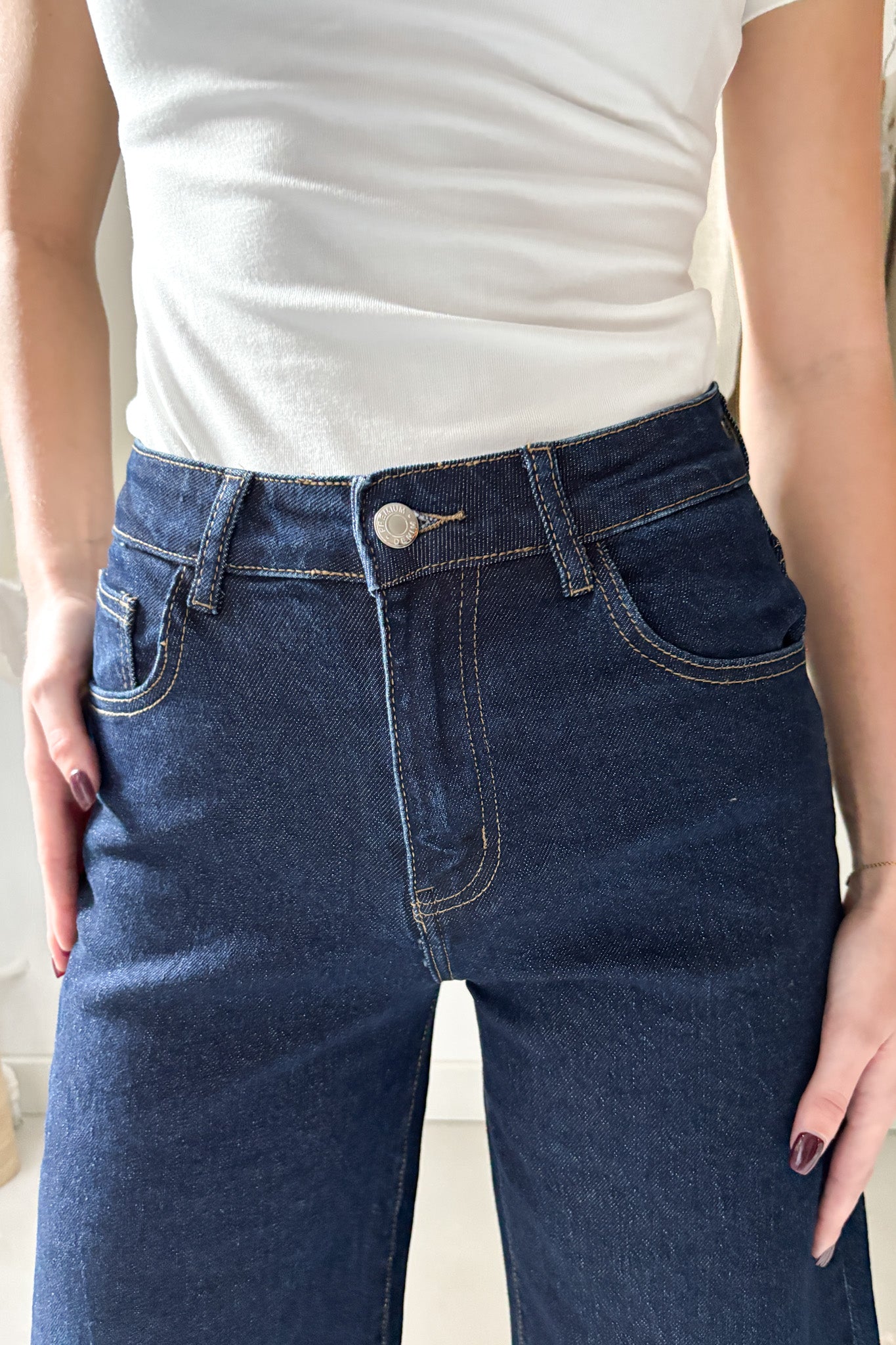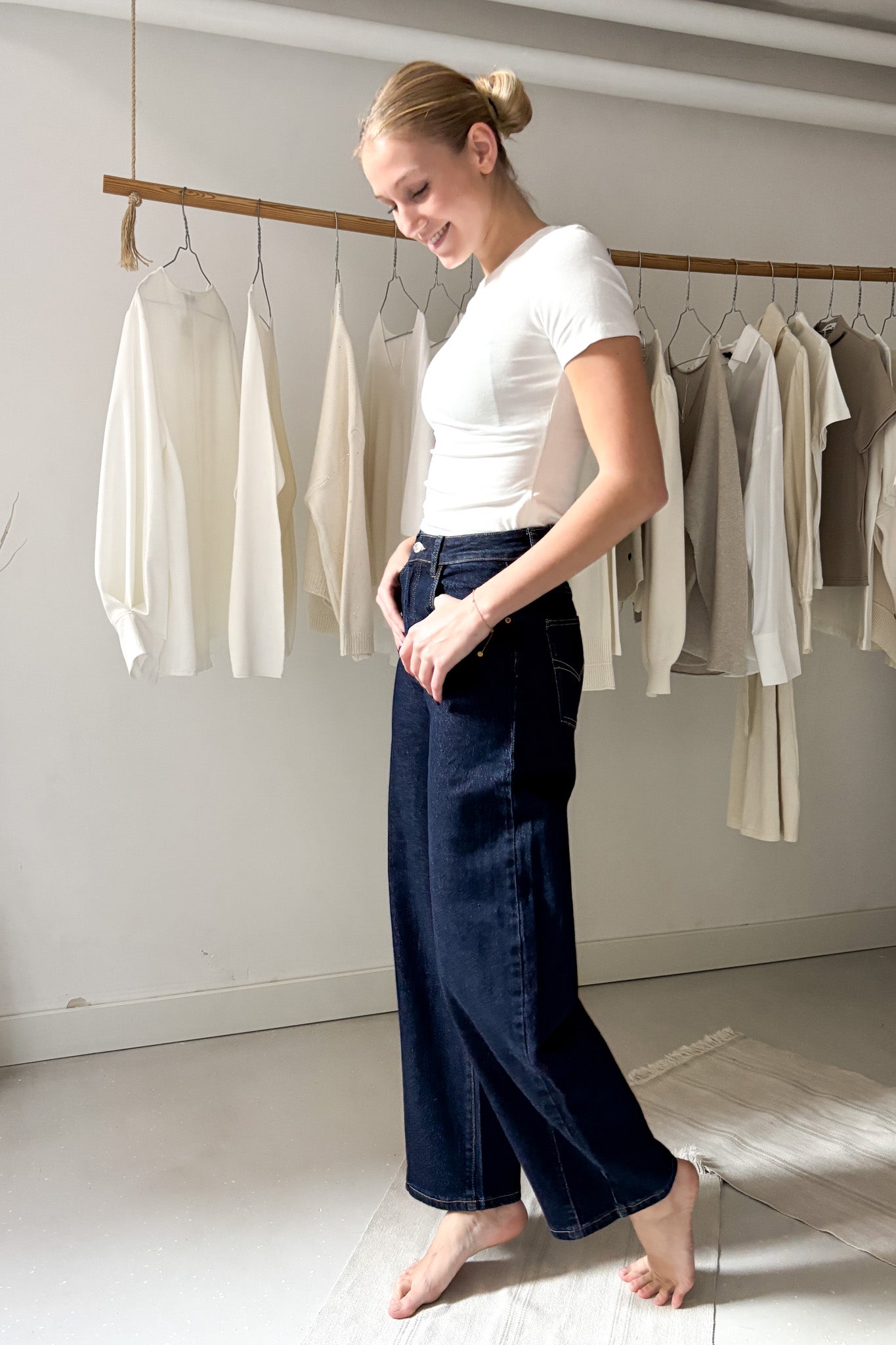 Sötétkék ballon farmer. Bő szabású, azonban bokánál enyhén szűkül. Zsebes fazon.