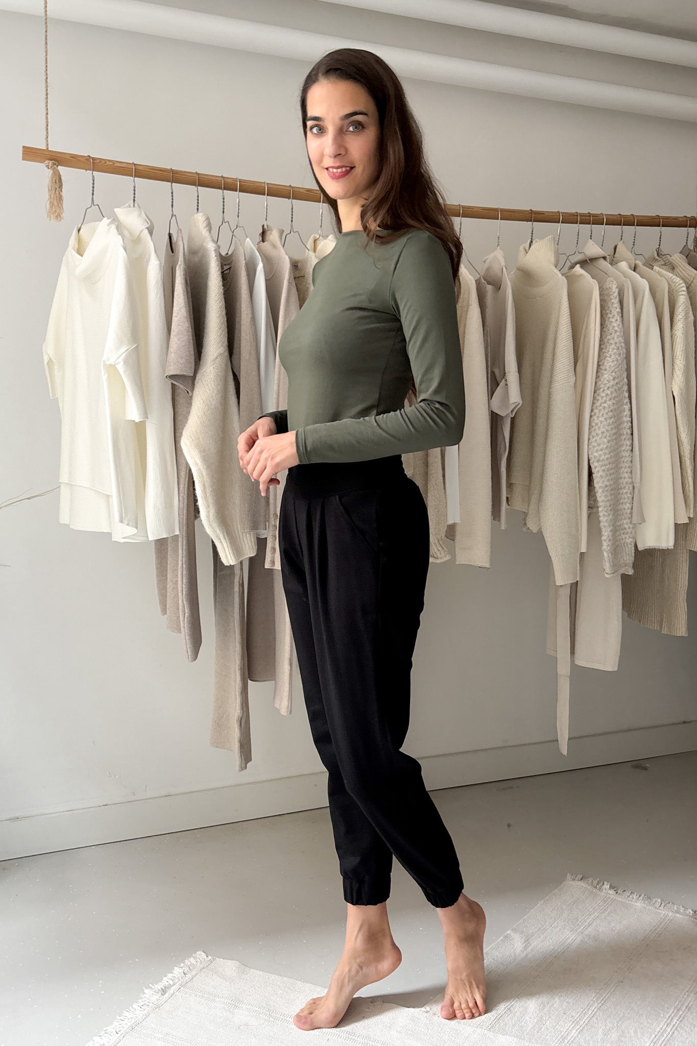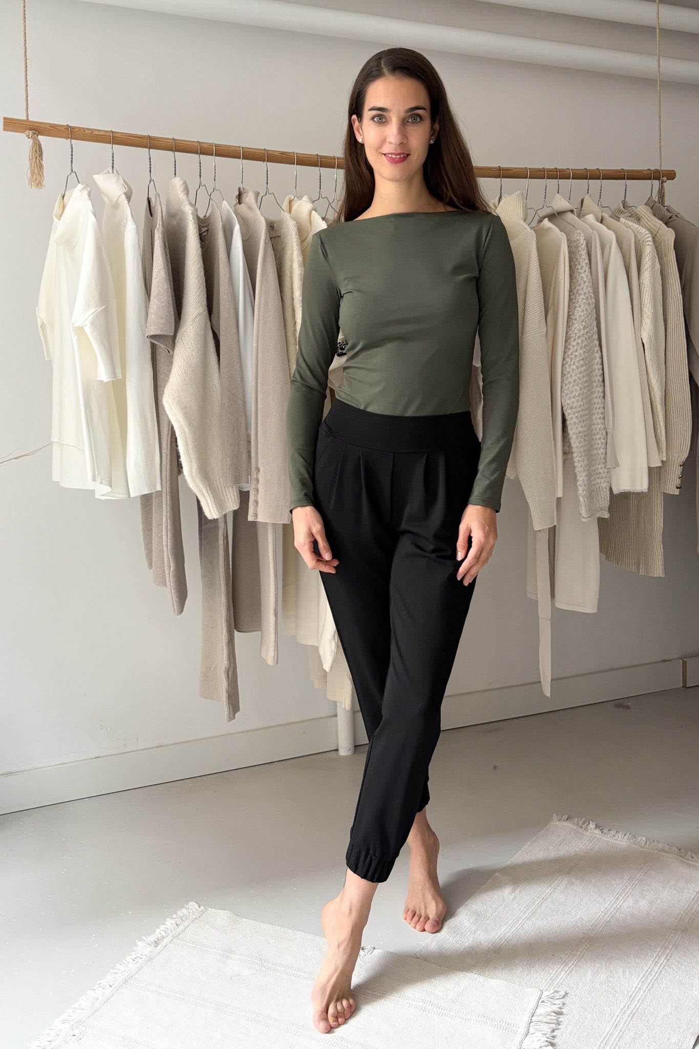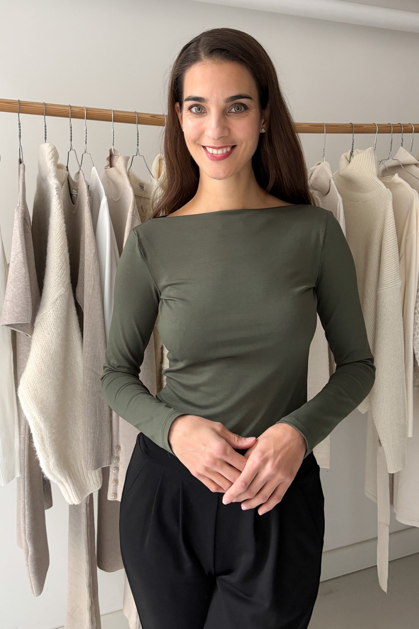 Elasztikus, puha prémium minőségű pamut. Egyenes vonalú, csónaknyakú nyakmegoldásával, hosszú ujjával, hosszú derékszabásával, igazi tavaszi/őszi/téli alapdarab. Gépben 30 fokon mosható.