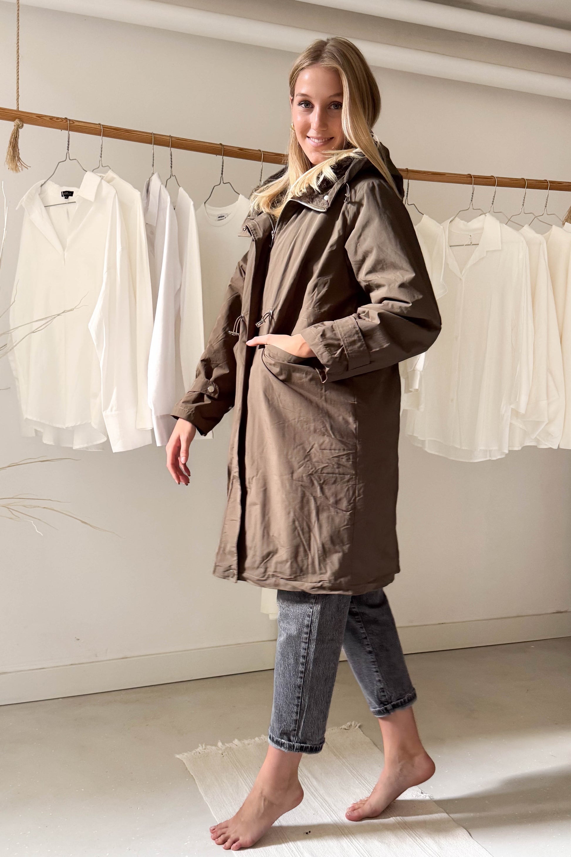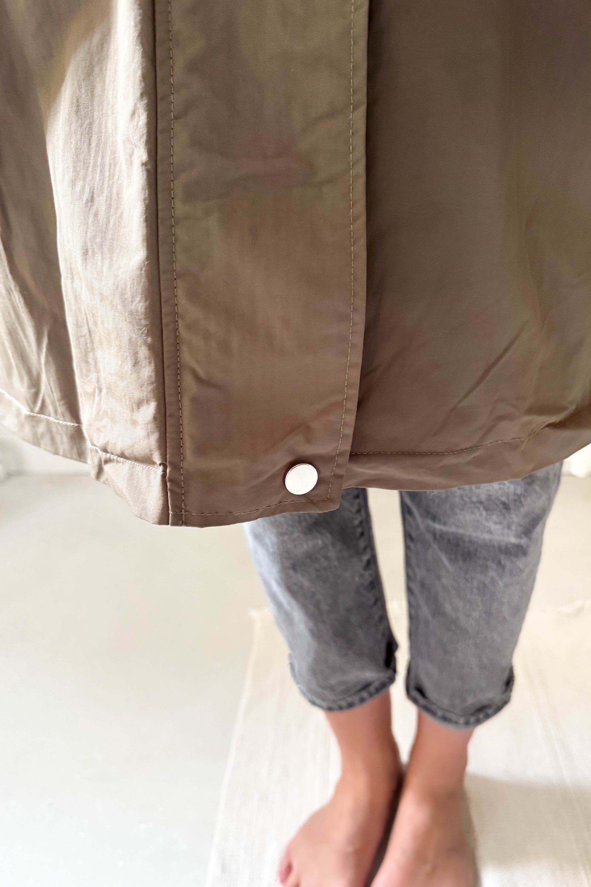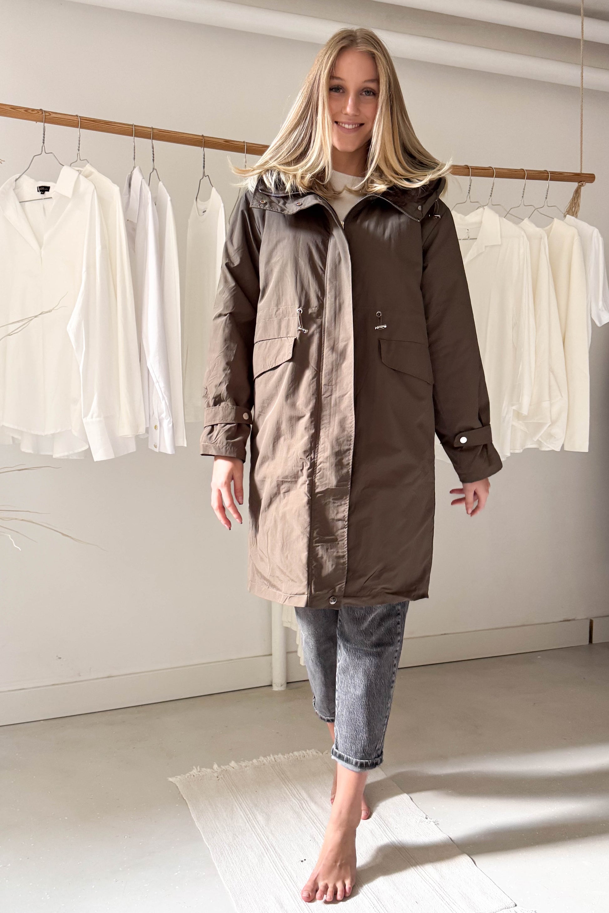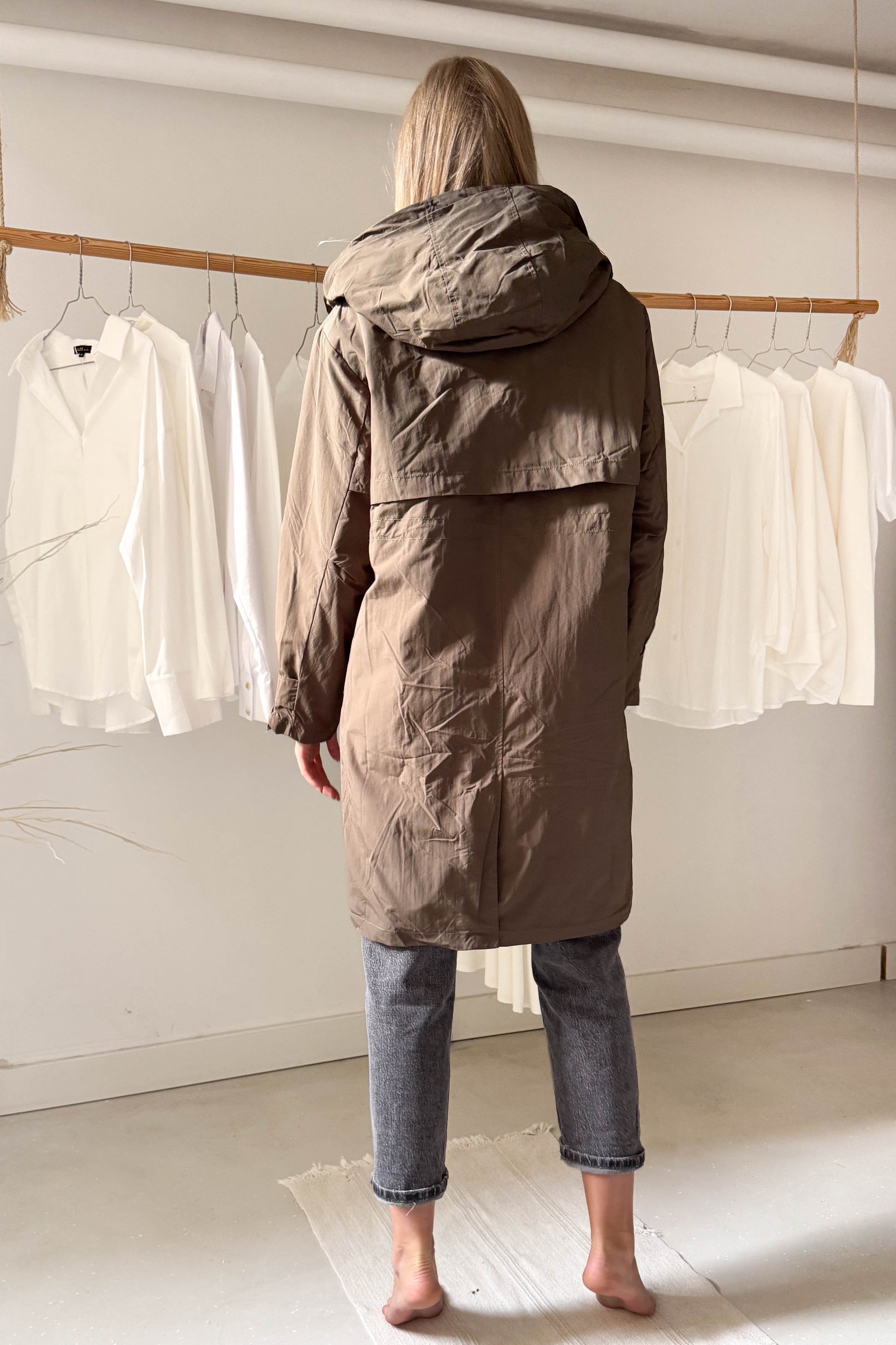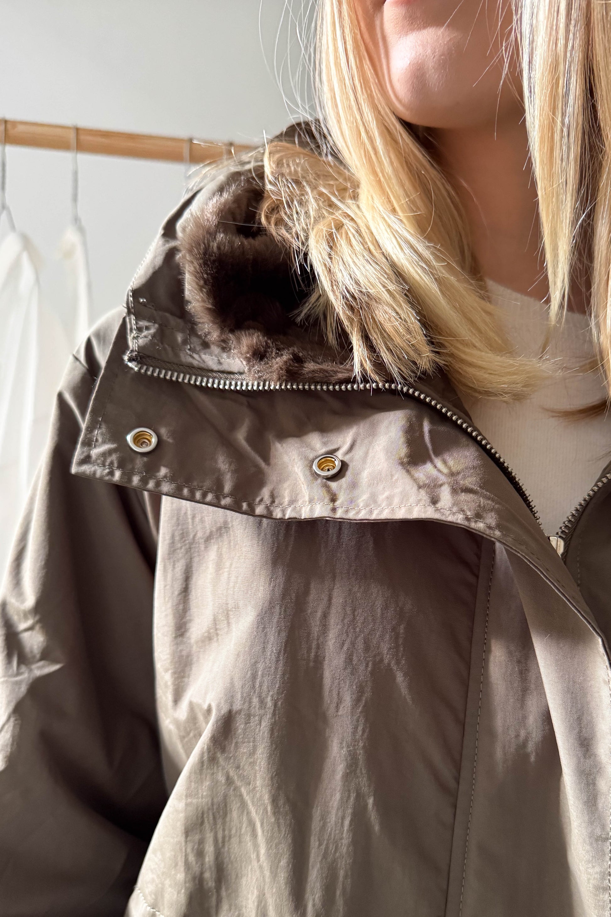 Kapucnis, térdig érő kabát, khaki színben. Szőrme hatású béléssel van ellátva. Elől cipzárral és a két végén egy-egy patenttal záródik. Az ujjak végén patenttal állítható mandzsetta van. Derékrészen szűkíthető, zsebes fazon.