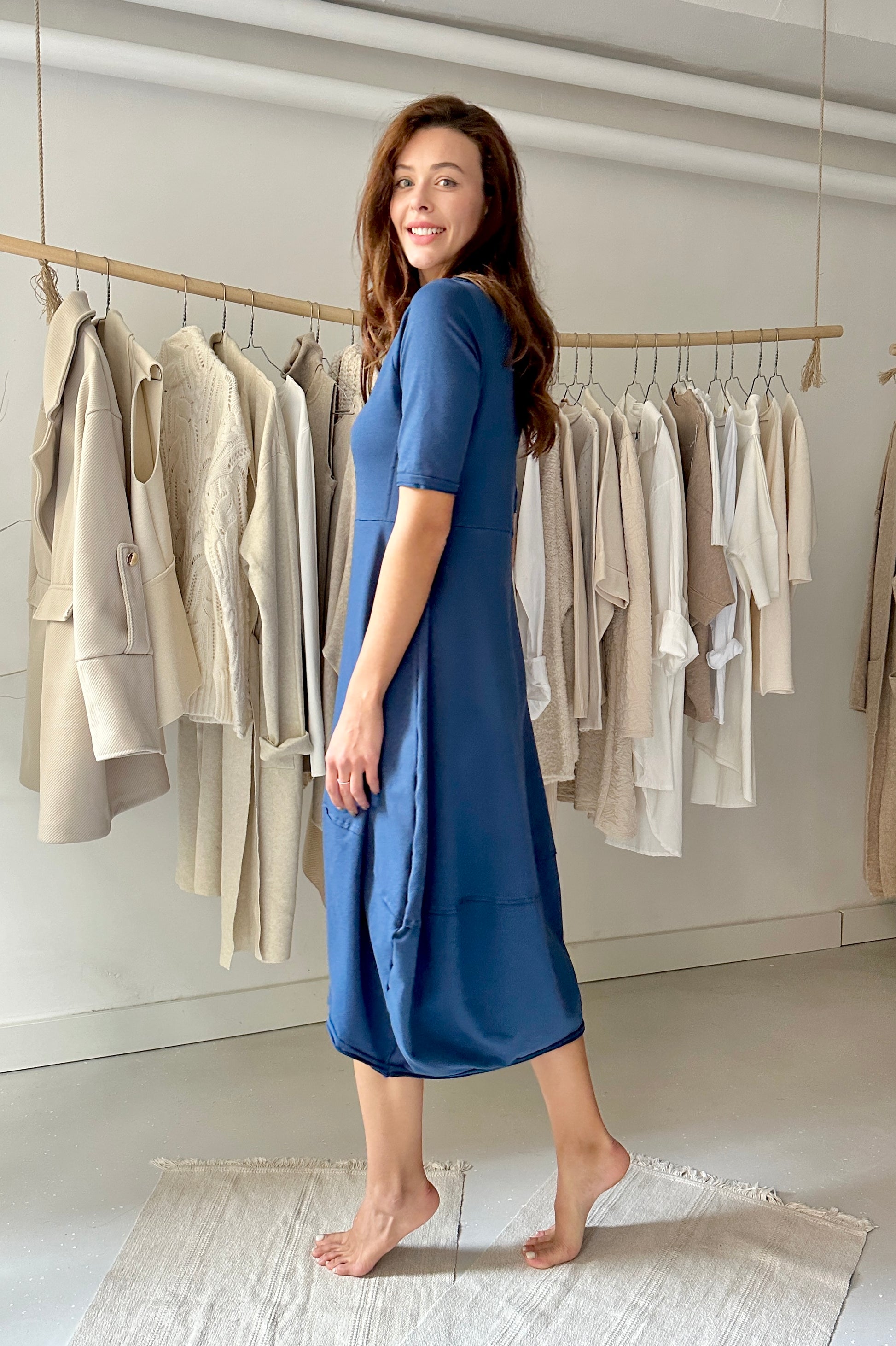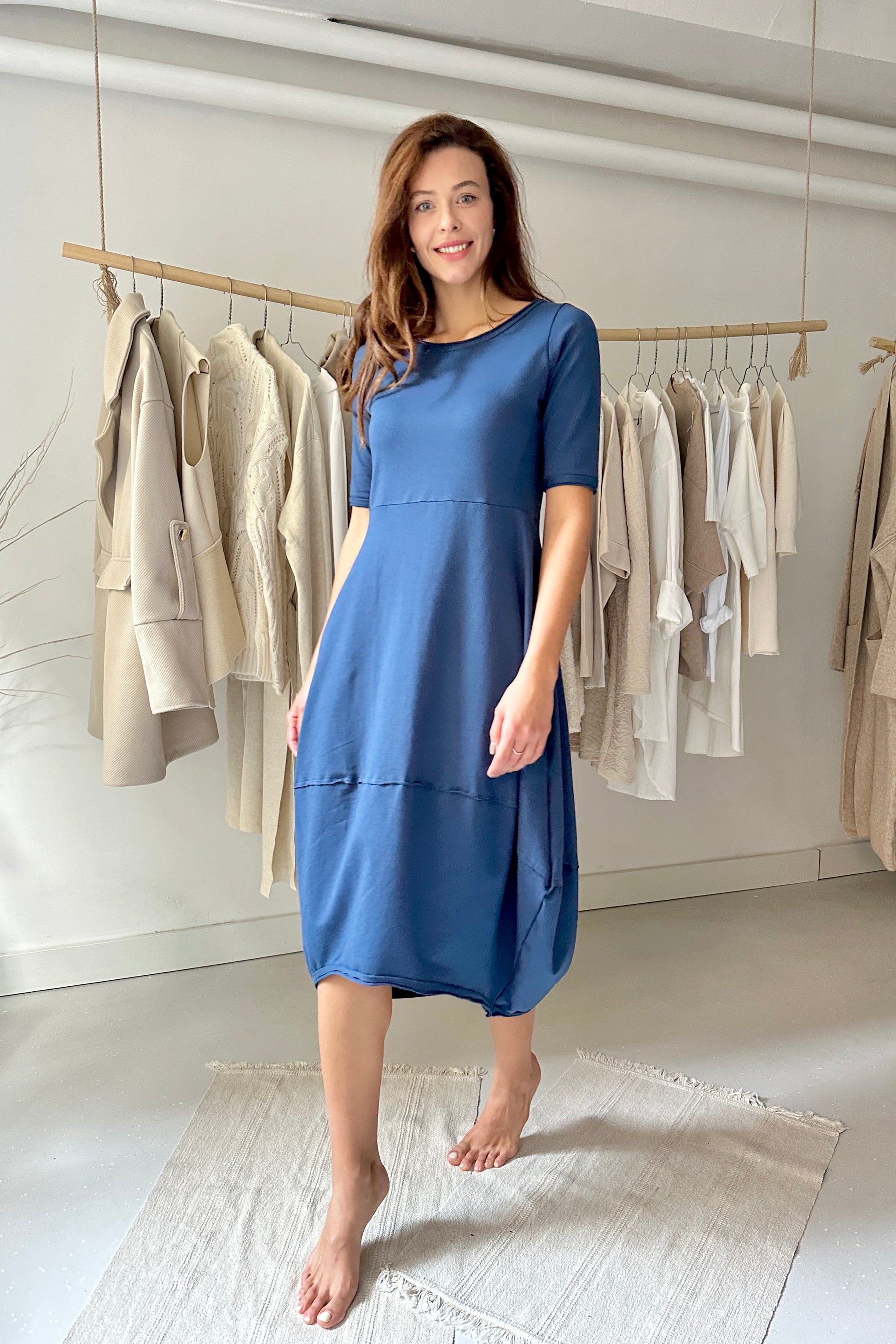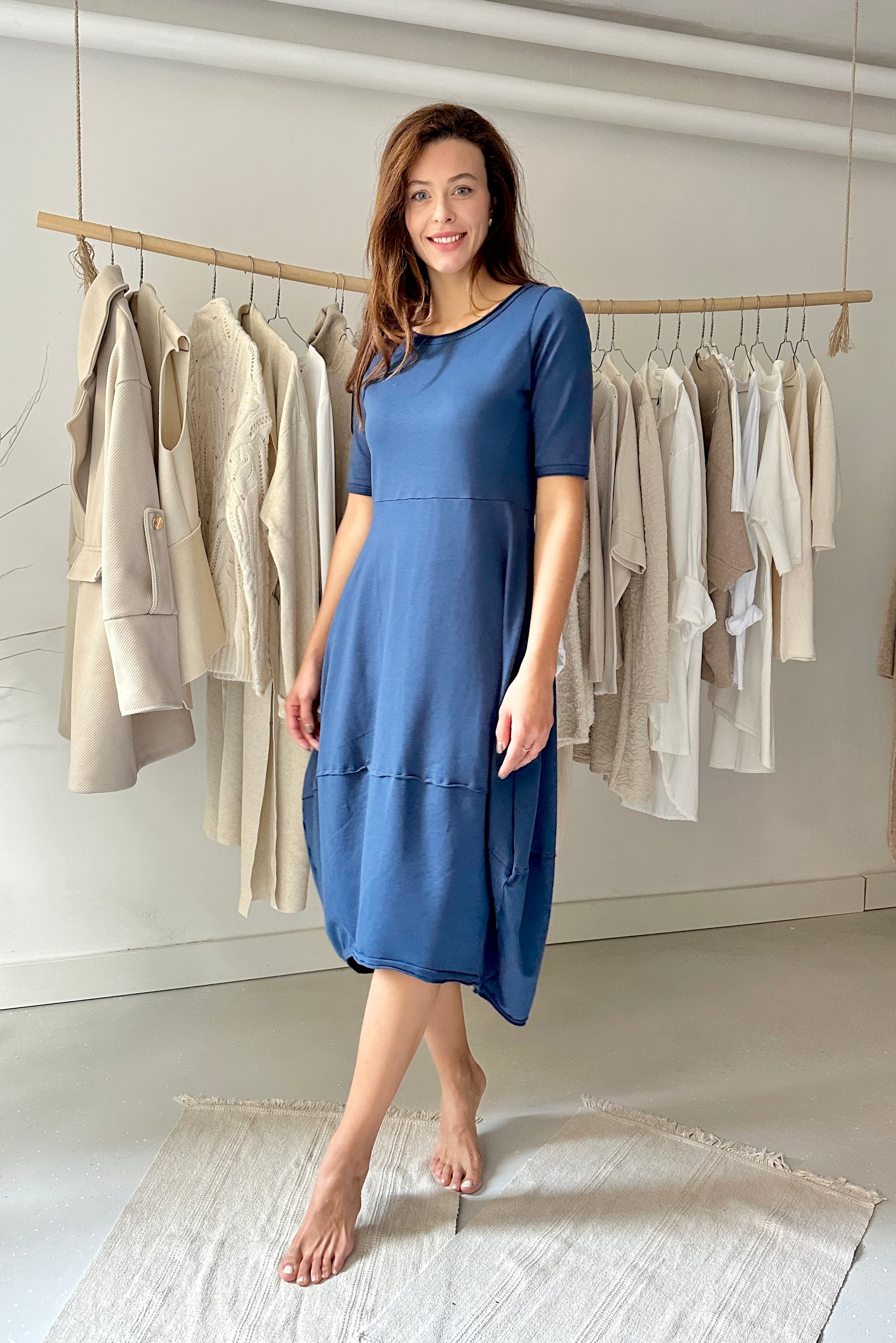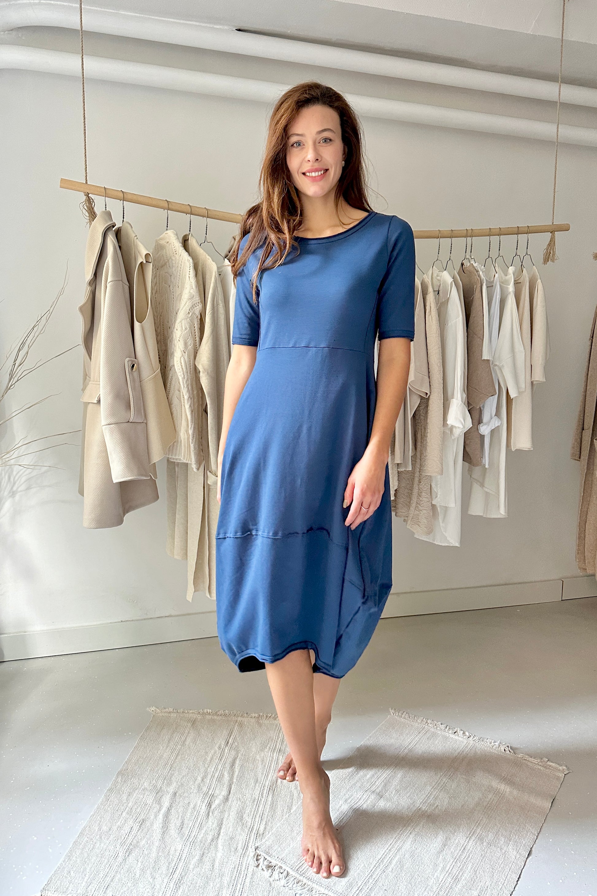 95% pamut 5% elasztán  – futter, kényelmes, puha, vastagabb pamut anyag. Három évszakos ruha, a forró nyári napokra nem ajánljuk! Gépben mosható 30 fokon. A modell 177 cm magas, M-es ruhát visel.