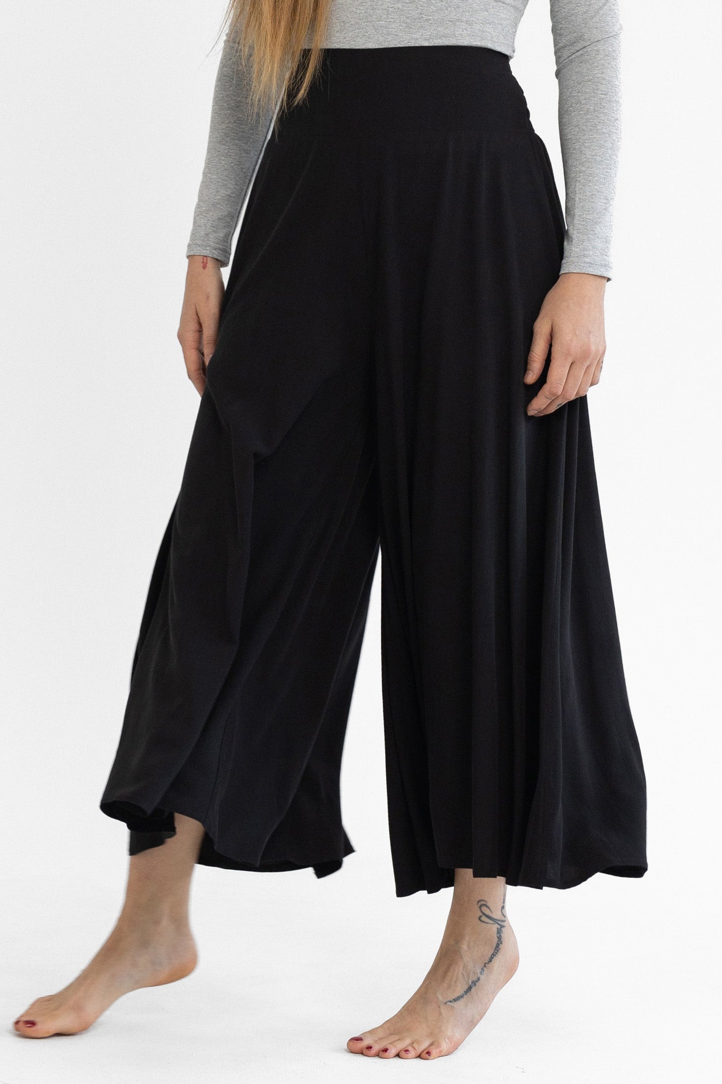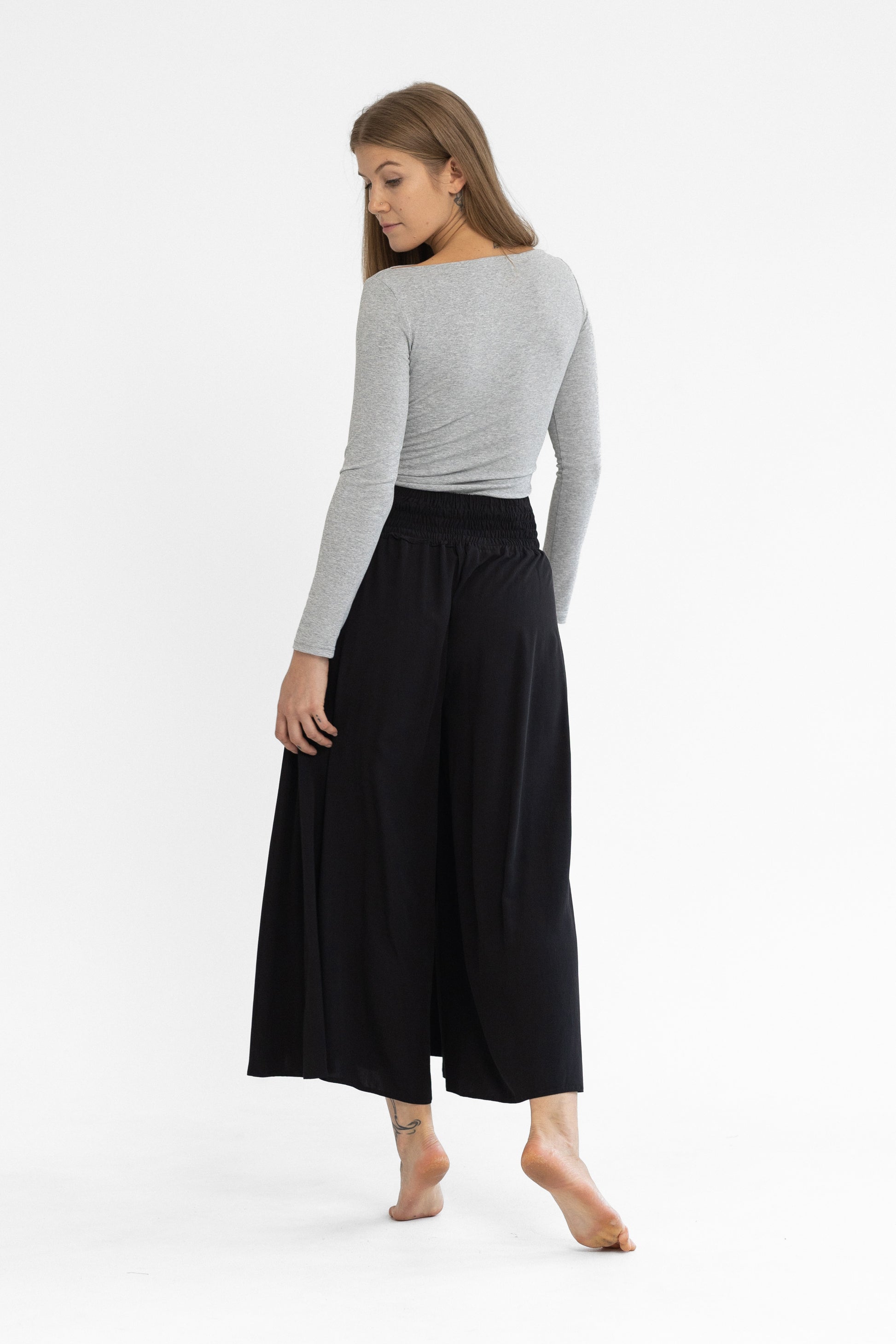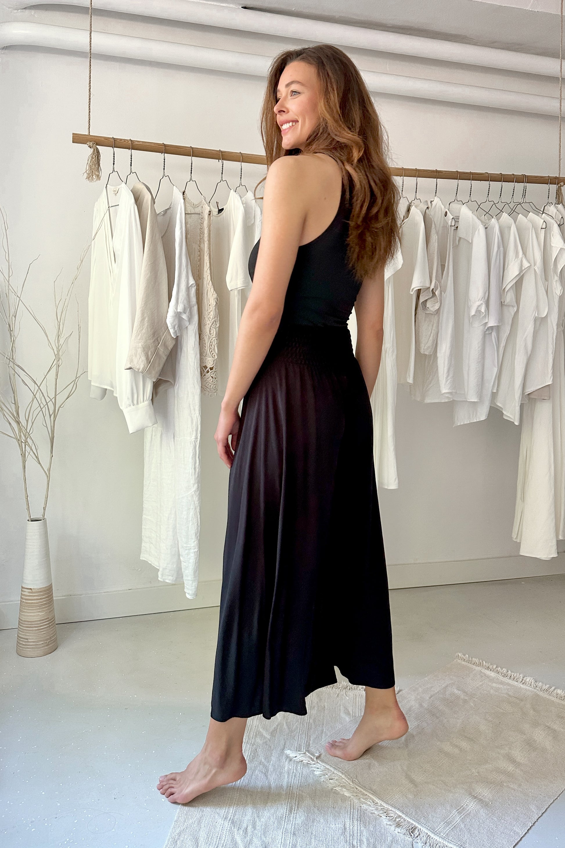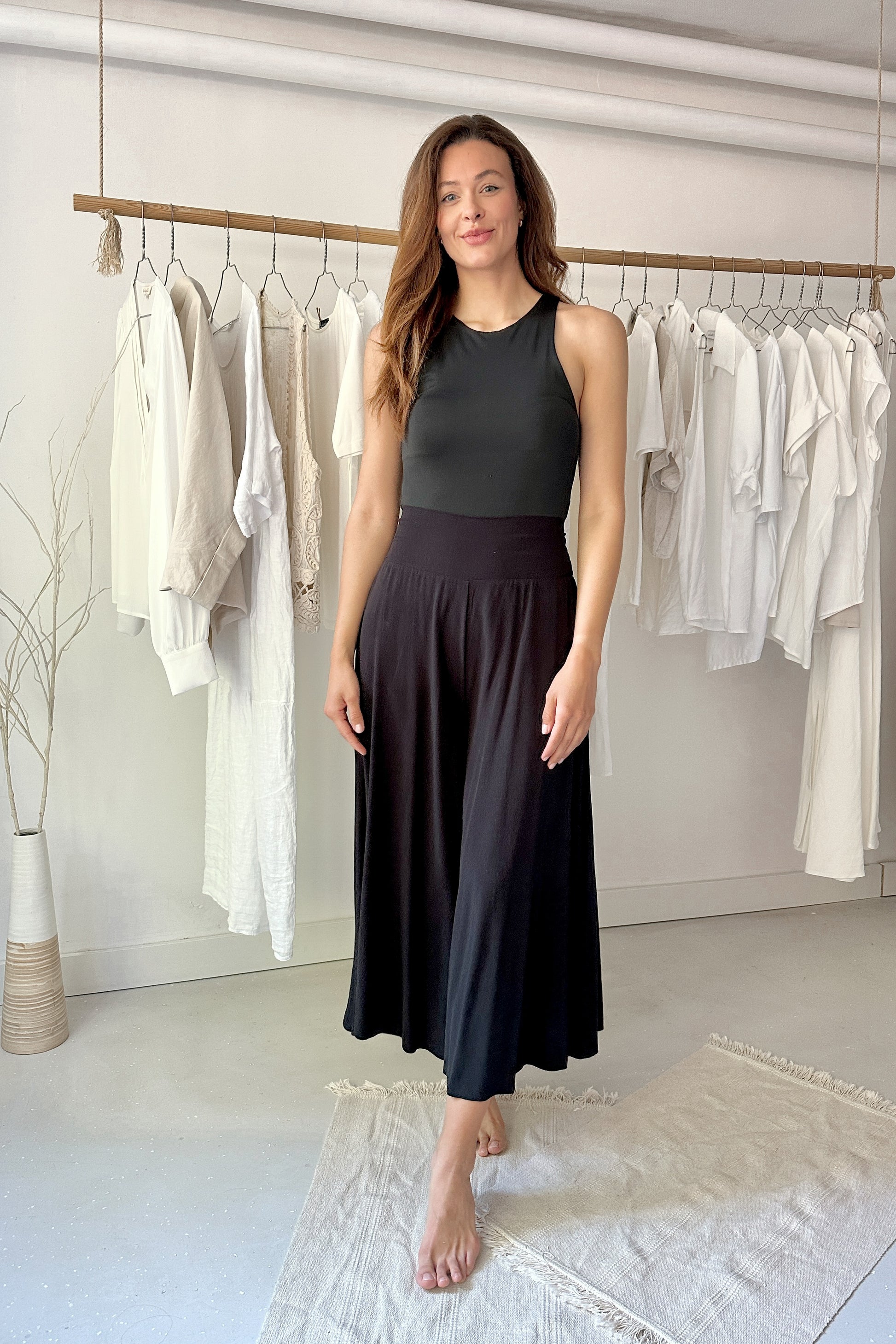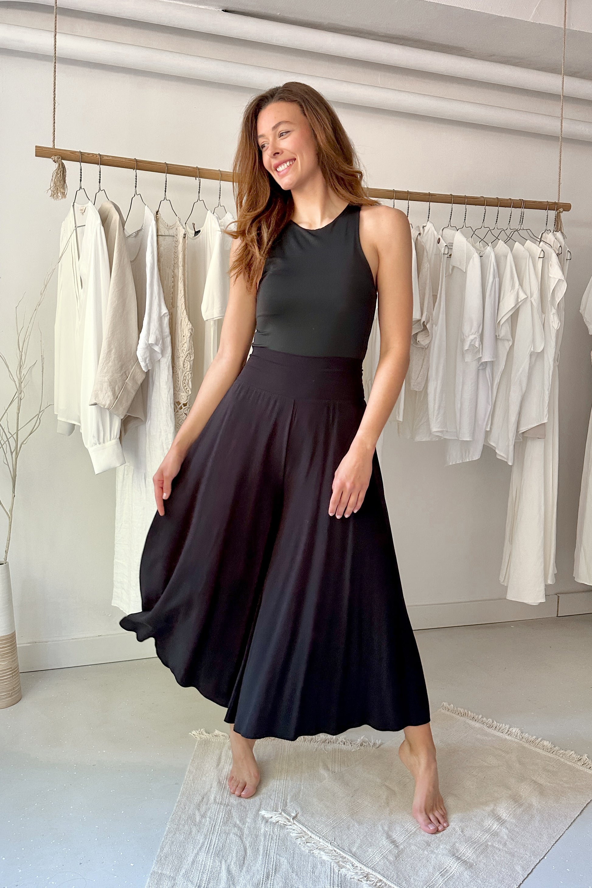 100% viszkóz, természetes szálakból szőtt anyag, elasztánt nem tartalmaz. Derekán hátul gumírozott, kényelmes extra bő szárú, midi hosszúságú nadrág. Egy méretben gyártjuk, 34-38-as konfekcióméreteket fed le. Gépben 30 fokon mosható. A modell 174 cm magas.