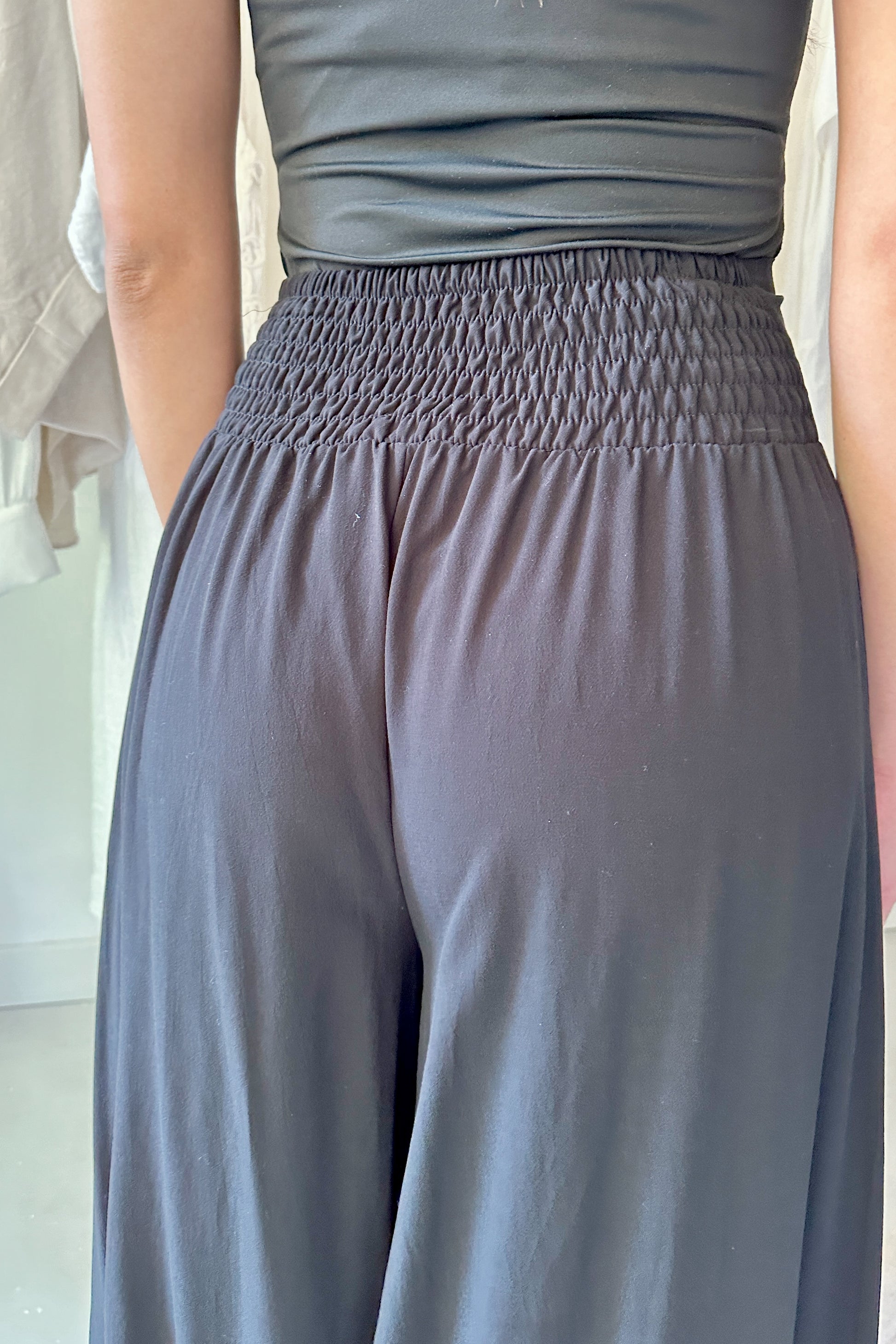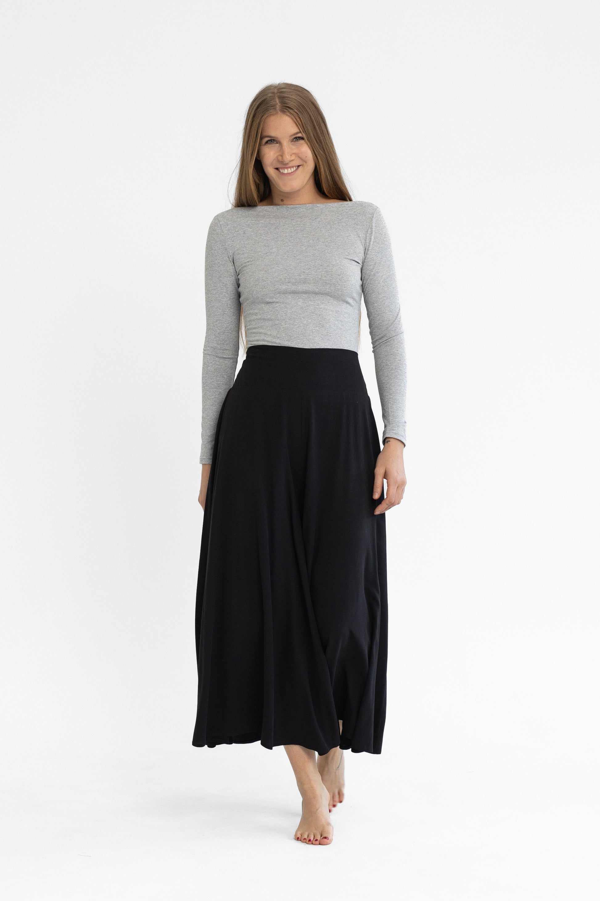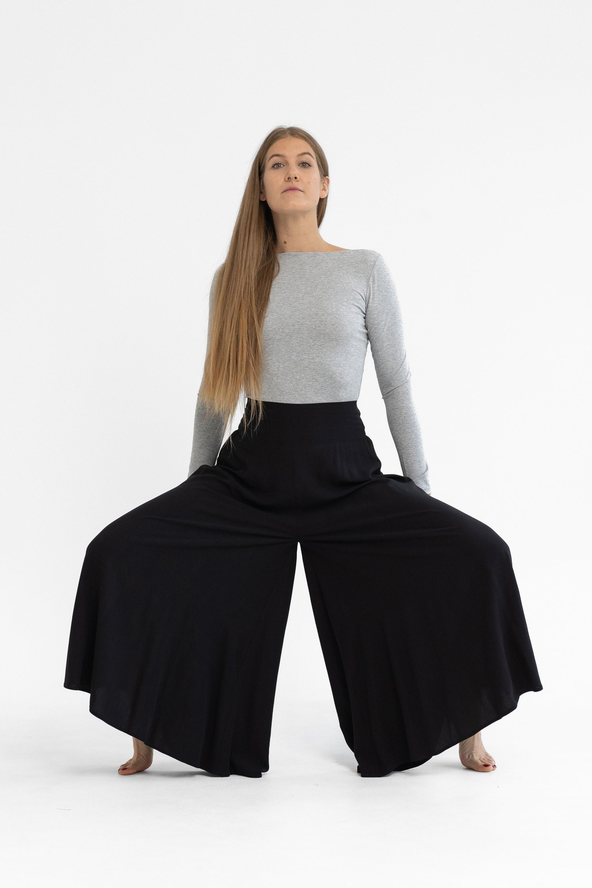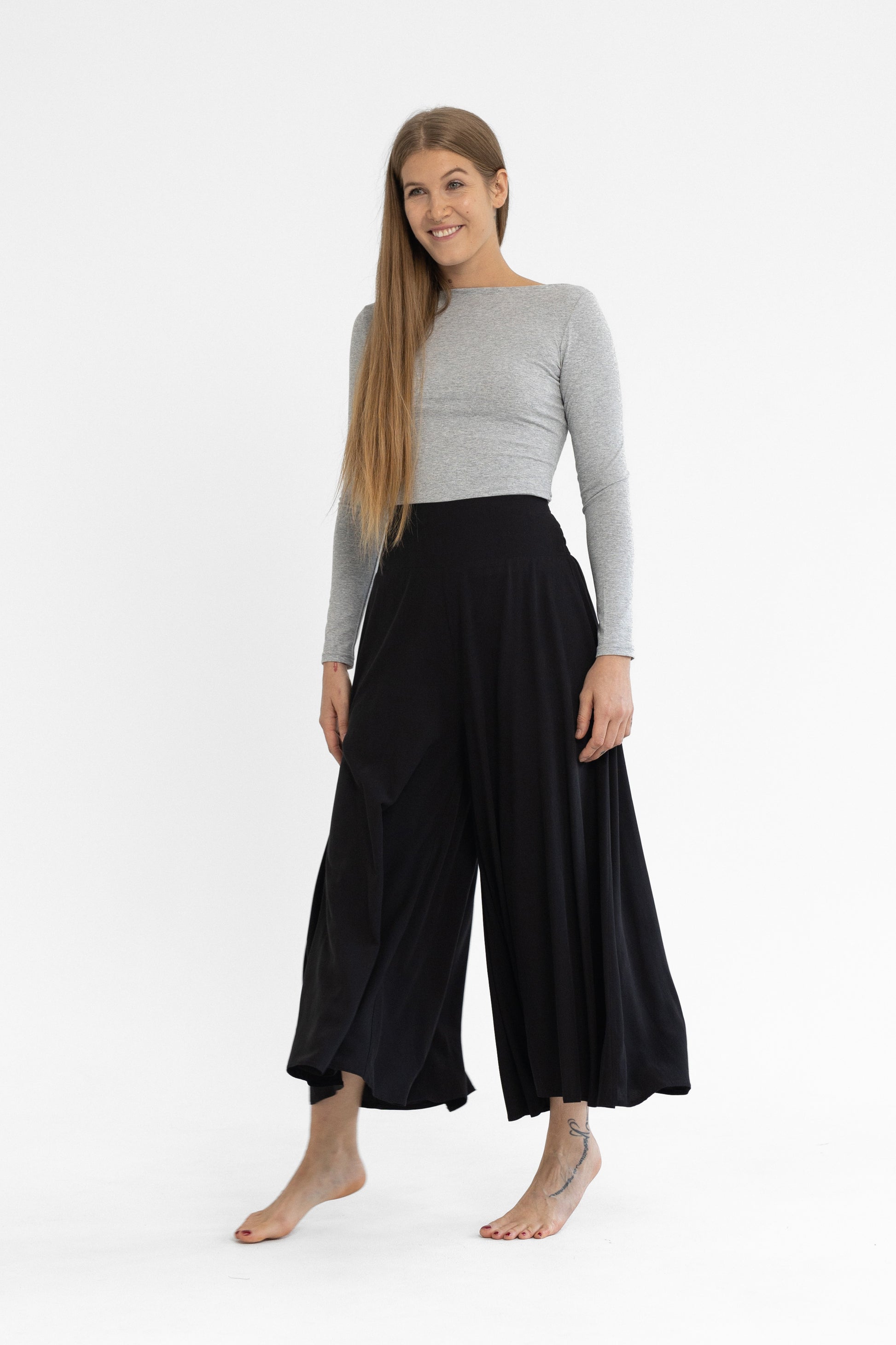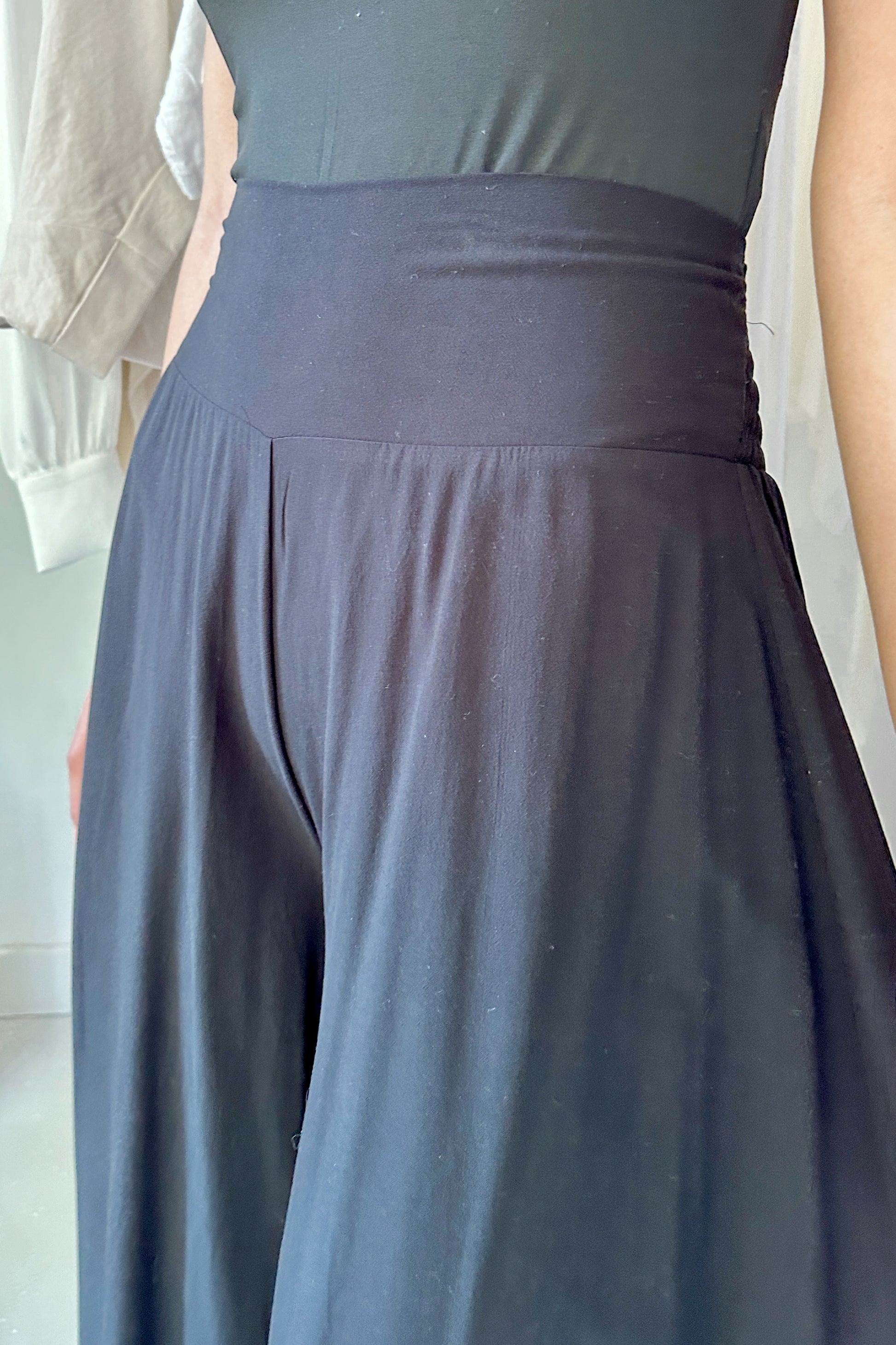 100% viszkóz, természetes szálakból szőtt anyag, elasztánt nem tartalmaz. Derekán hátul gumírozott, kényelmes extra bő szárú, midi hosszúságú nadrág. Egy méretben gyártjuk, 34-38-as konfekcióméreteket fed le. Gépben 30 fokon mosható. A modell 174 cm magas.