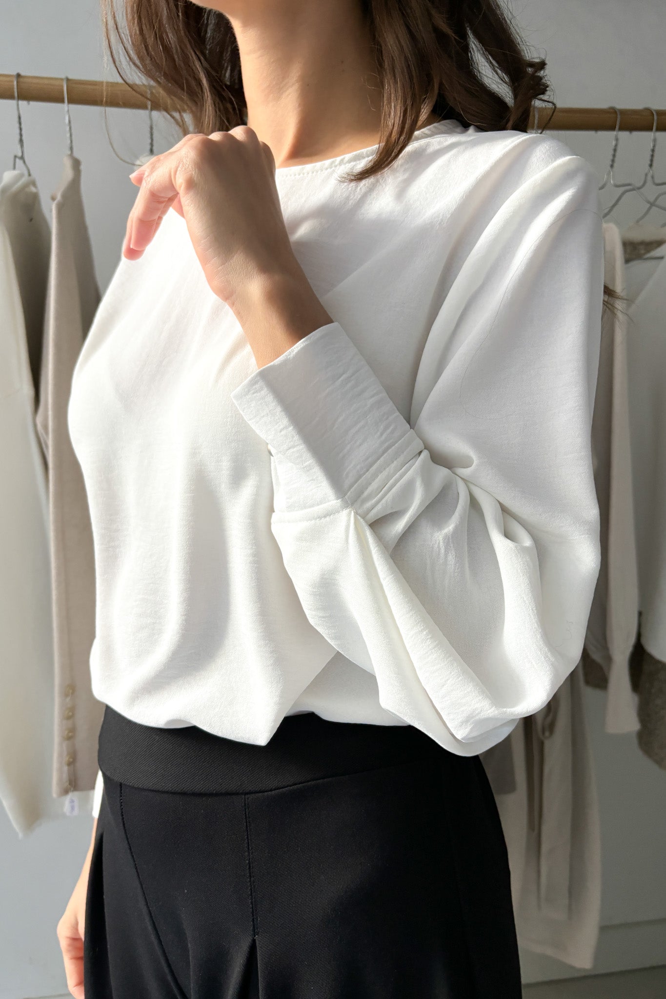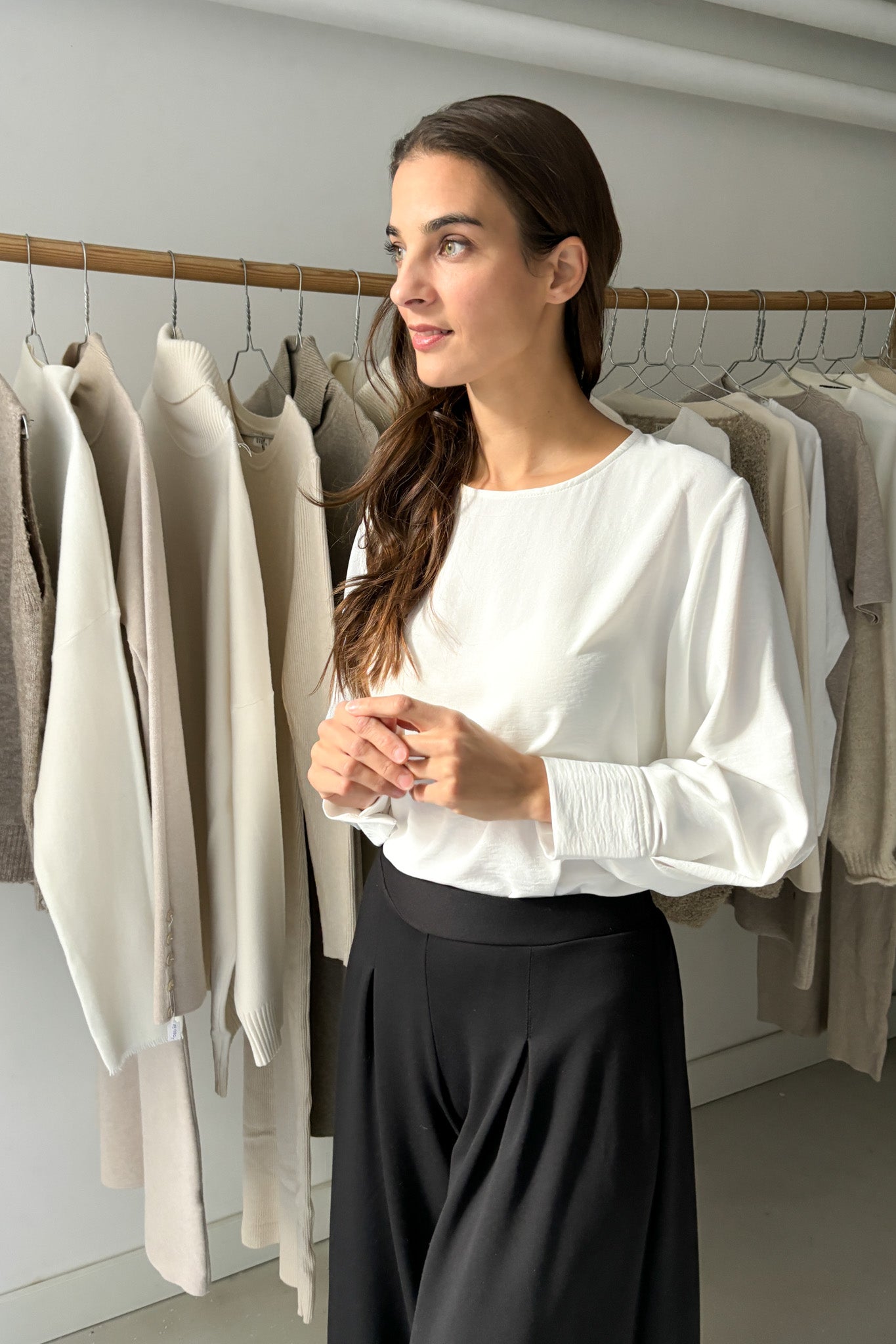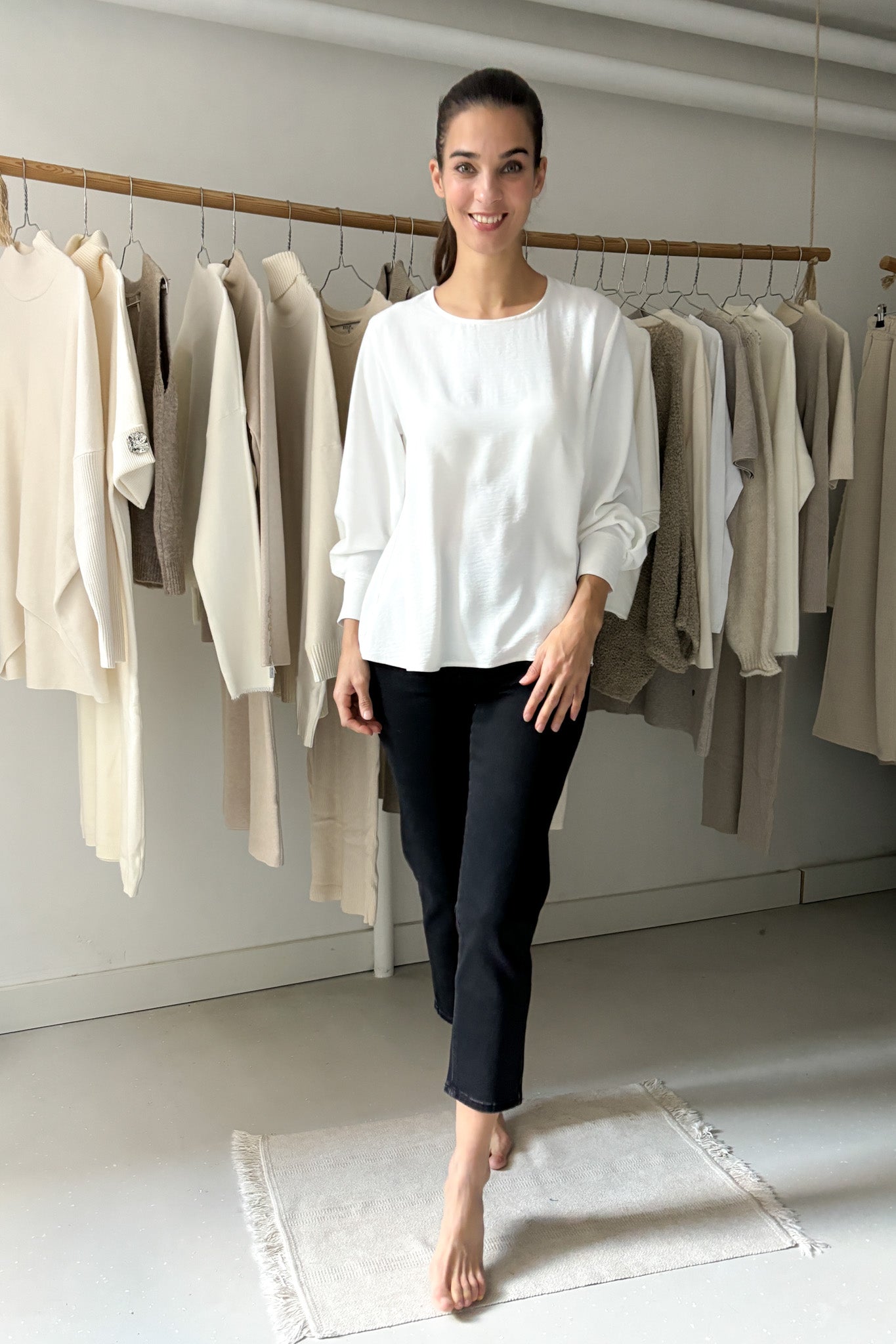 Vékony, lágy esésű anyag. Kerek nyakú, egyenes szabású blúz, melyet különleges ujjmegoldása tesz egészen egyedivé. Egyméretes, 34-38-es konfekcióméreteket fed le. Gépben 30 fokon mosható.