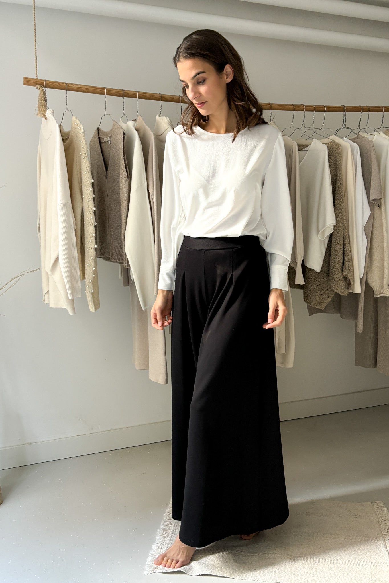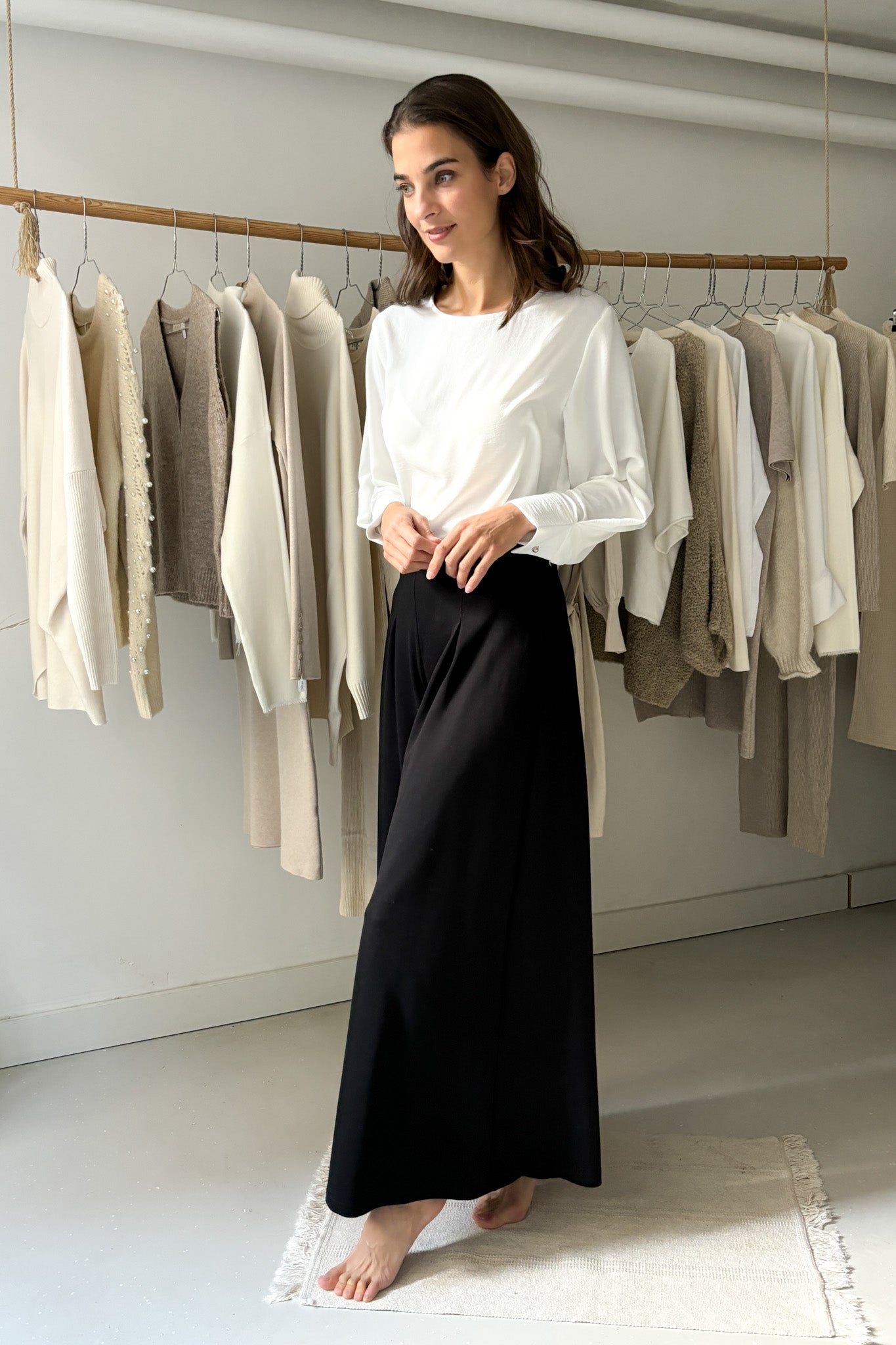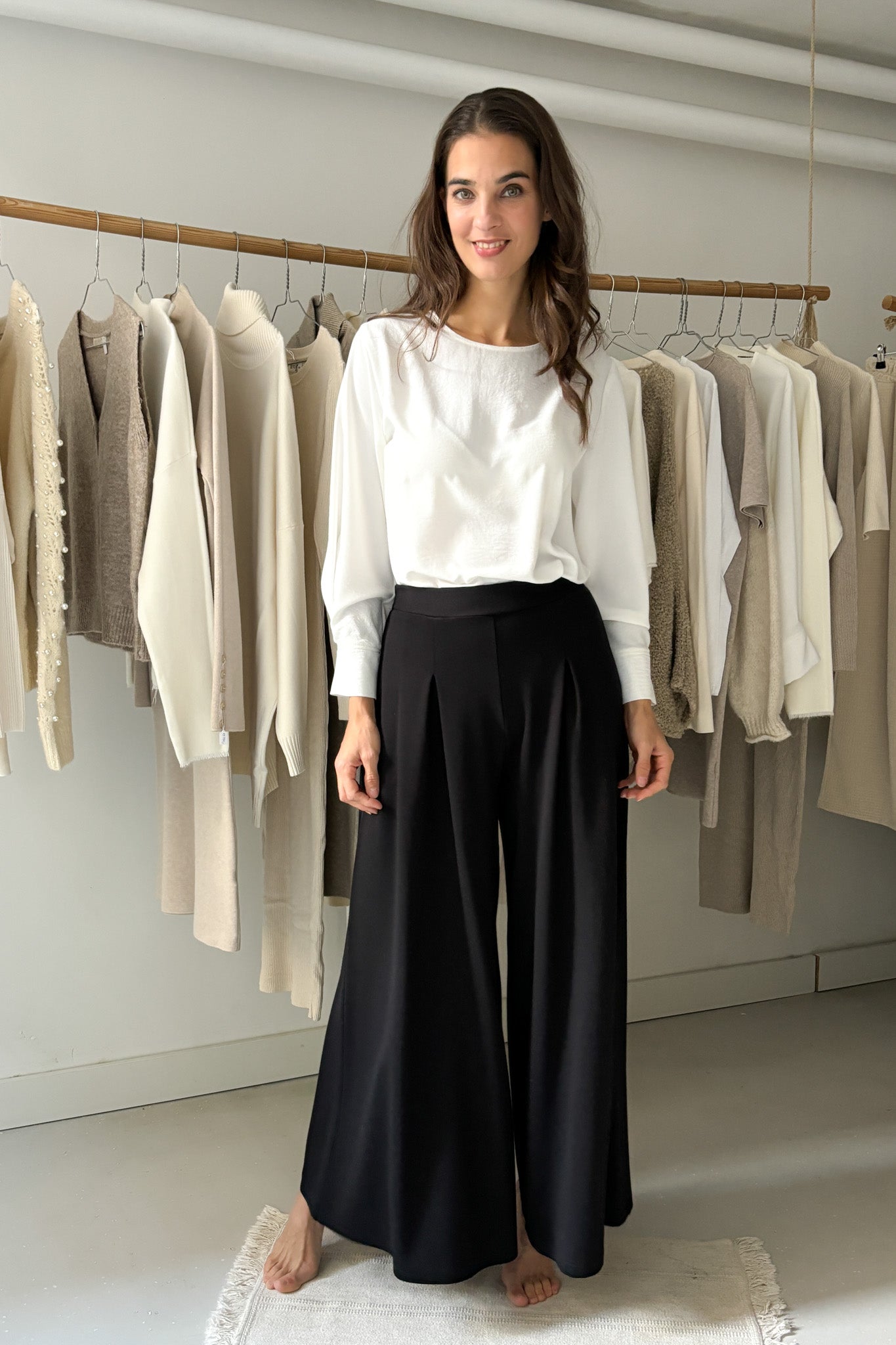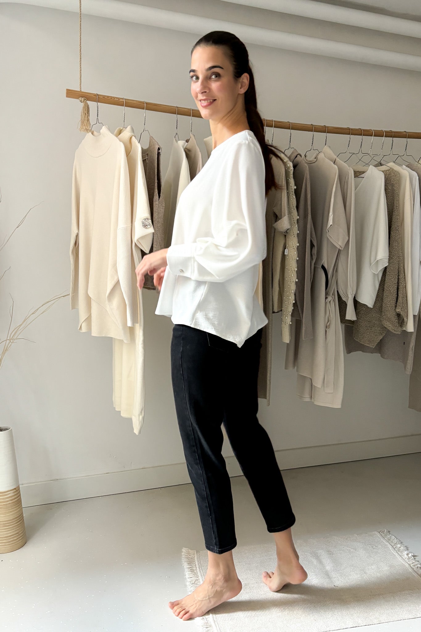 Vékony, lágy esésű anyag. Kerek nyakú, egyenes szabású blúz, melyet különleges ujjmegoldása tesz egészen egyedivé. Egyméretes, 34-38-es konfekcióméreteket fed le. Gépben 30 fokon mosható.