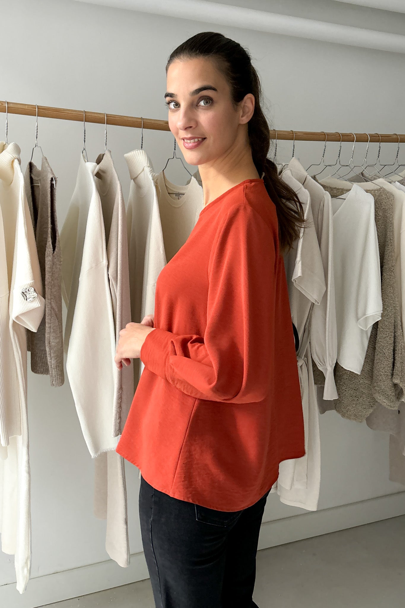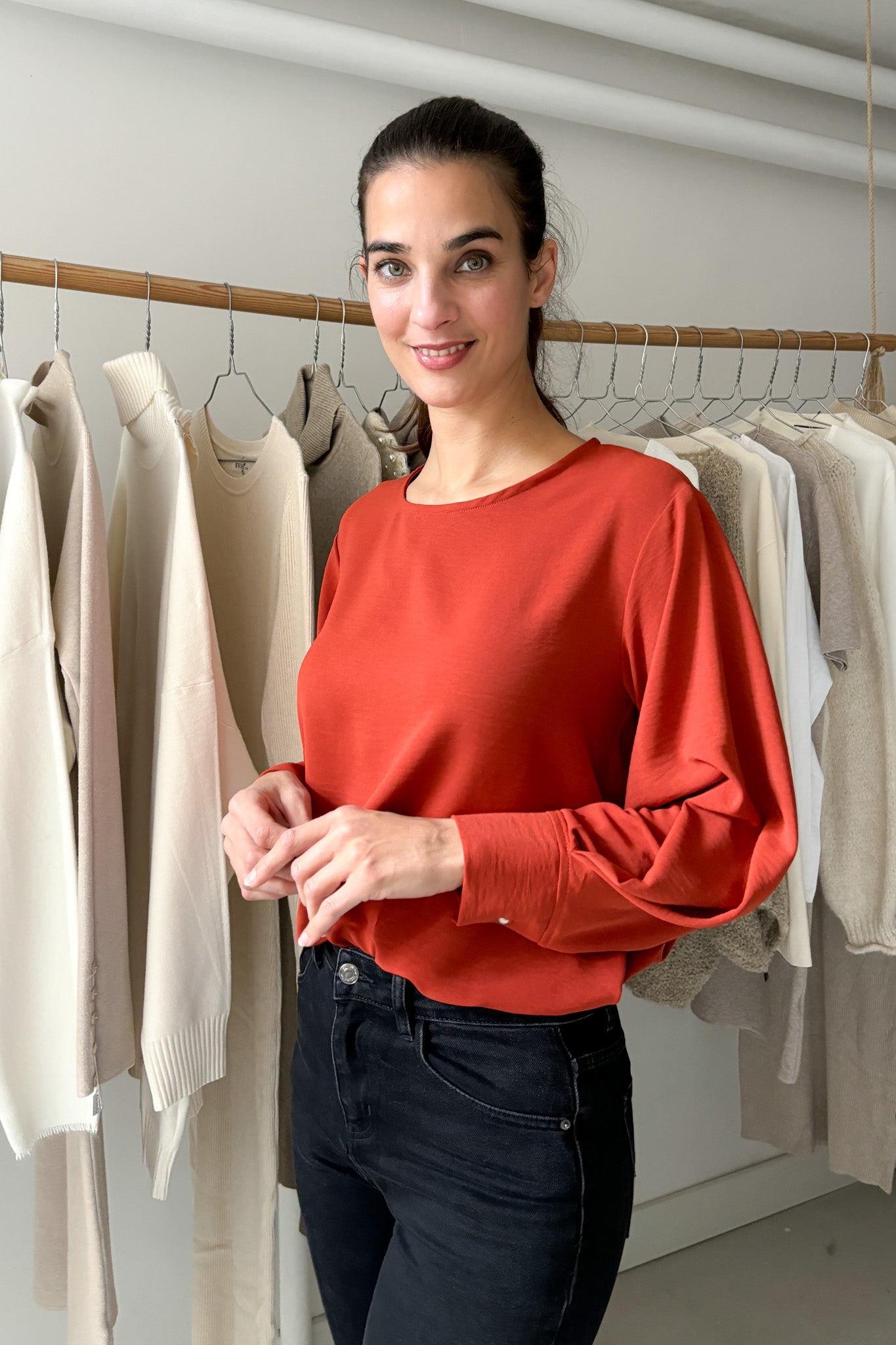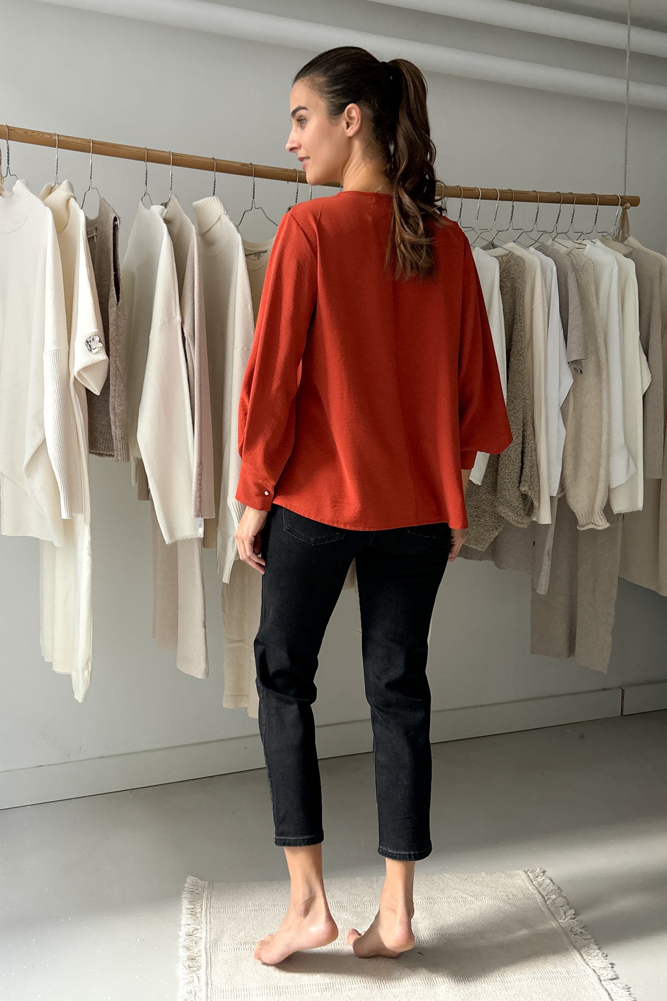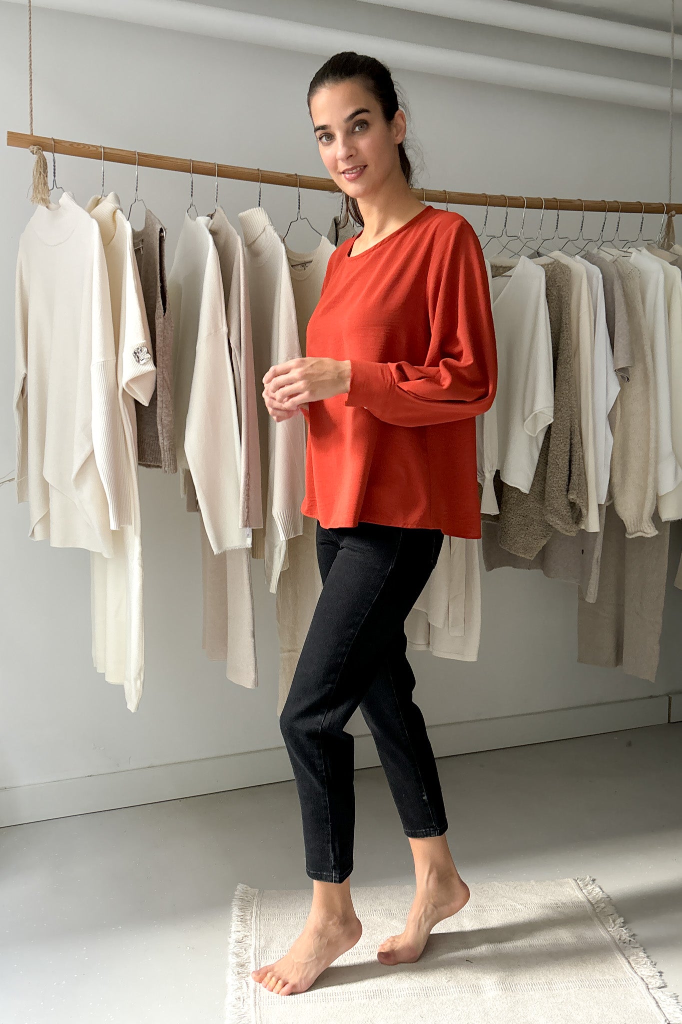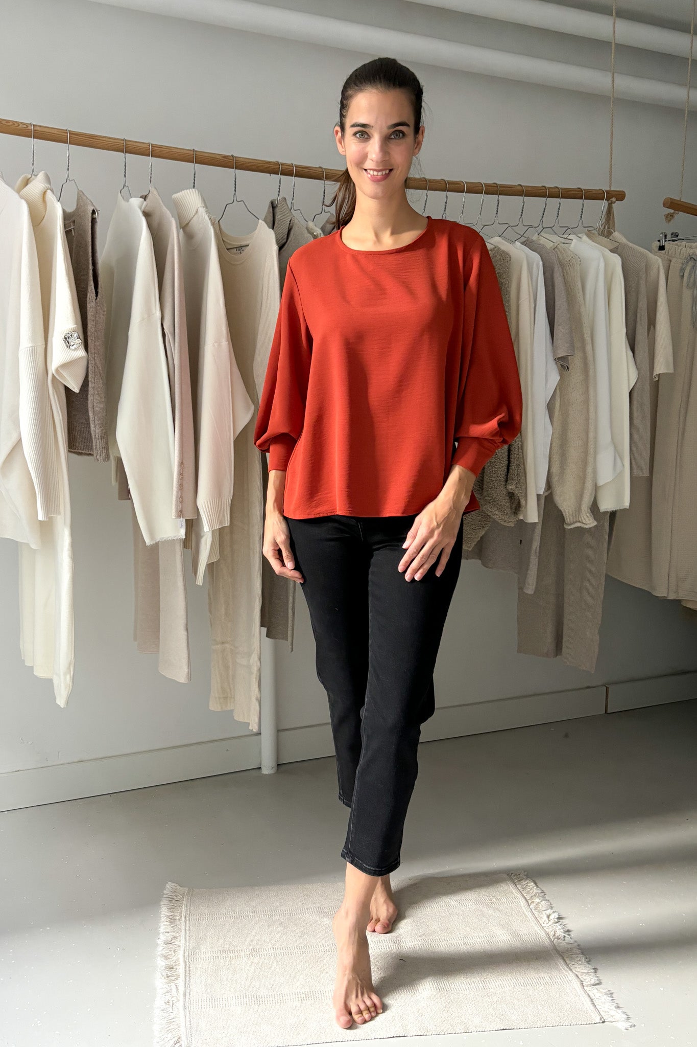 Vékony, lágy esésű anyag. Kerek nyakú, egyenes szabású blúz, melyet különleges ujjmegoldása tesz egészen egyedivé. Egyméretes, 34-38-es konfekcióméreteket fed le. Gépben 30 fokon mosható.