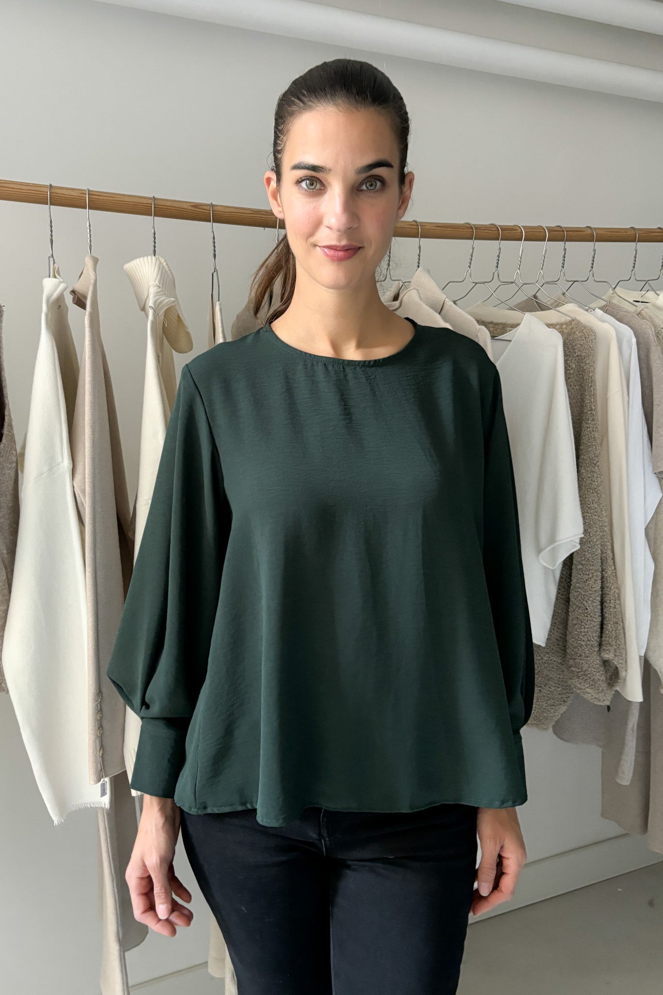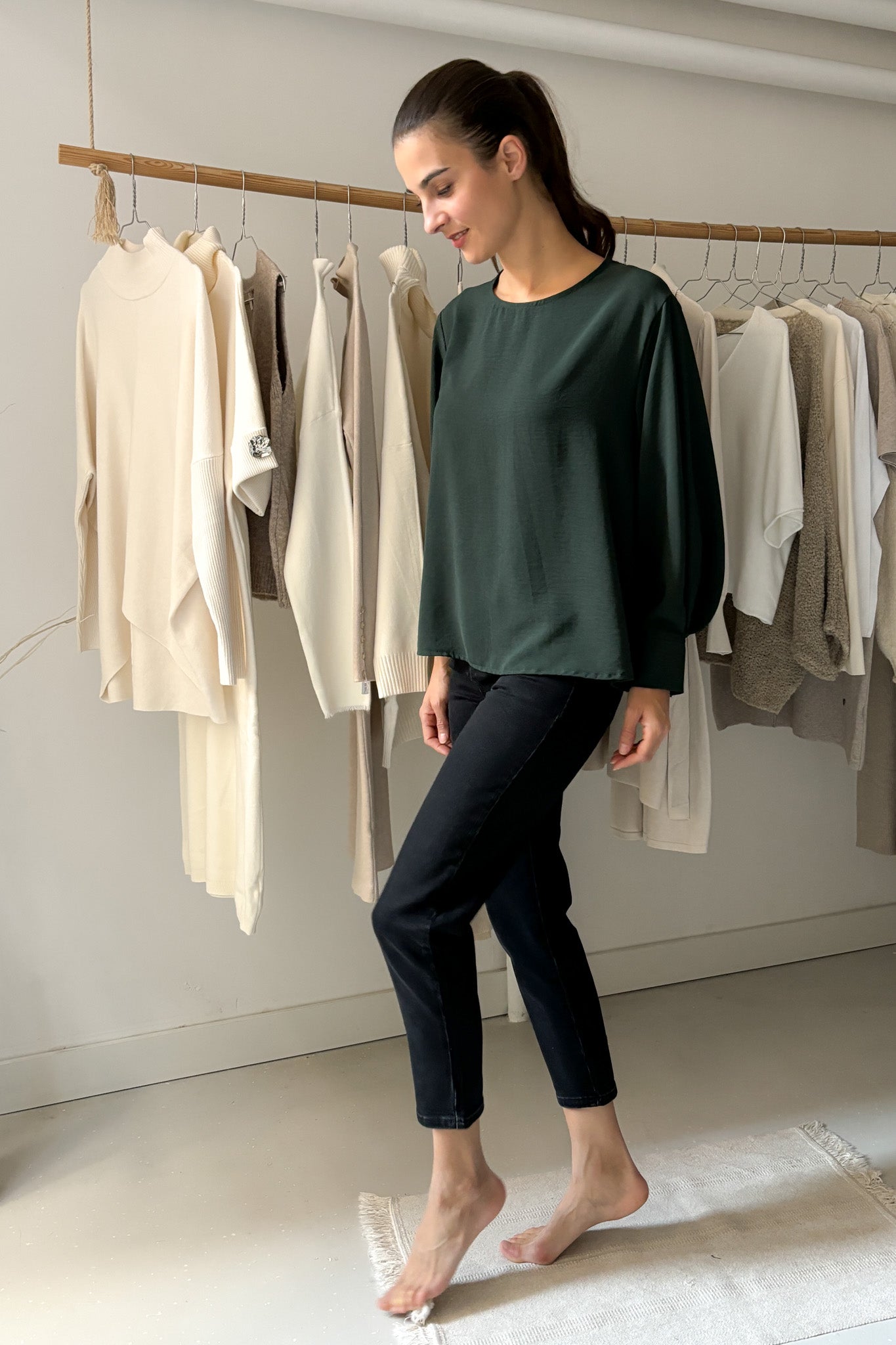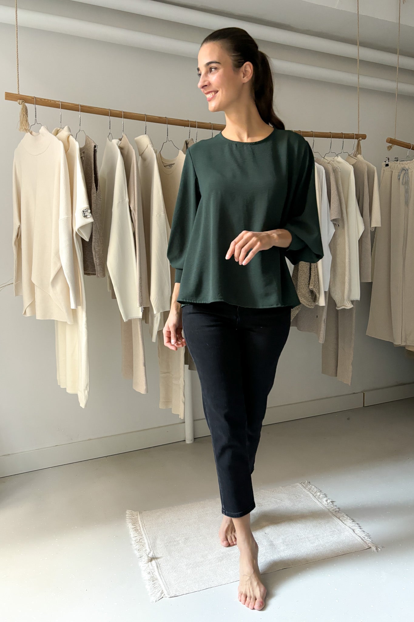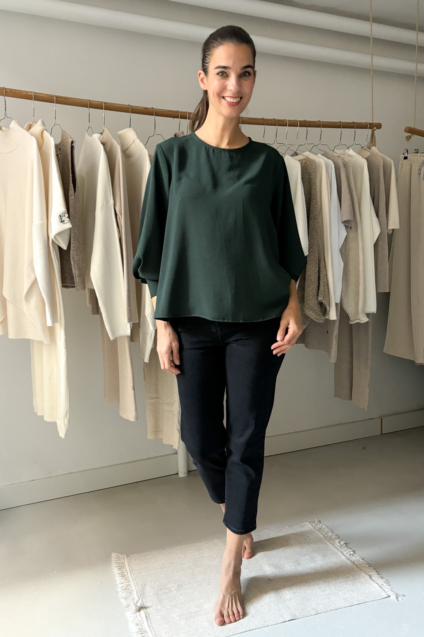 Vékony, lágy esésű anyag. Kerek nyakú, egyenes szabású blúz, melyet különleges ujjmegoldása tesz egészen egyedivé. Egyméretes, 34-38-es konfekcióméreteket fed le. Gépben 30 fokon mosható.