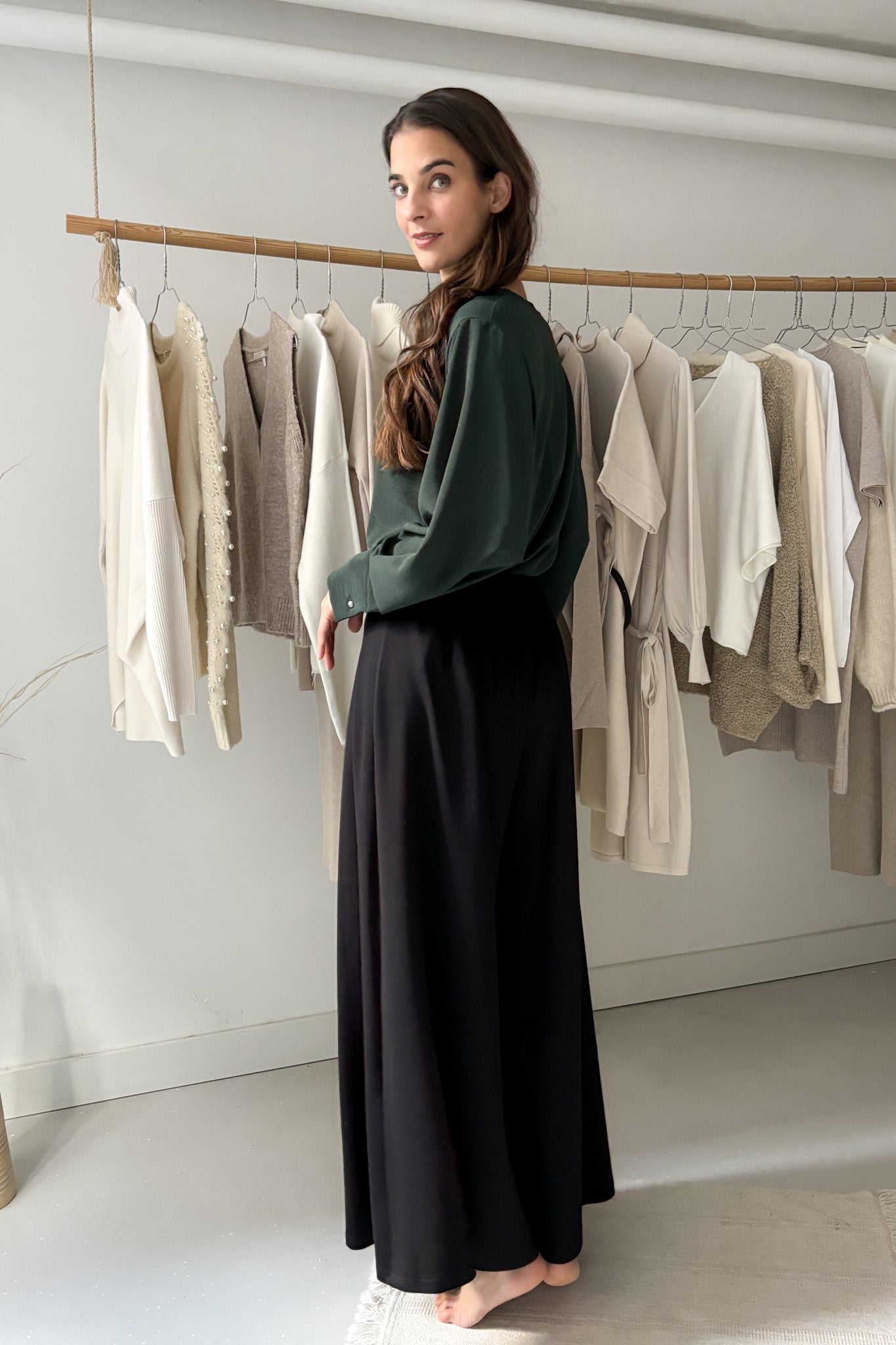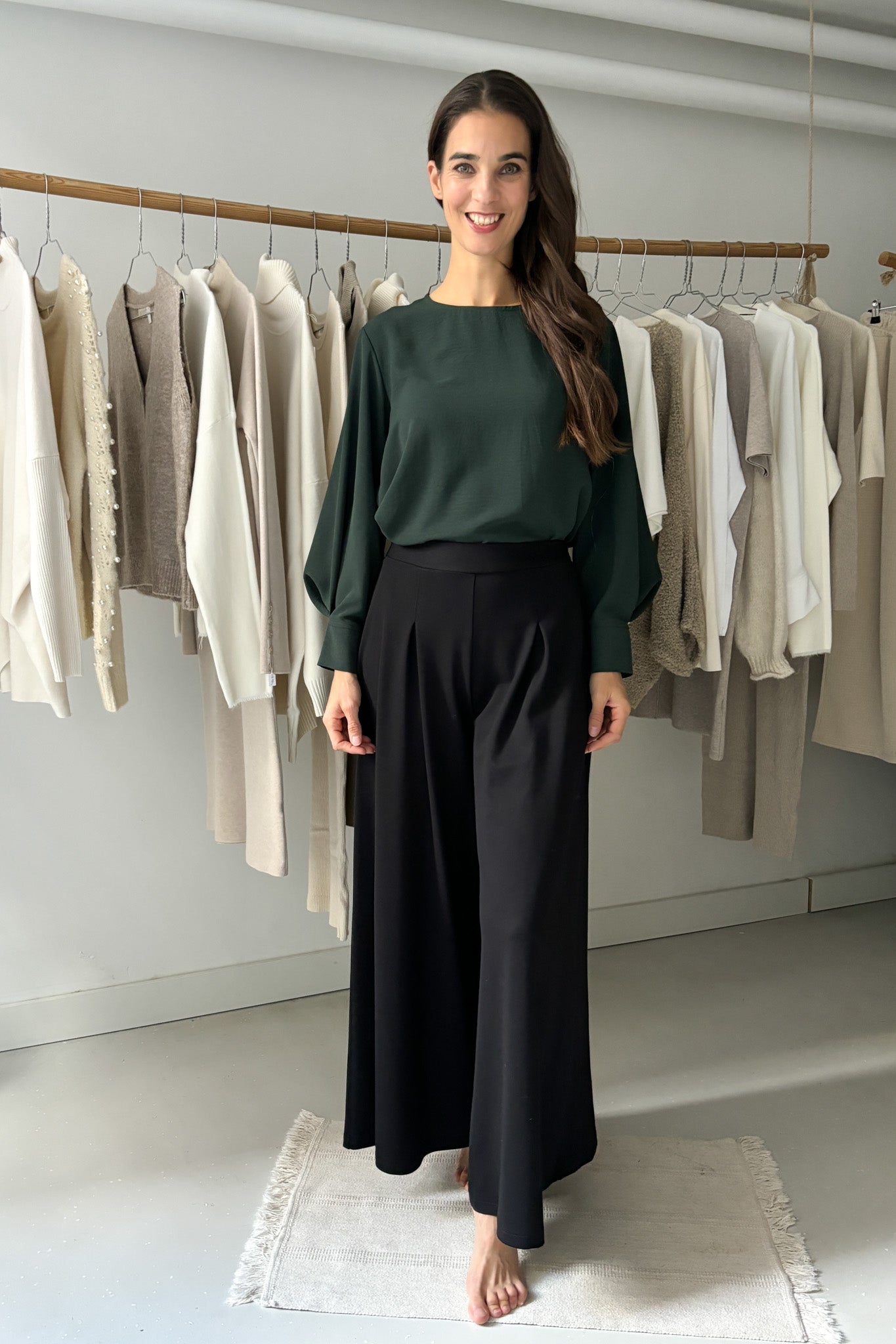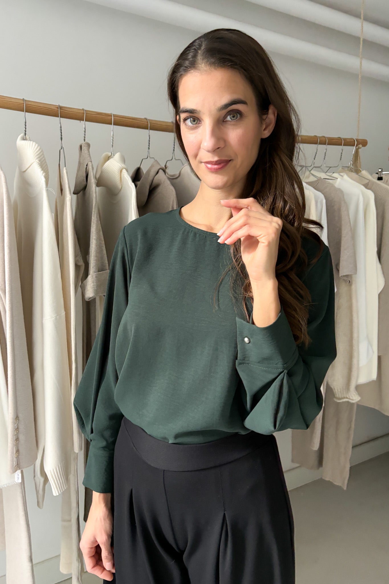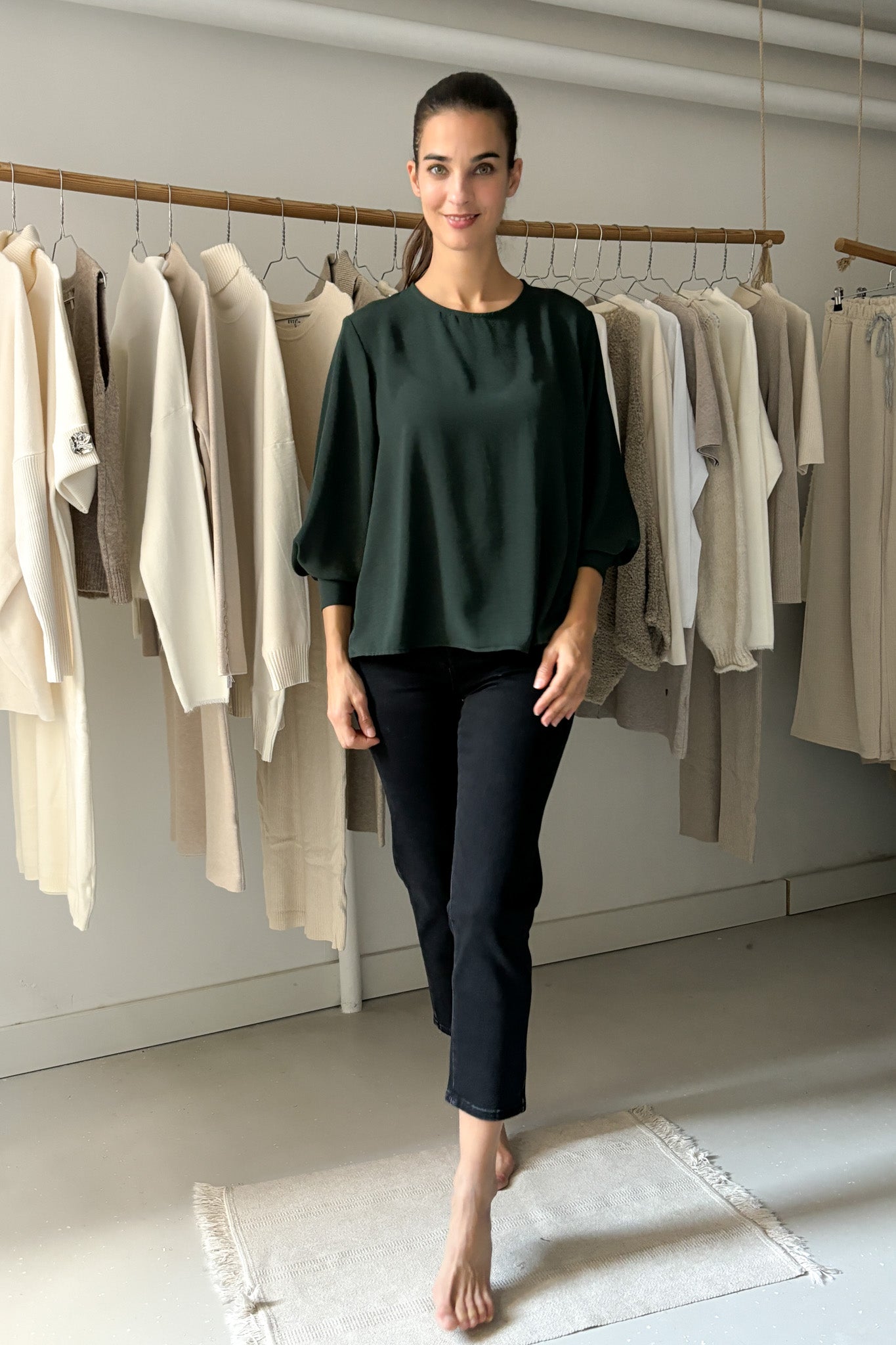 Vékony, lágy esésű anyag. Kerek nyakú, egyenes szabású blúz, melyet különleges ujjmegoldása tesz egészen egyedivé. Egyméretes, 34-38-es konfekcióméreteket fed le. Gépben 30 fokon mosható.
