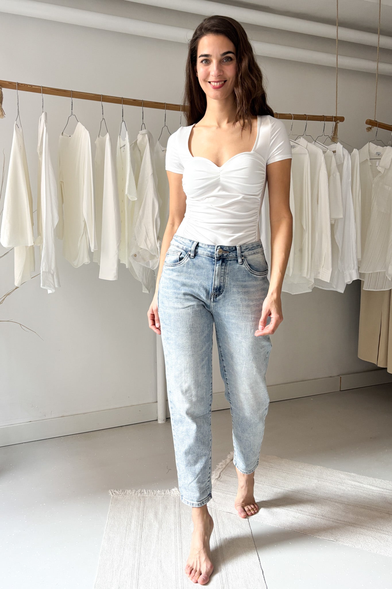 Rövidujjú fehér viszkóz body, szív alakú nyakkivágással. A mell része szivaccsal bélelt, ezért melltartó nélkül is viselhető. Alul 2 soros fehérnemű kapoccsal záródik, amely 3 méretben állítható.