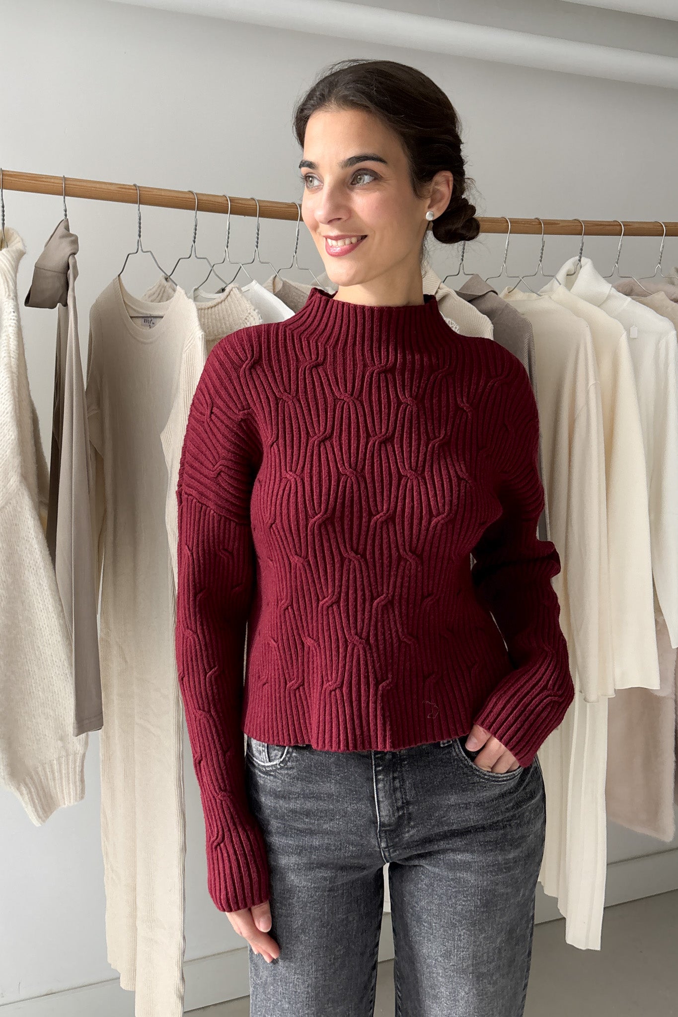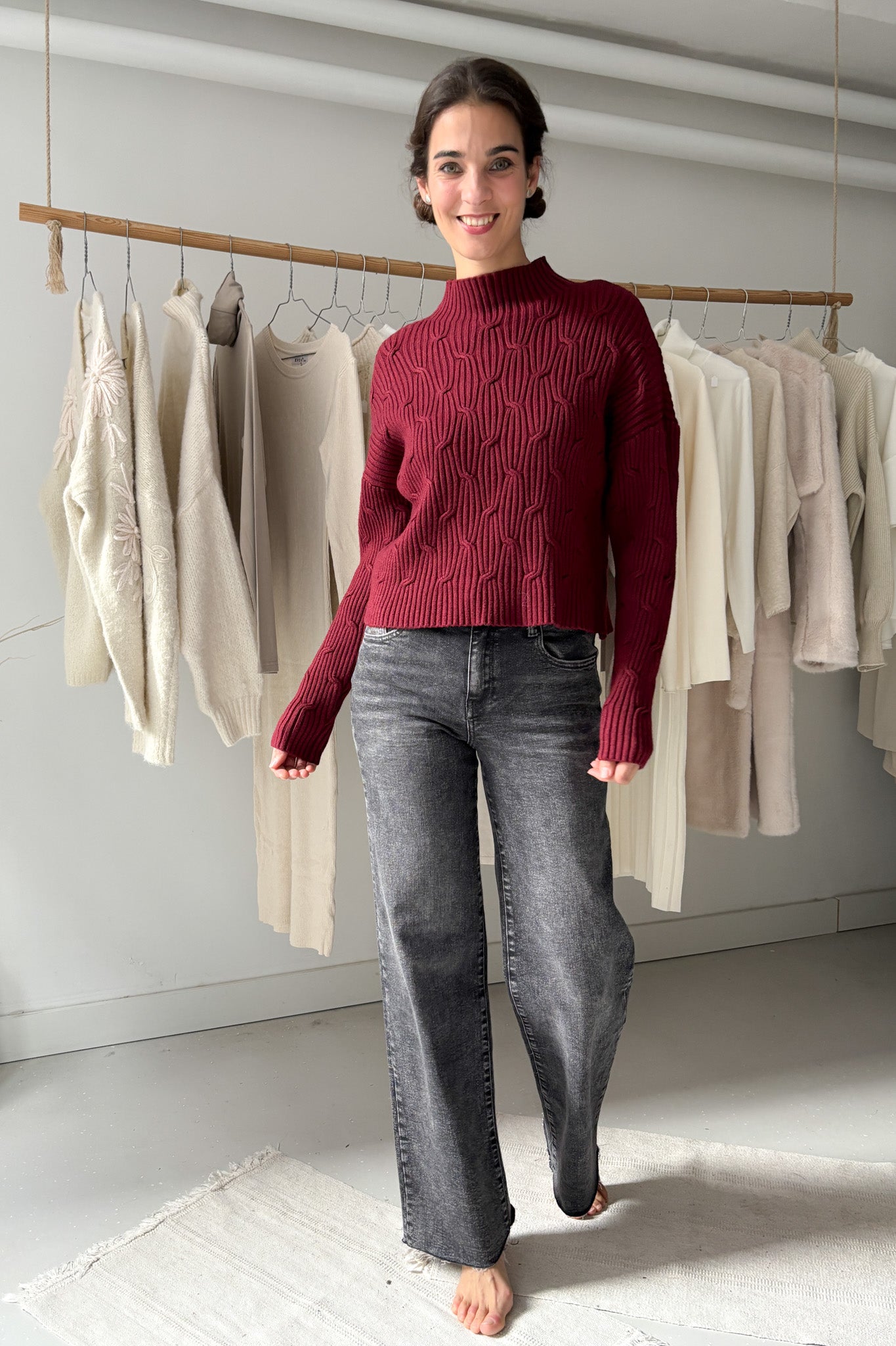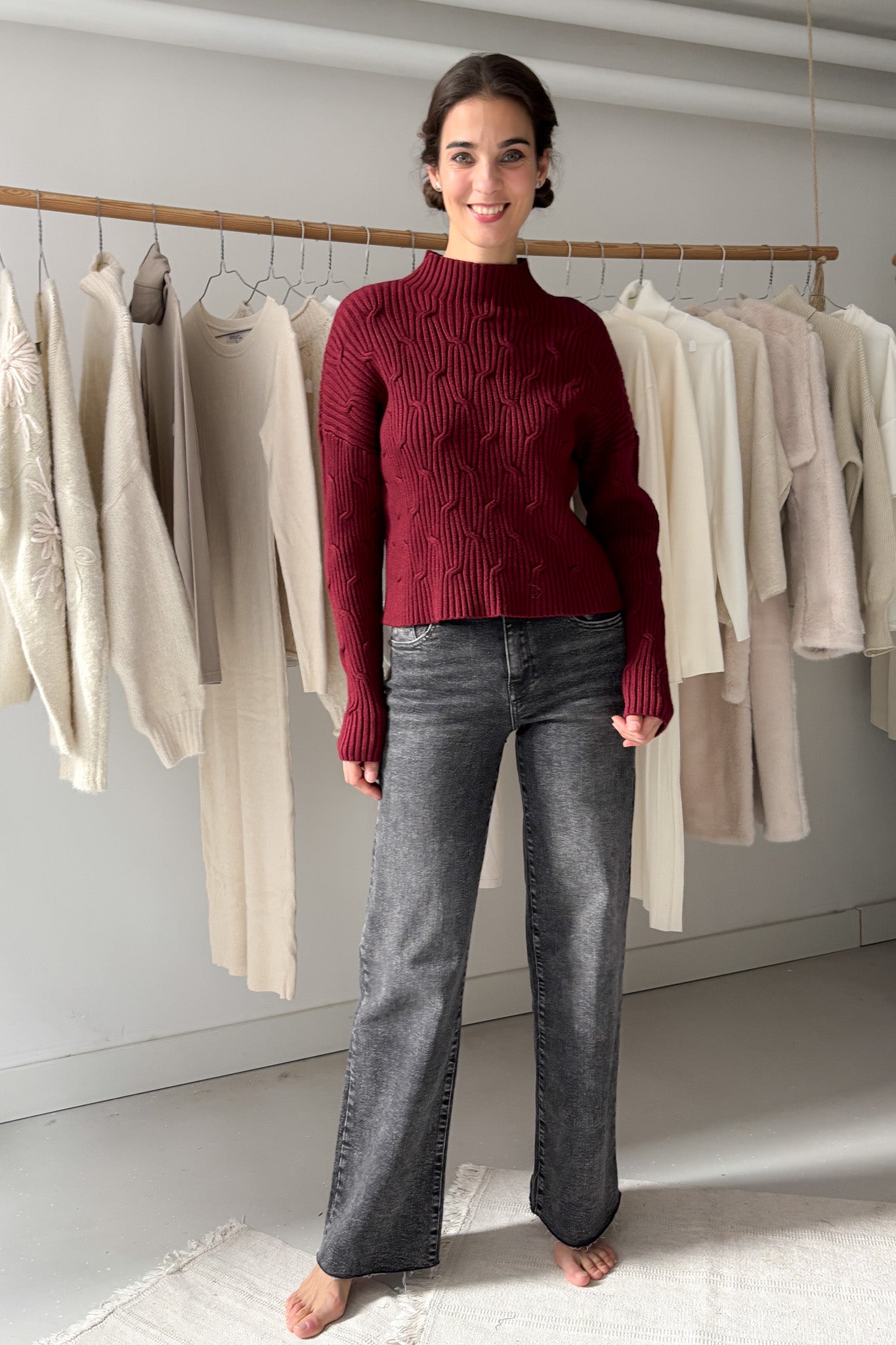 Kötött, meleg pulóver. Magasított nyakú, crop szerű fazon.