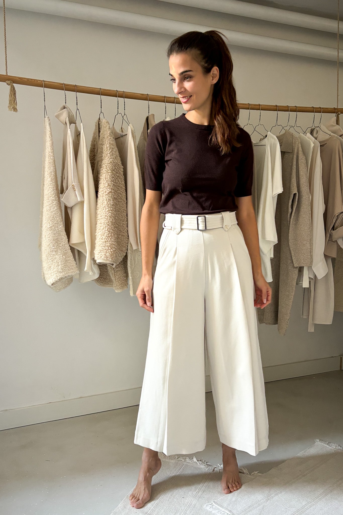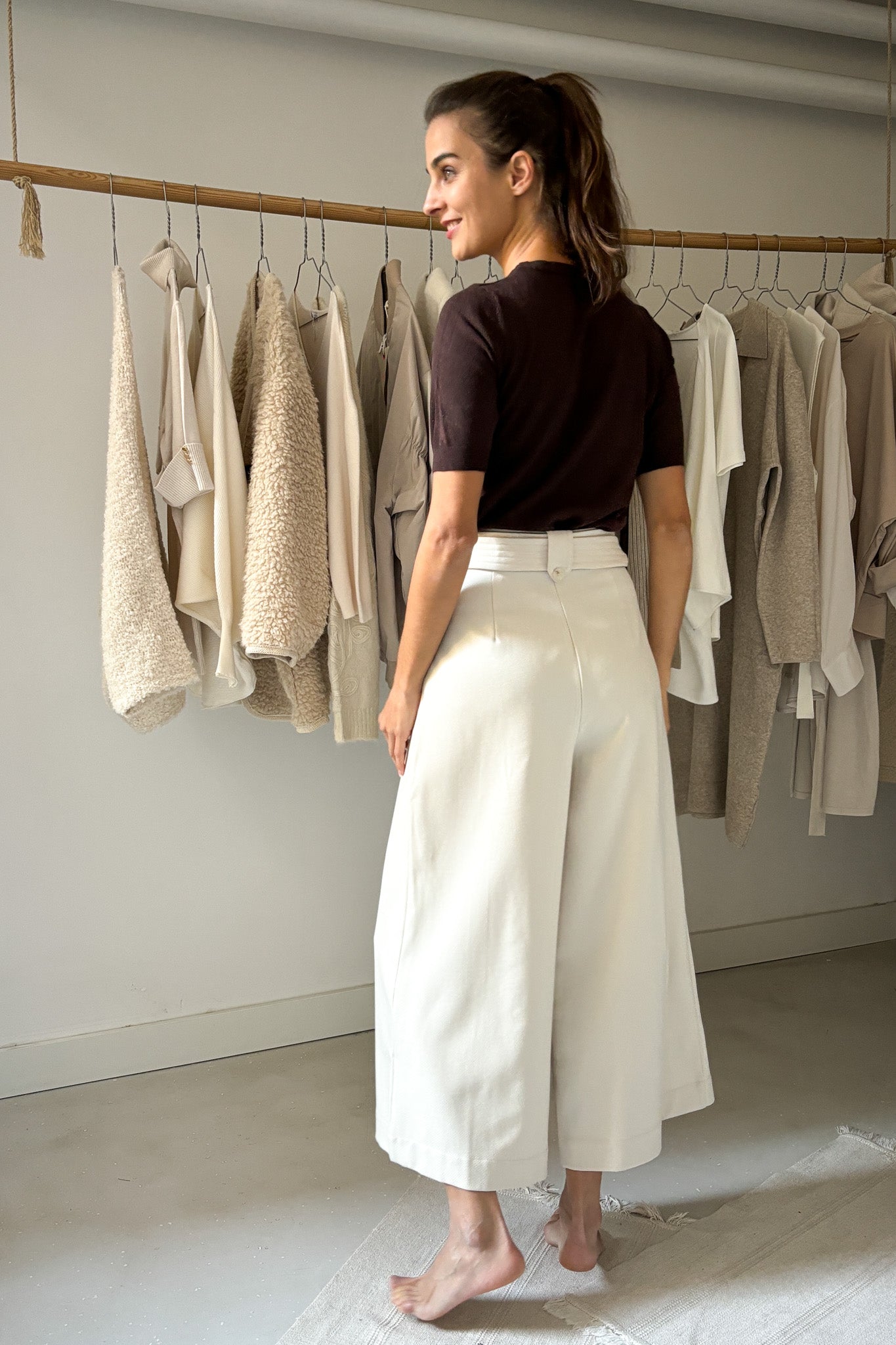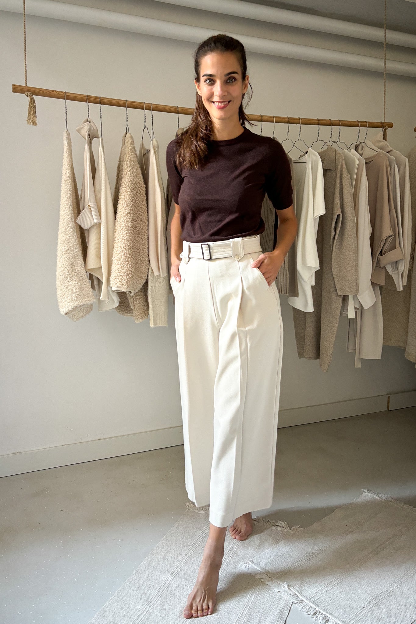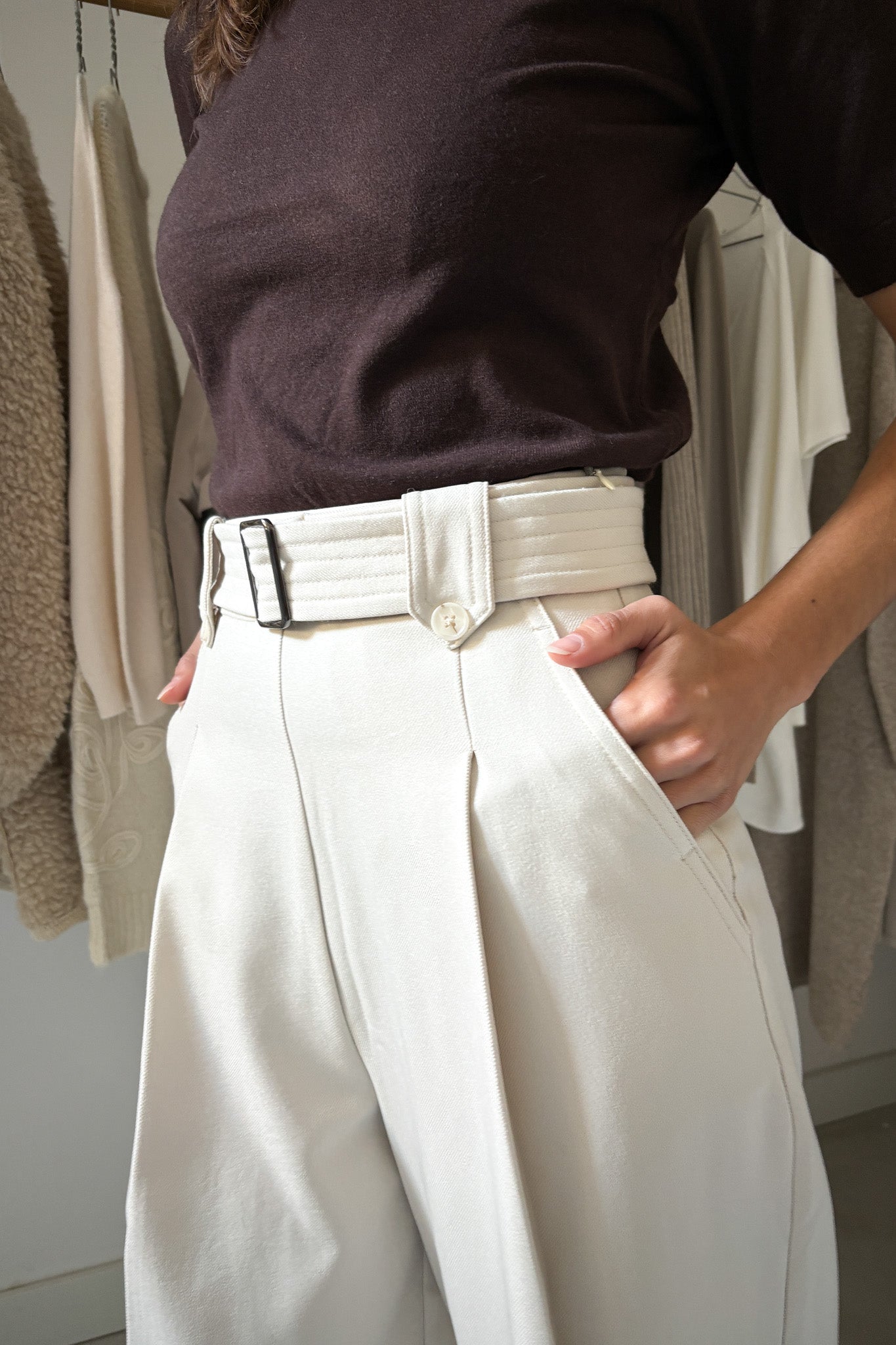 Krémszínű, bőszárú nadrág. Középen fémcsatos övvel ellátott. Hajtásos, rövidített szárú fazon. Zsebes, oldalt cipzáros.